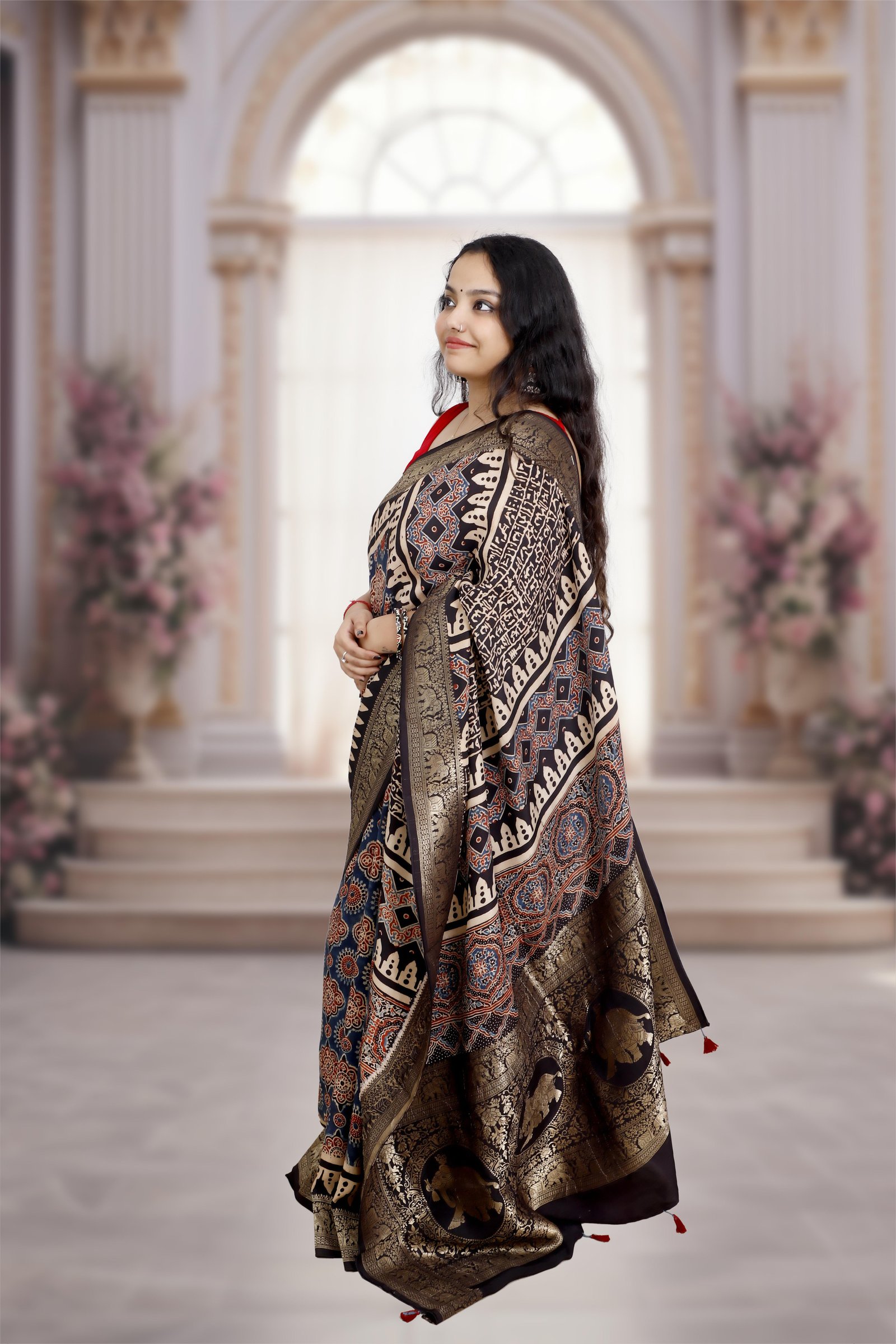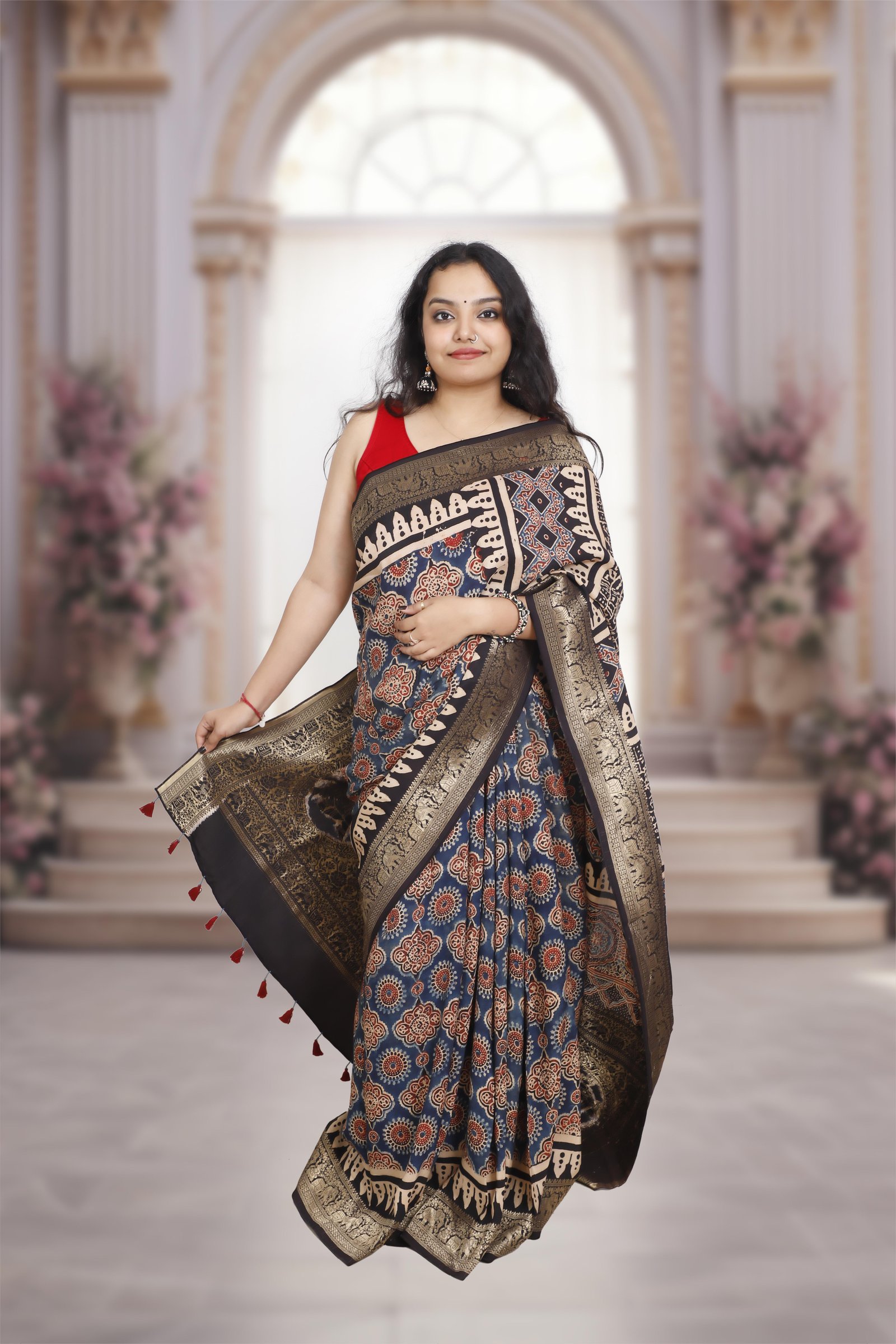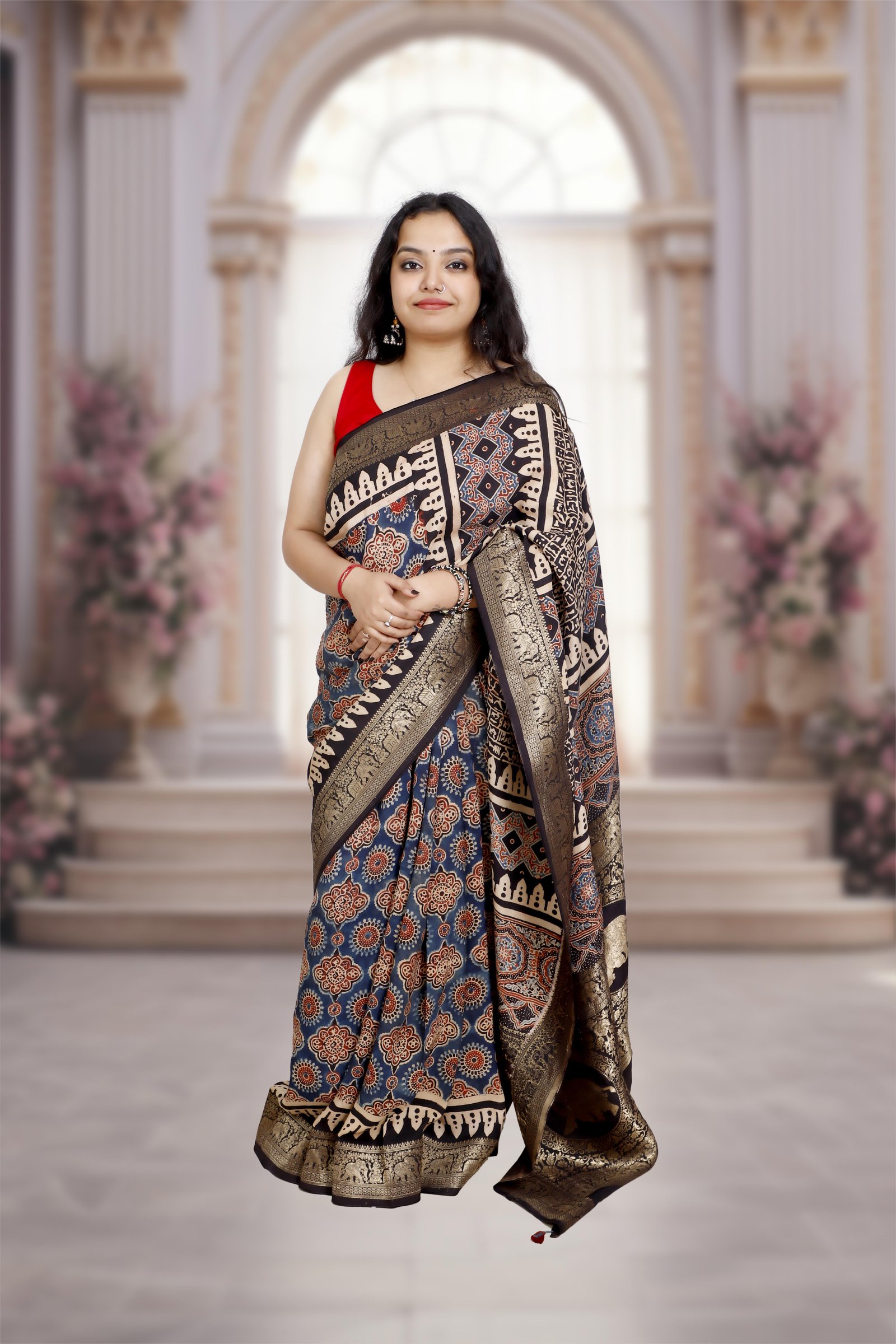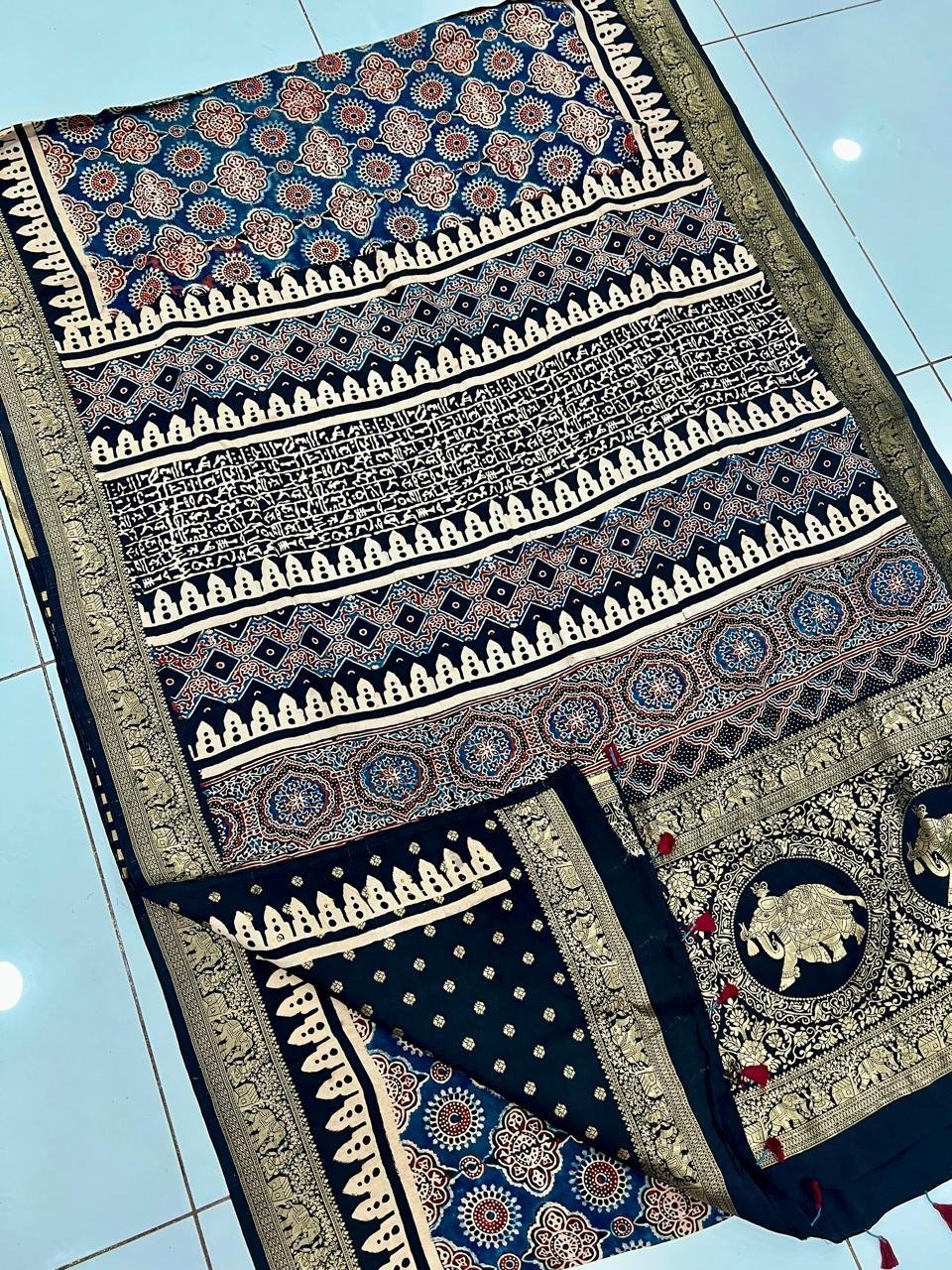 Note: Ajrakh is used using natural dye by handicraftsmen, and its sign of authenticity are small spots of the dye (sometimes) over the saree.