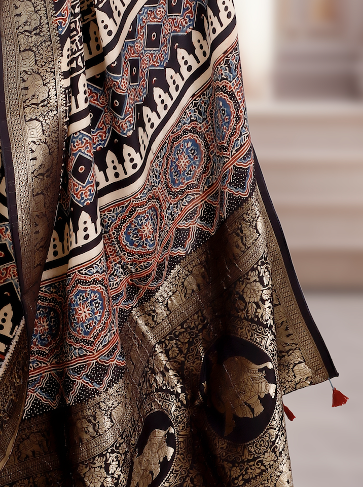 AJRAKH DOLA SILK SAREE (BLUE-BLACK) WITH NAKSHI ZARI PALLU