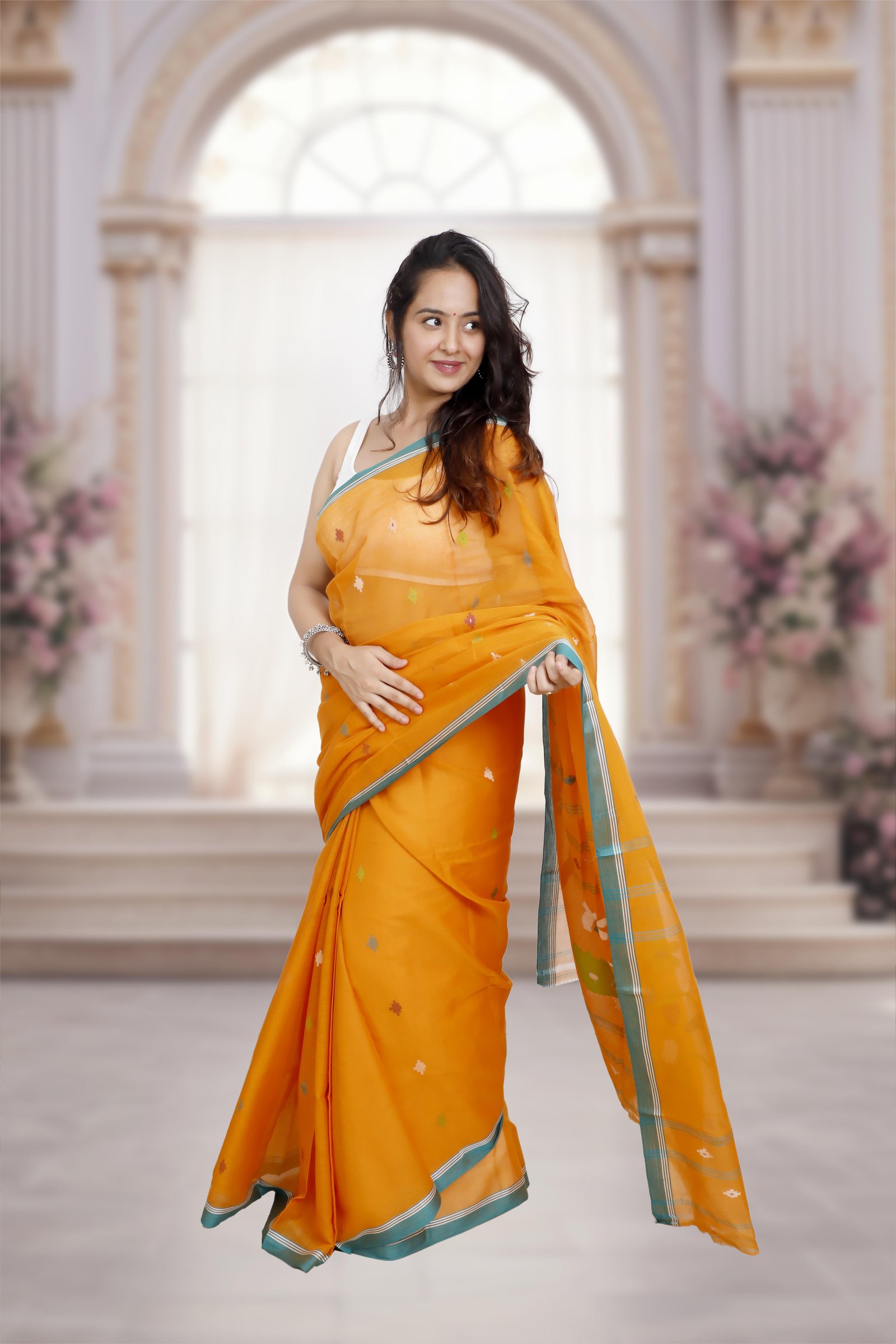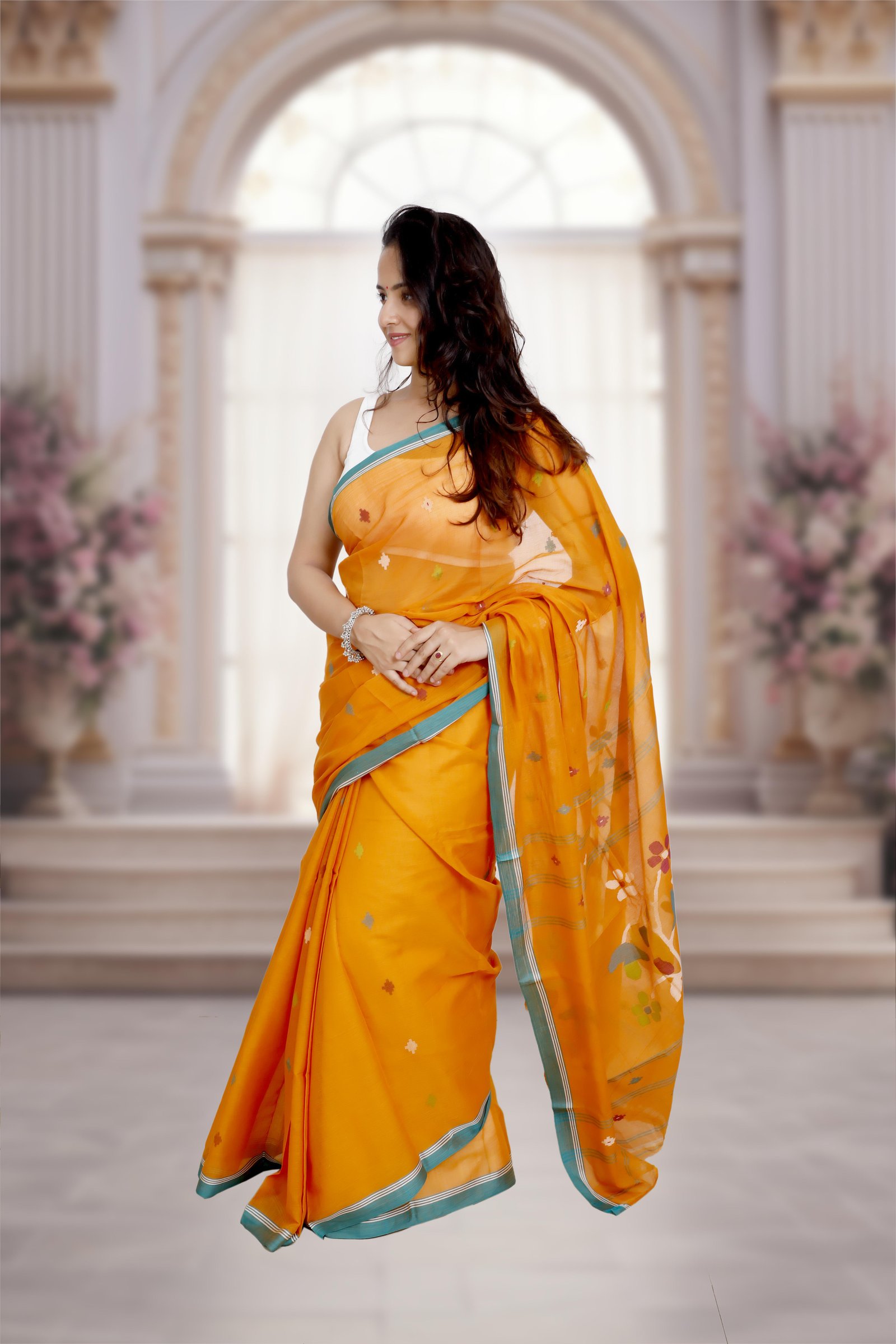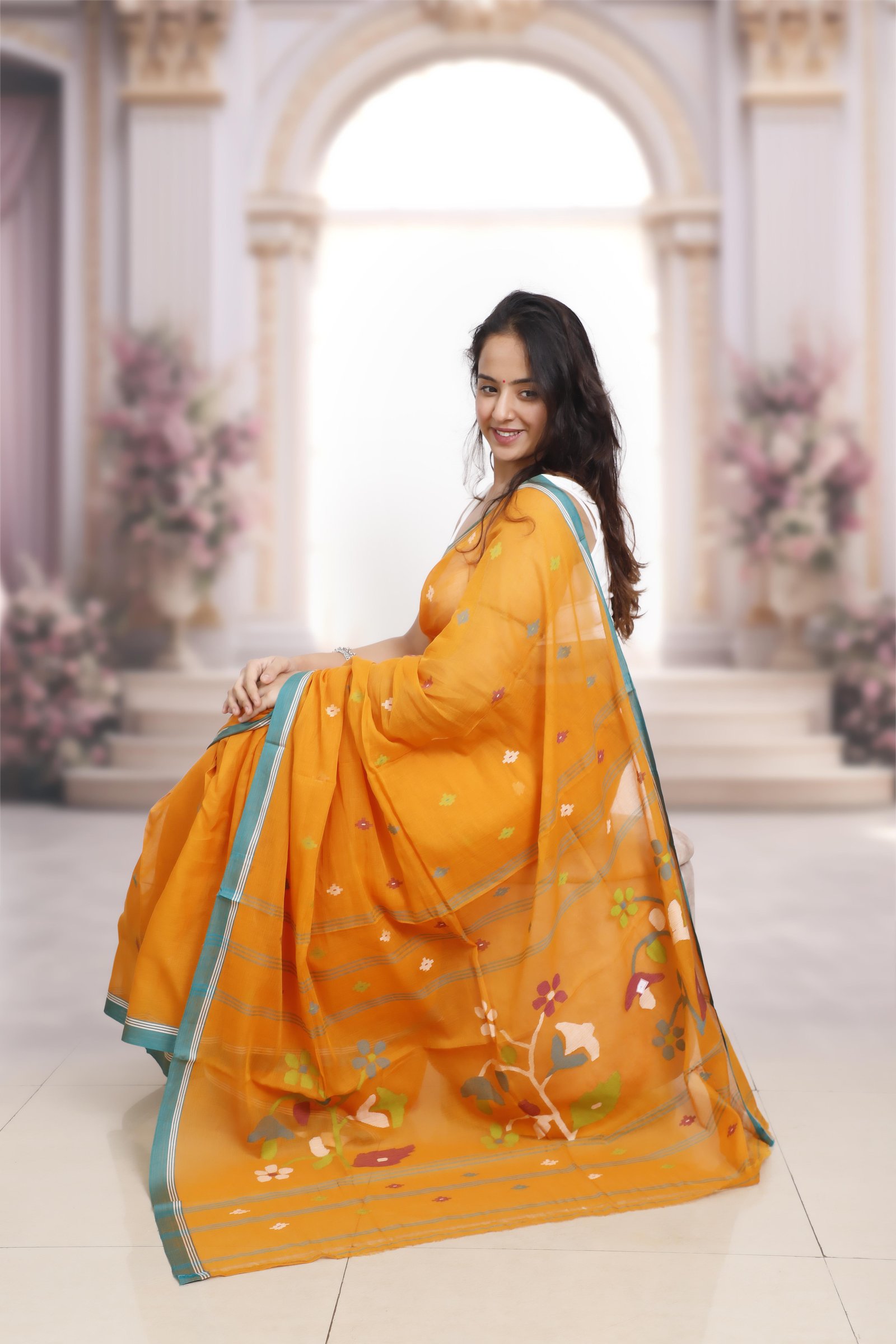 A masterpiece of Bengal’s weaving tradition, this saree is crafted in soft handwoven cotton from Phulia. Adorned with the intricate Jamdani weave, it comes in a vibrant Orange hue, offering both elegance and comfort. A timeless blend of heritage and grace for everyday charm or festive wear.