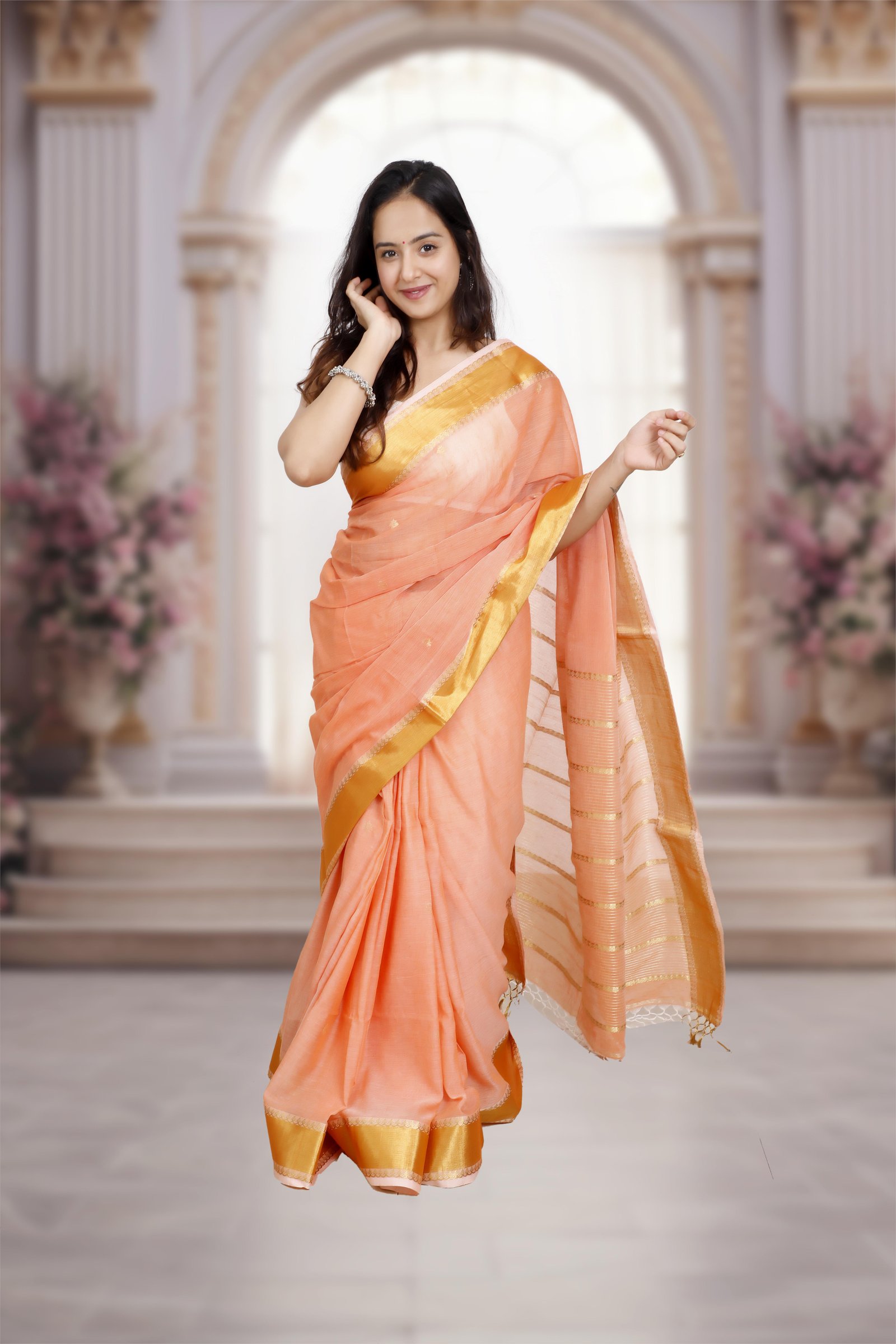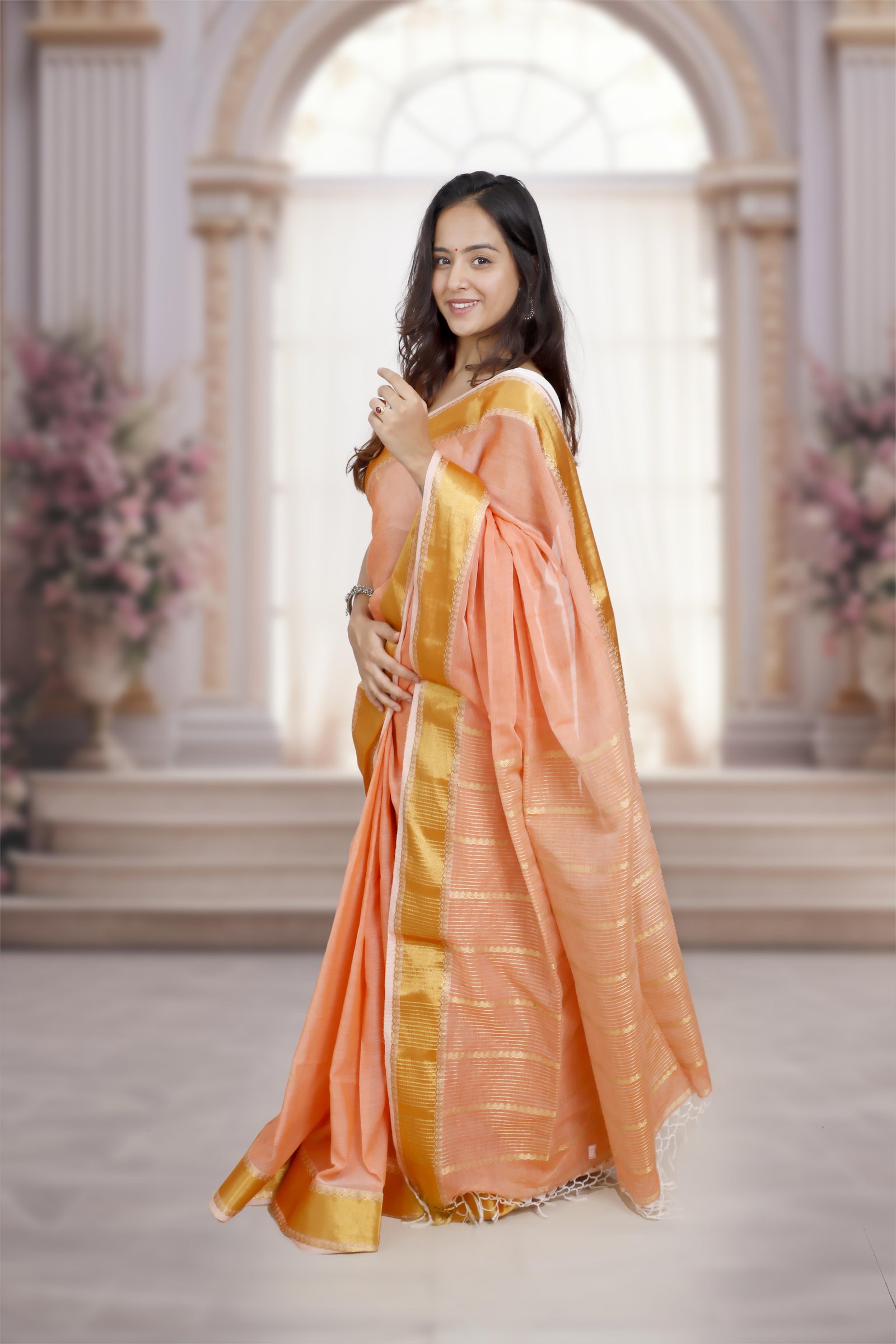 Handwoven Cotton Saree with Gold Zari Border – Peach