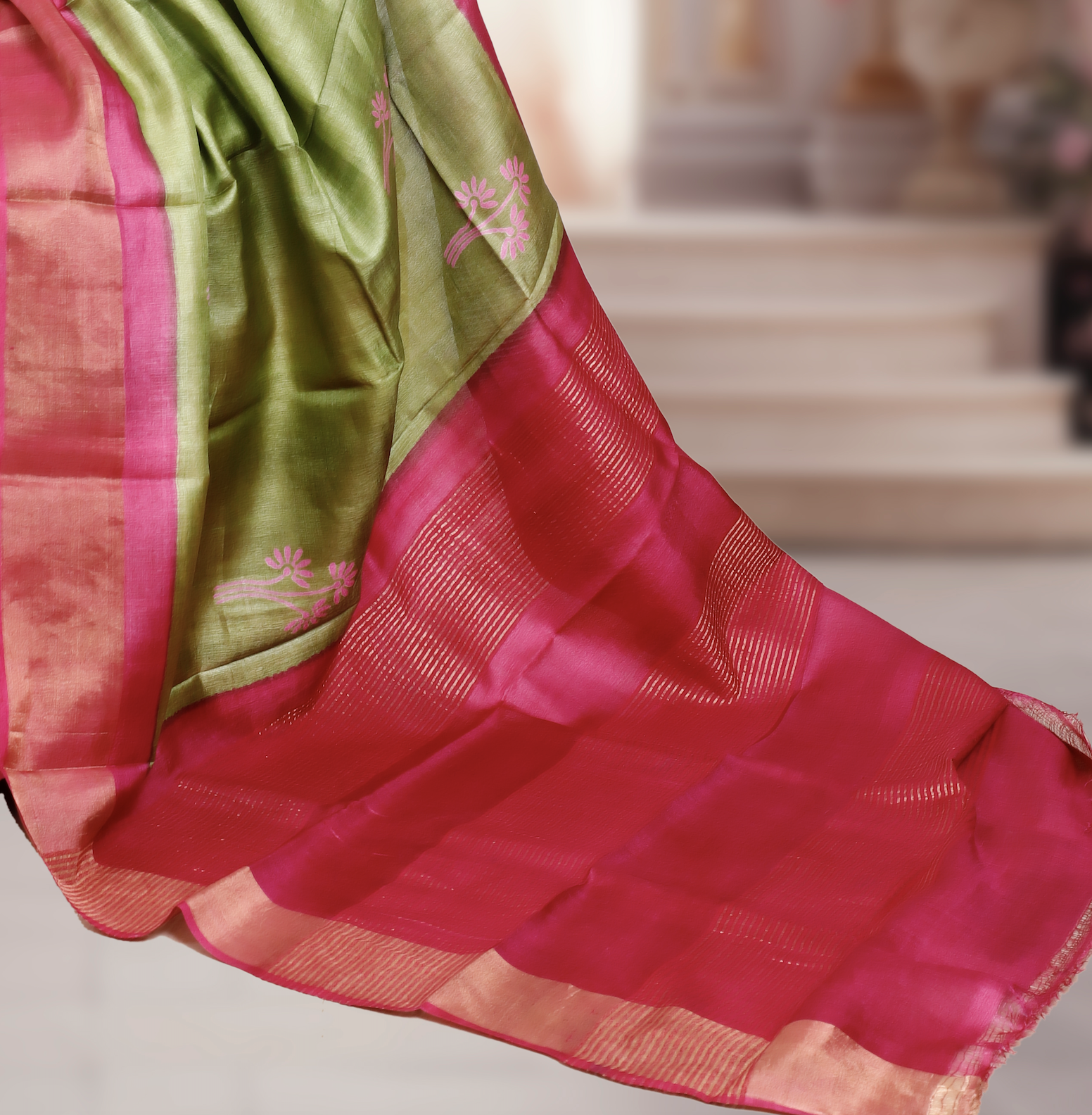 Bishnupuri Gachi Tusser Silk Saree with Hand-Painted Design – Green & Pink