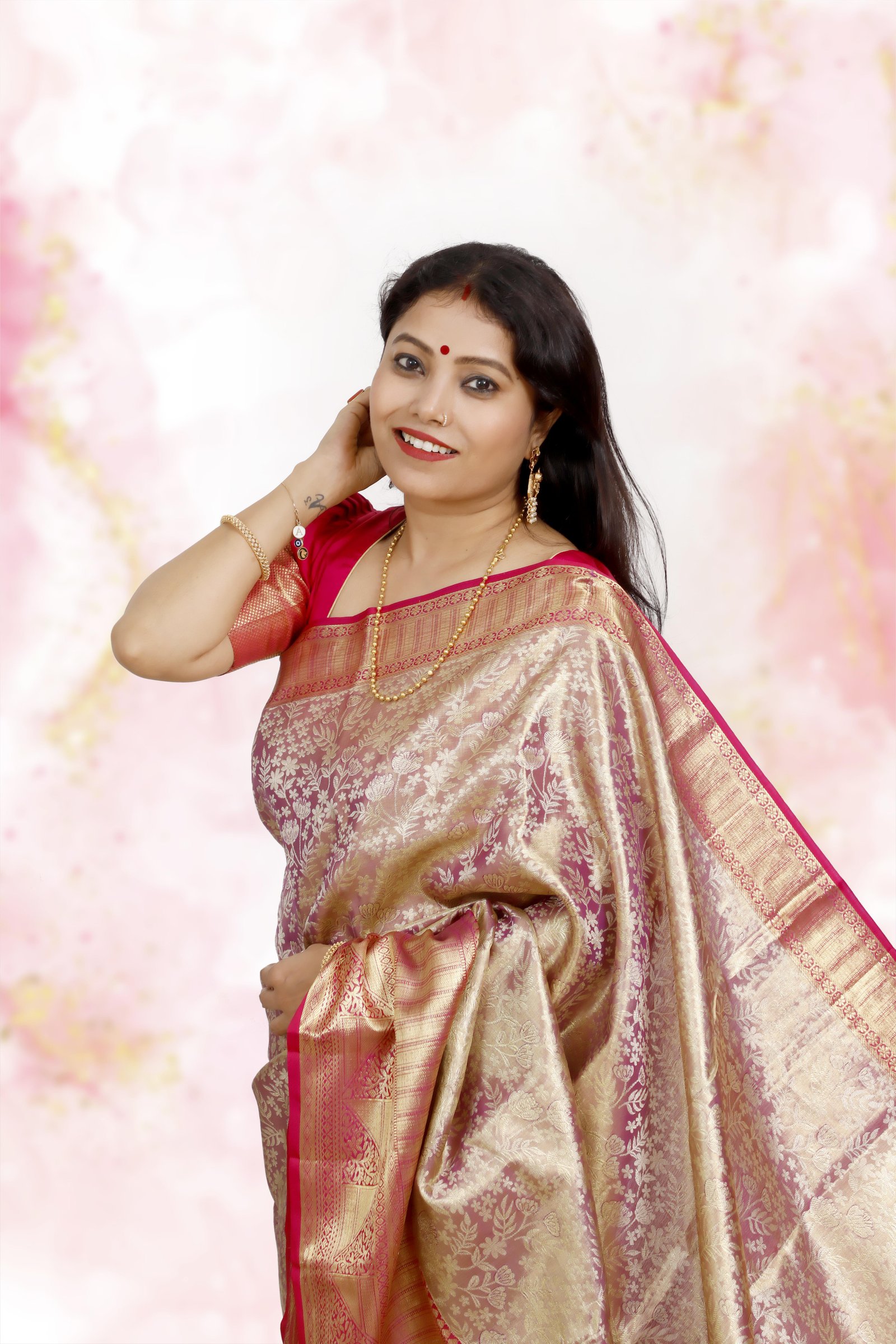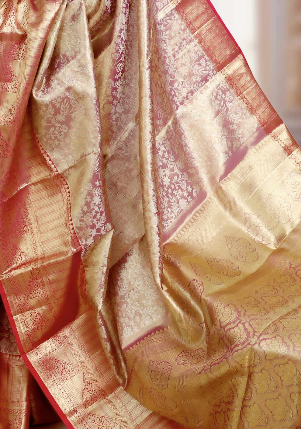 An epitome of grandeur, this saree is handwoven in pure mulberry silk with exquisite brocade weaving, where rich zari threads are intricately woven into the fabric to create raised, ornamental patterns that shimmer with elegance. The dual tone of gold and pink enhances its regal charm, making it a masterpiece of timeless beauty.Ideal for weddings, festive occasions, and heirloom collections, this saree carries the Silk Mark certification, assuring authenticity and purity of silk.