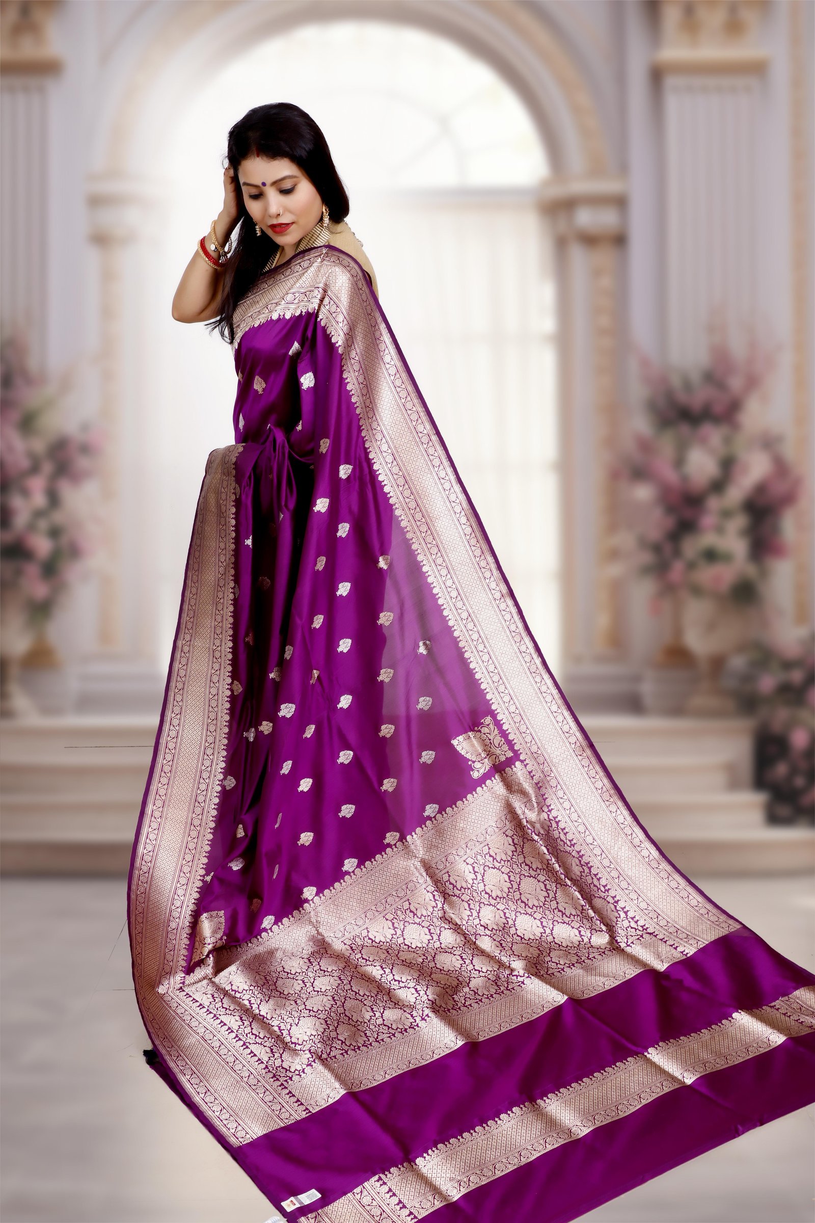 Crafted from pure handwoven Katan Mulberry silk, this saree is adorned with intricate gold and silver Kadwa weaving, a hallmark of Banarasi artistry. The deep purple base enhances its regal elegance, making it an heirloom-worthy drape for weddings, festive occasions, and grand celebrations. Each saree is Silk Mark certified and carries the Handloom Mark, ensuring authenticity, heritage, and premium craftsmanship.