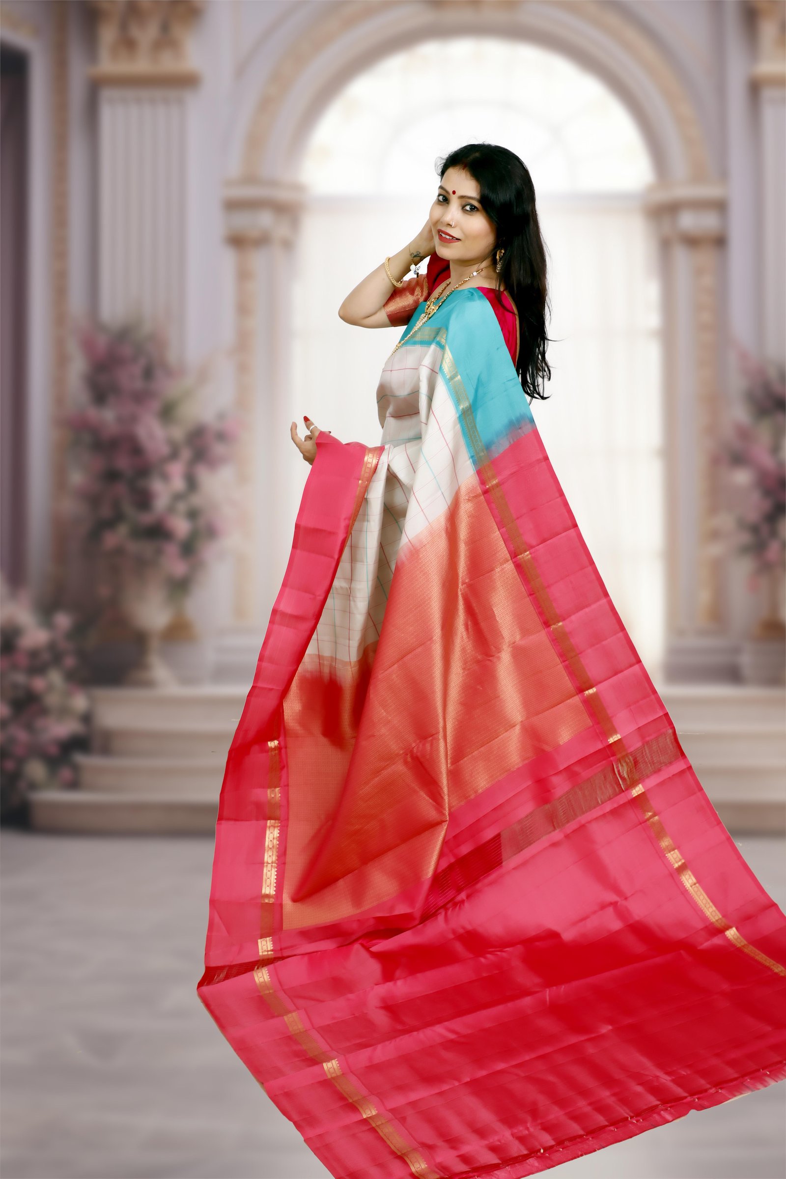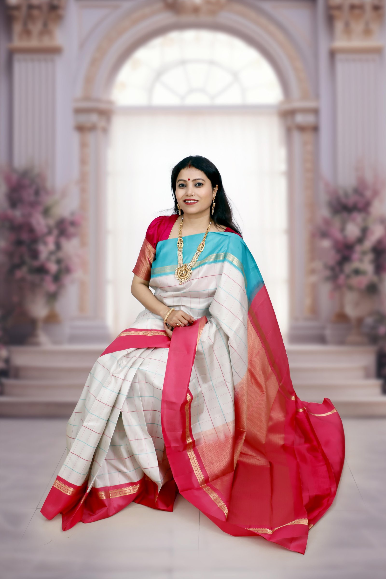 Graceful and timeless, this saree is handwoven in pure mulberry silk, the hallmark of authentic Kanchipuram weaving. The soothing white base is adorned with delicate checks and complemented by a soft light blue and light pink border and pallu, lending it a serene yet elegant appeal. Ideal for weddings, festive occasions, and heirloom collections, this saree comes Silk Mark certified, assuring purity and authenticity