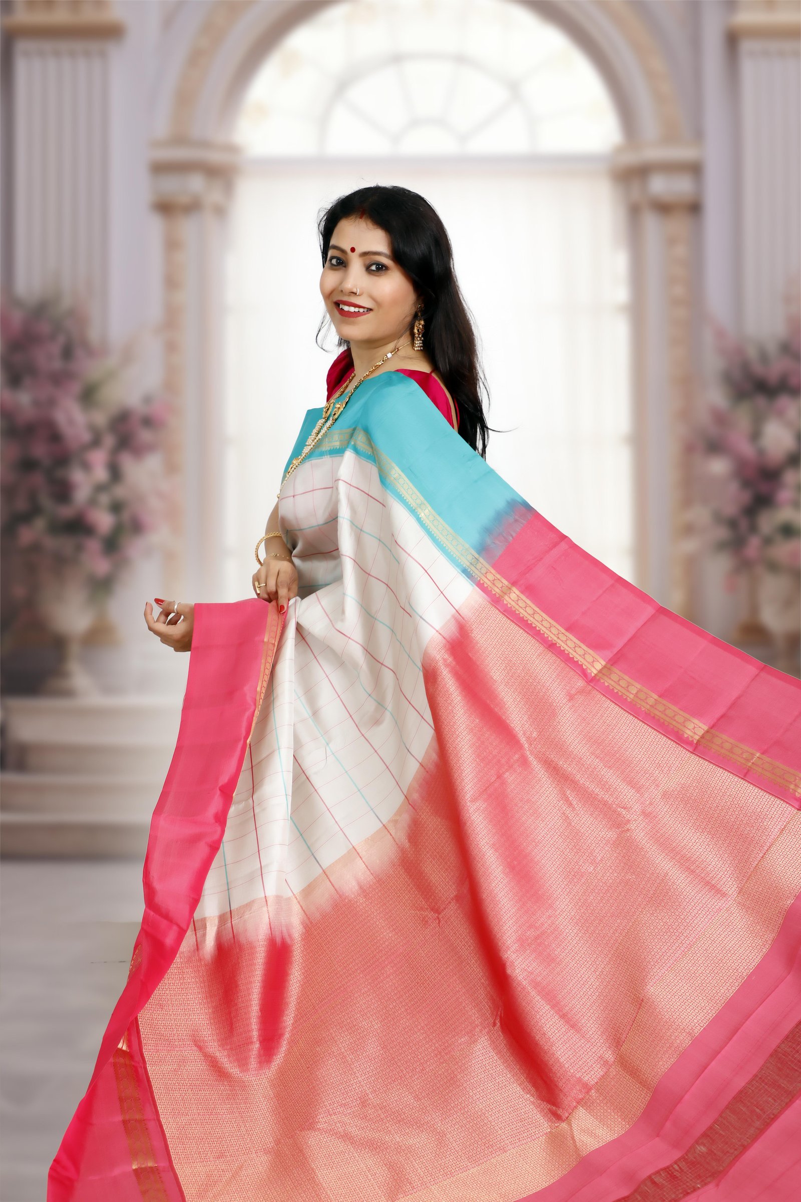 Graceful and timeless, this saree is handwoven in pure mulberry silk, the hallmark of authentic Kanchipuram weaving. The soothing white base is adorned with delicate checks and complemented by a soft light blue and light pink border and pallu, lending it a serene yet elegant appeal. Ideal for weddings, festive occasions, and heirloom collections, this saree comes Silk Mark certified, assuring purity and authenticity