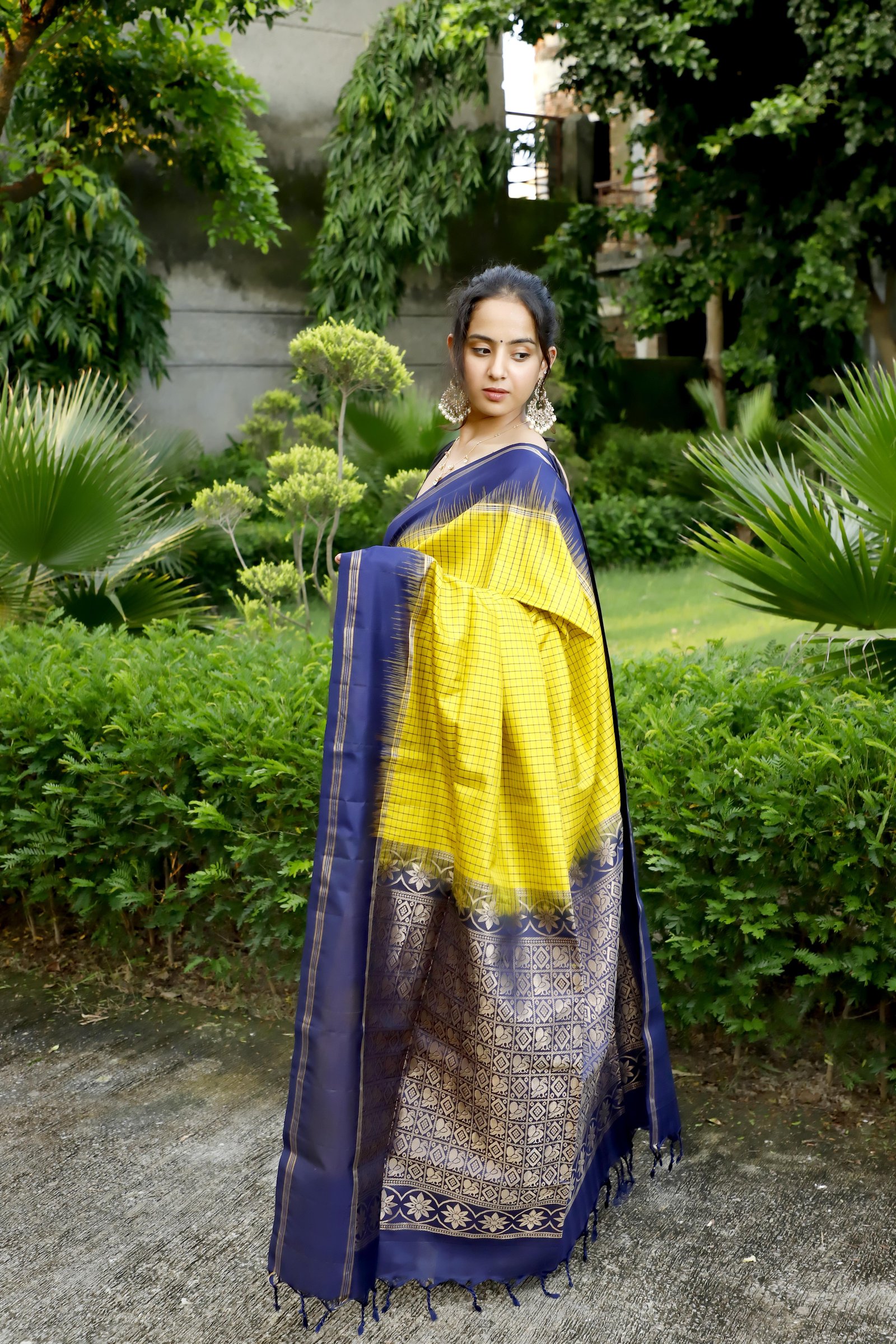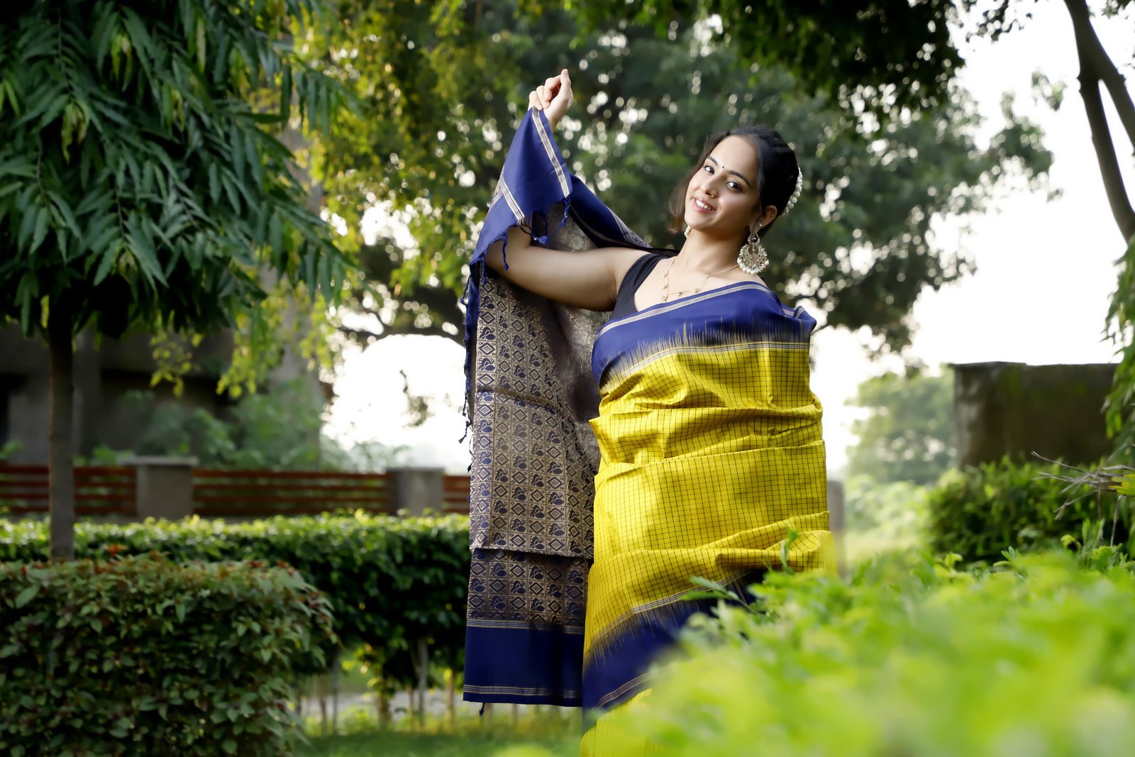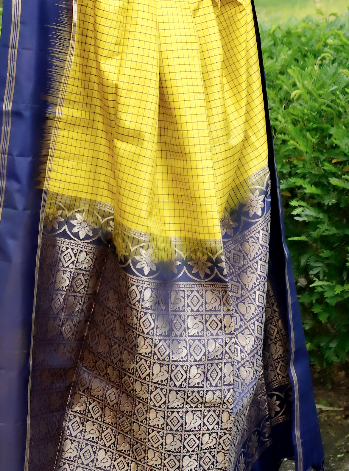 A celebration of South Indian heritage, this saree is woven in pure mulberry silk, featuring a vibrant yellow base contrasted with a rich dark blue border and pallu. Renowned for its lustrous texture and durable weave, it is perfect for weddings, festive occasions, and special celebrations. Each saree is Silk Mark certified, ensuring authenticity, premium quality, and traditional craftsmanship.