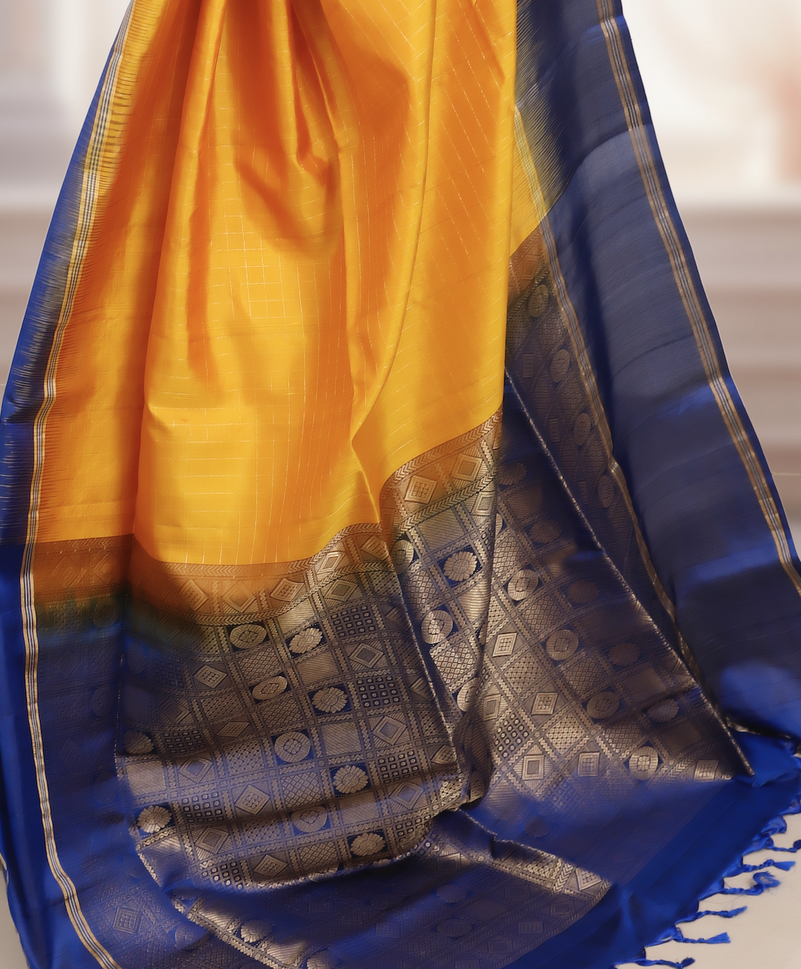 An elegant Kanchipuram classic, this saree is woven in pure handwoven silk, featuring a bright yellow base contrasted with a deep dark blue border. The rich golden zari detailing on the border and pallu adds a regal touch, making it perfect for weddings, festive occasions, and heirloom collections. Certified with the Silk Mark, it assures authenticity and the timeless craftsmanship of Kanchipuram weavers.