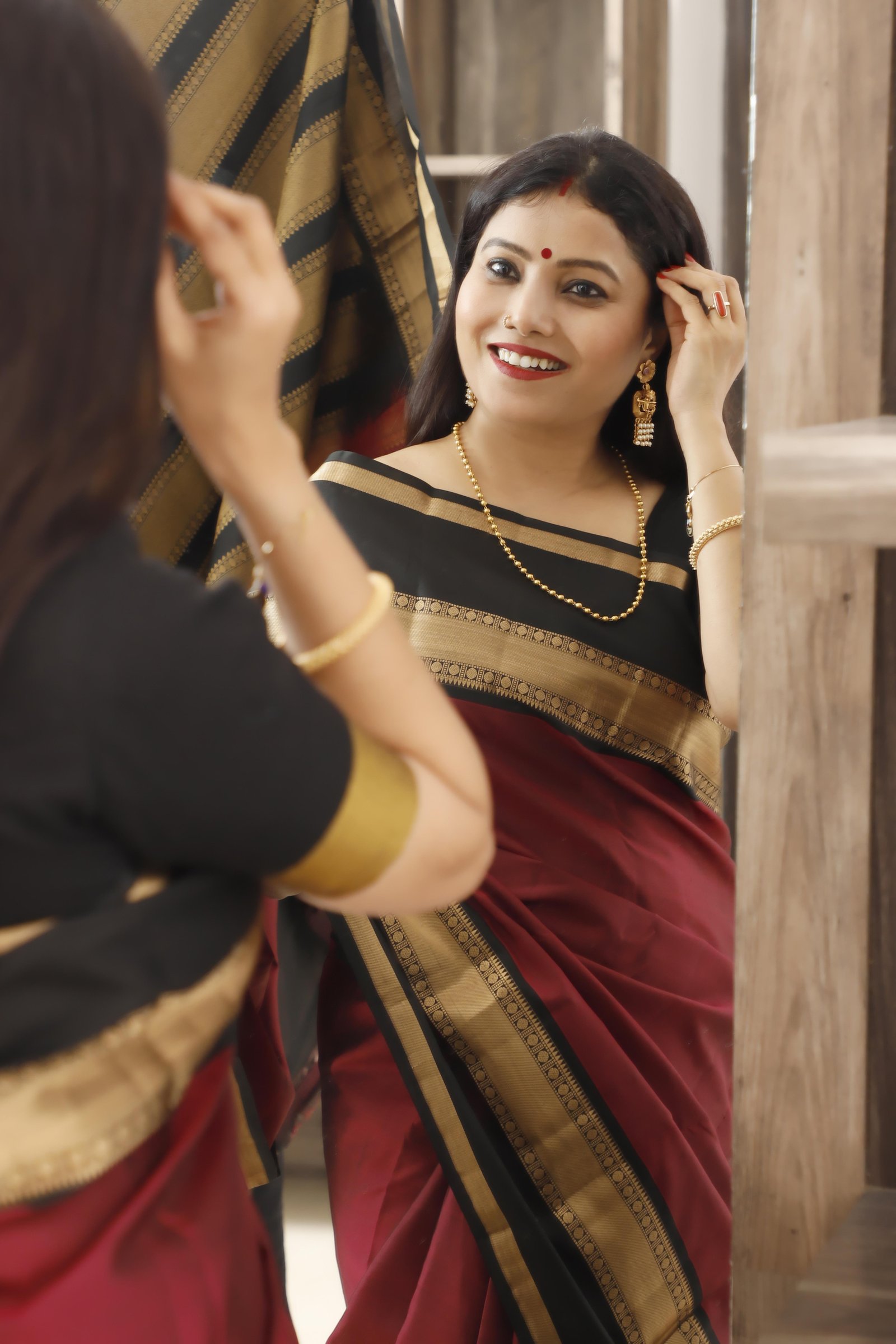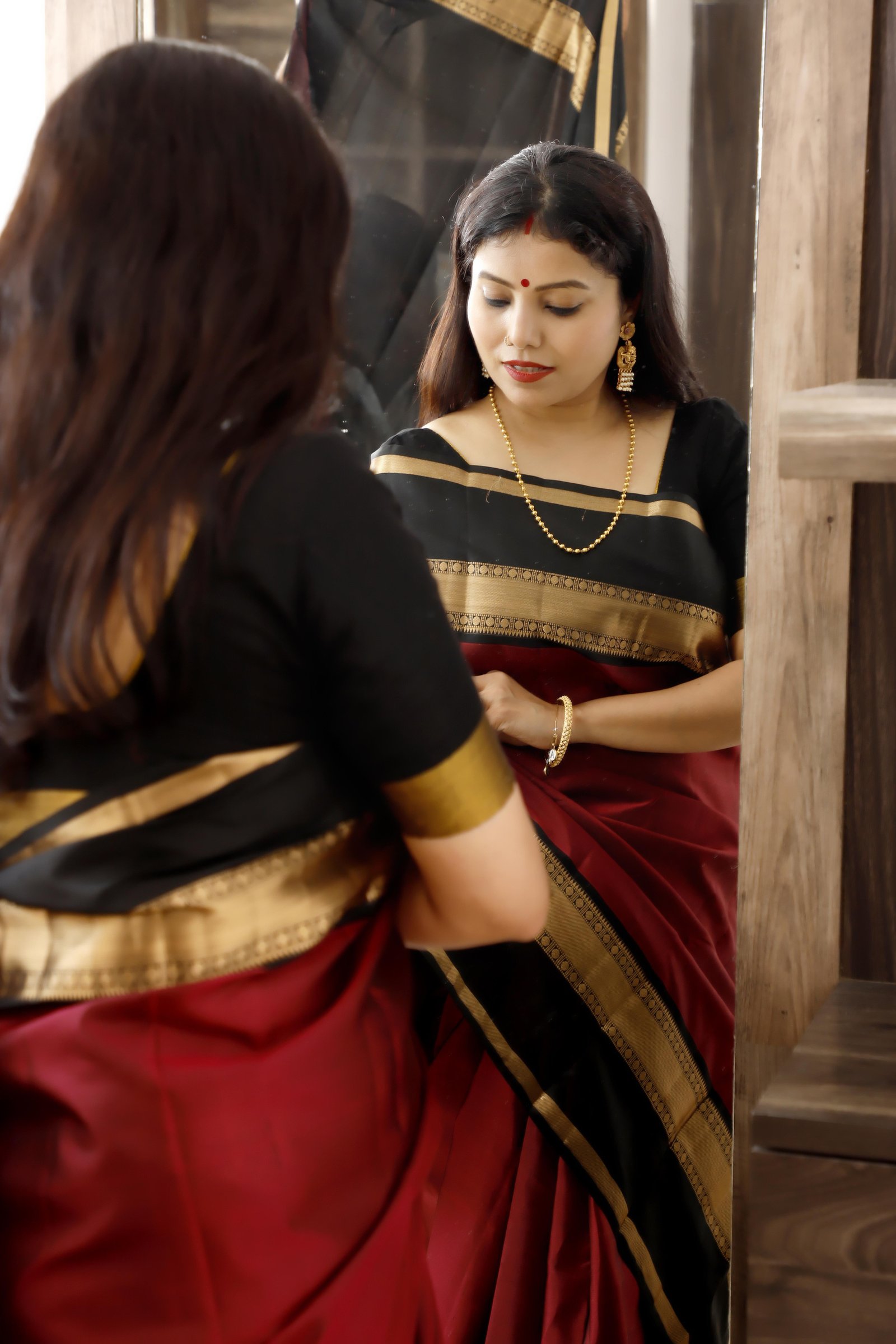 A timeless classic, this saree is crafted in pure Kanchipuram silk , featuring a rich maroon body paired with a deep black border and pallu . The look is elevated with an elegant gold zari border& pallu , adding a regal touch to the traditional contrast. Renowned for its lustrous texture and durability, this saree is Silk Mark certified , ensuring authenticity and premium craftsmanship — an ideal choice for weddings, festive occasions, and heirloom collections.