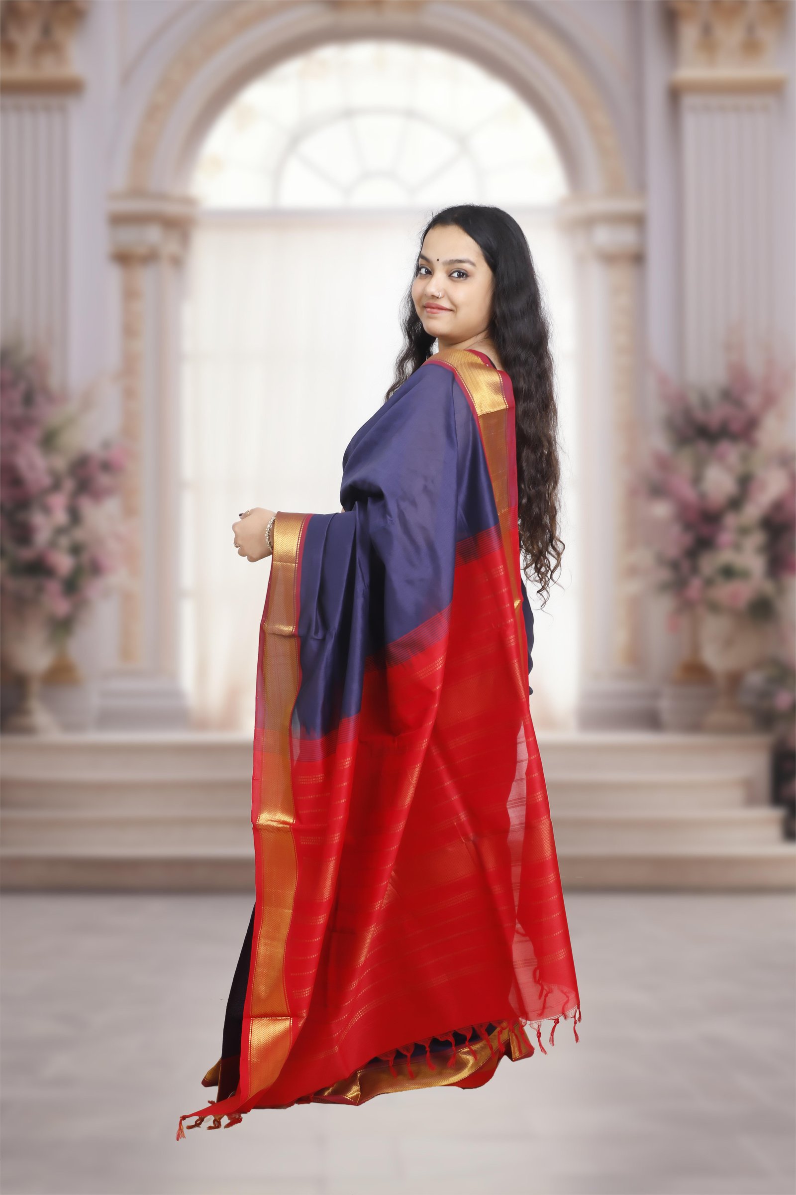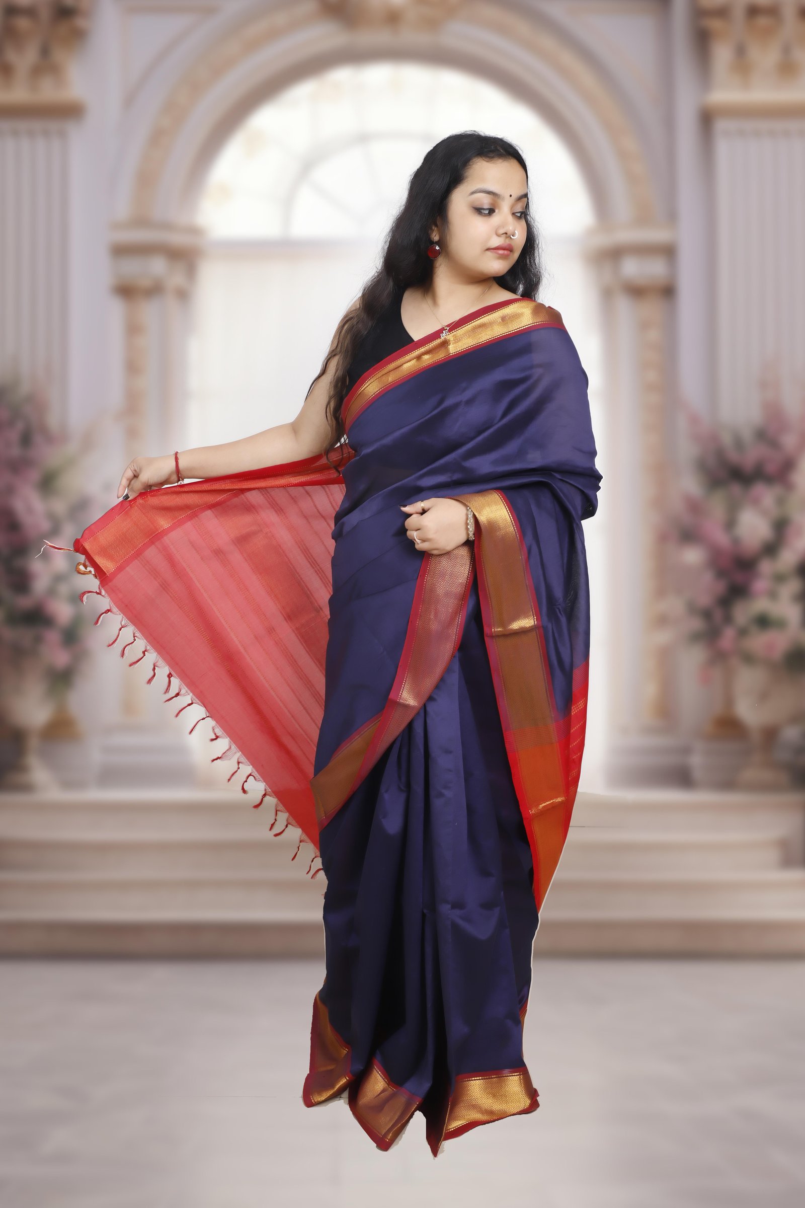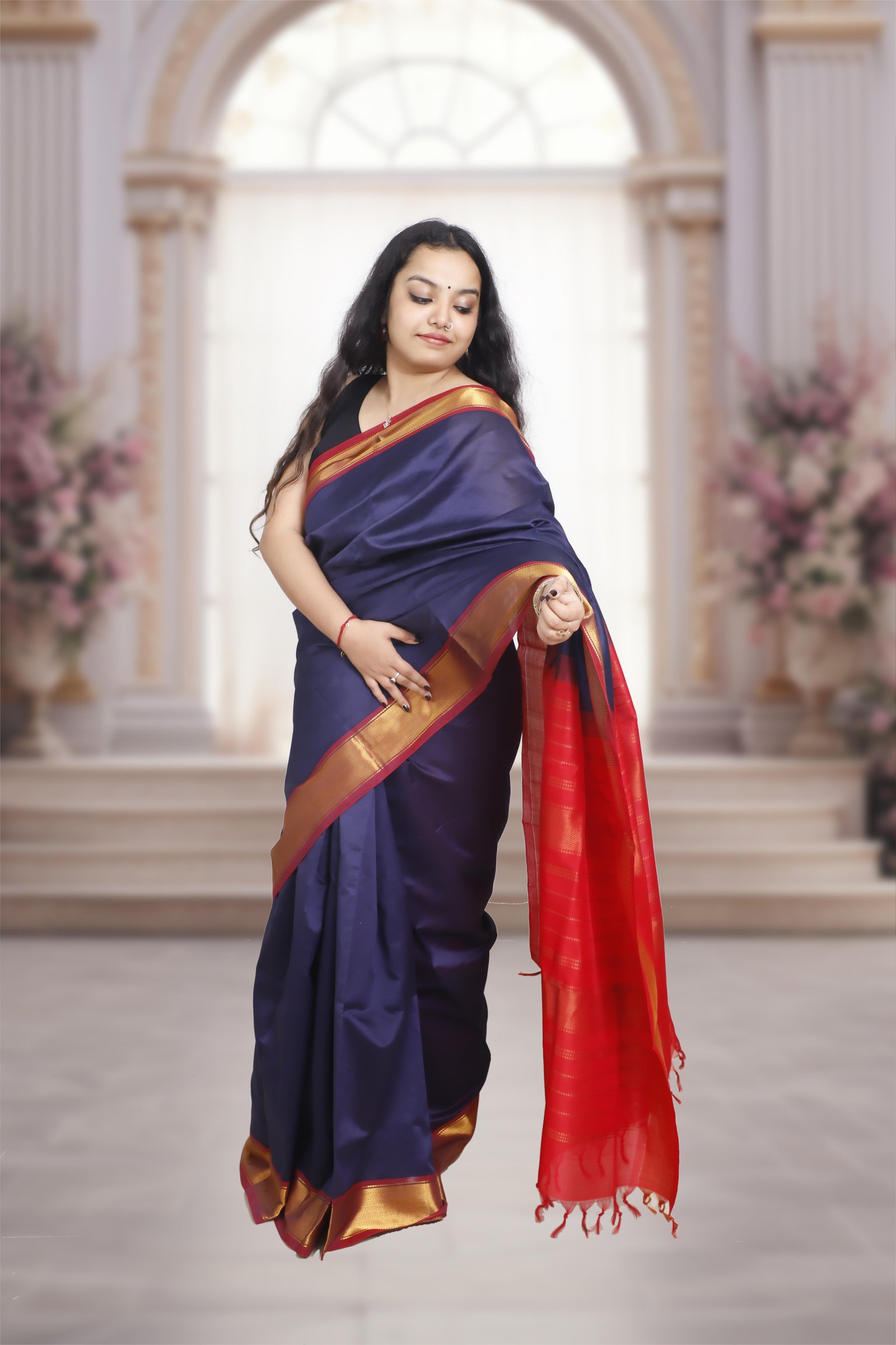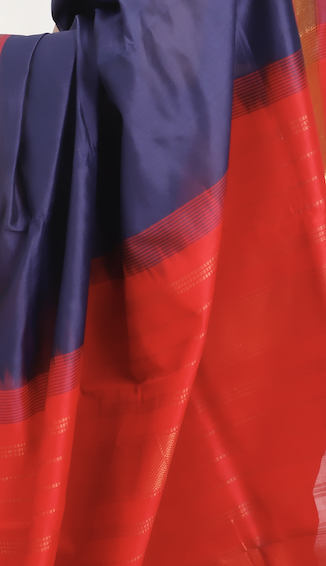 A graceful blend of tradition and elegance, this saree is crafted in Kanchi silk cotton , featuring a rich dark blue body contrasted with a vibrant red pallu . The look is accentuated with a golden zari border and richly woven pallu , adding a touch of grandeur while keeping the drape light and comfortable.