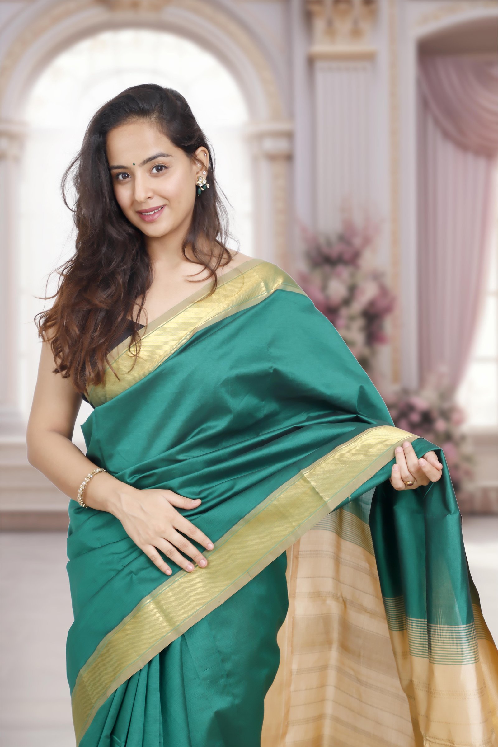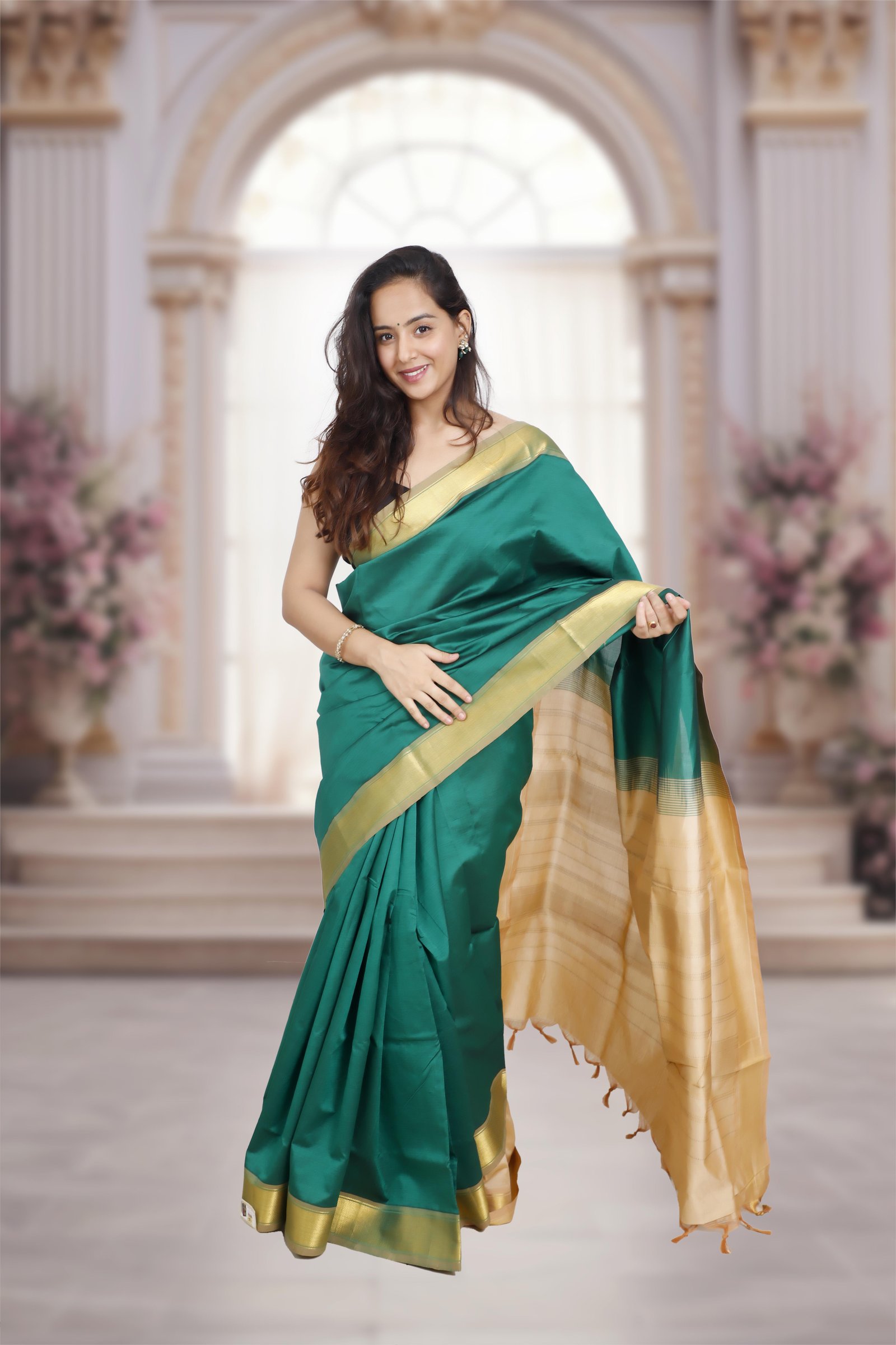 A graceful blend of tradition and elegance, this saree is crafted in Kanchi silk cotton, featuring a rich darkgreen body contrasted with a subtlebeige pallu. The look is accentuated with a golden zari border and richly woven pallu, adding a touch of grandeur while keeping the drape light and comfortable