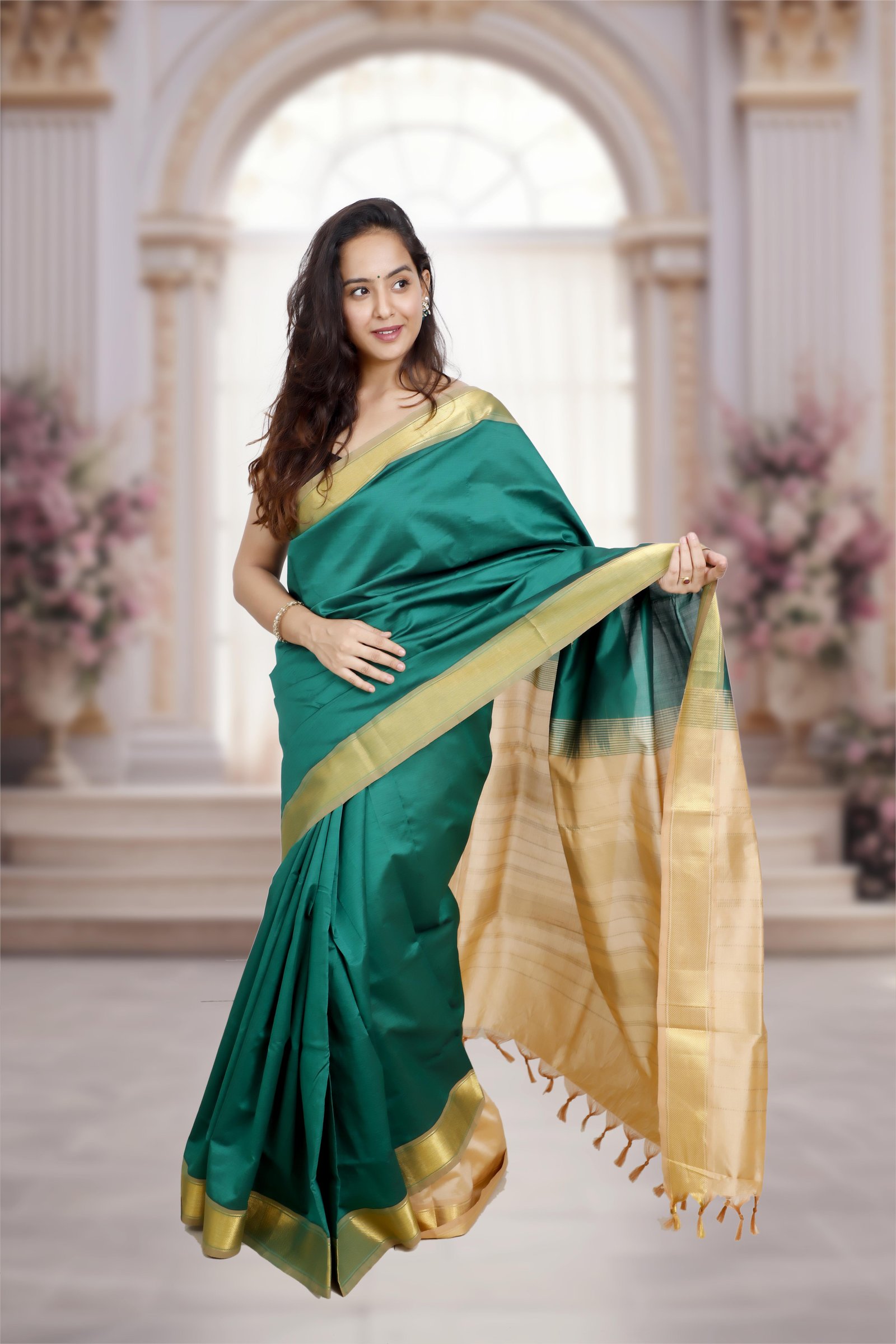 Kanchi Silk Cotton Saree – Dark Green with Beige Pallu & Golden Zari Border
