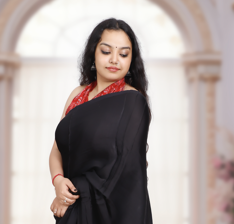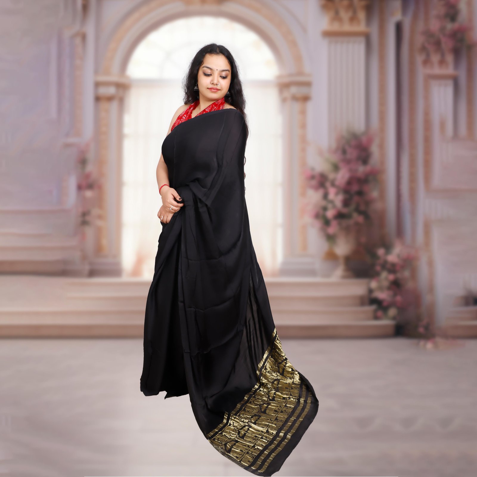 Plain Modal Silk Saree (Black) With Nakshi Pallu And Ajrakh Blouse