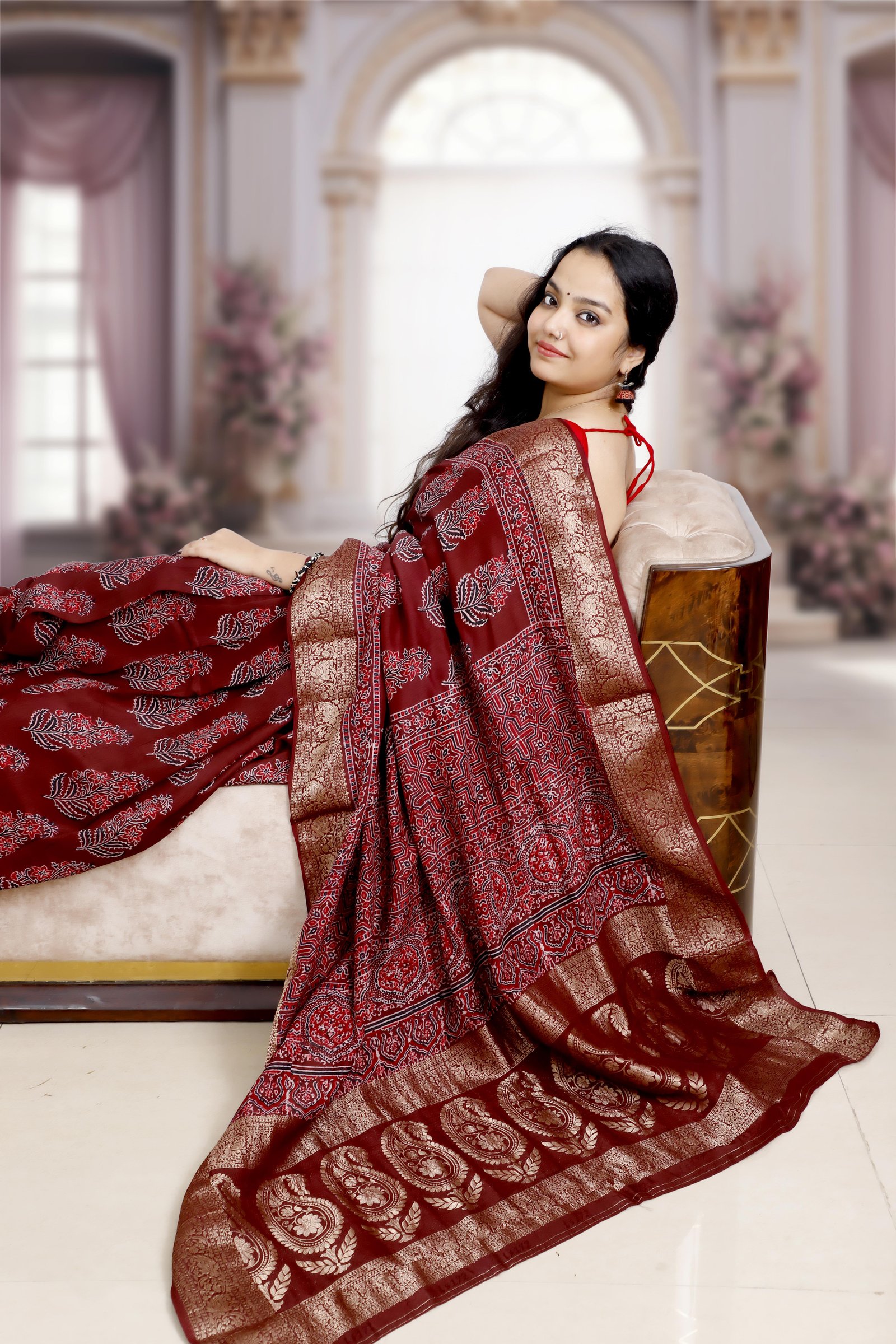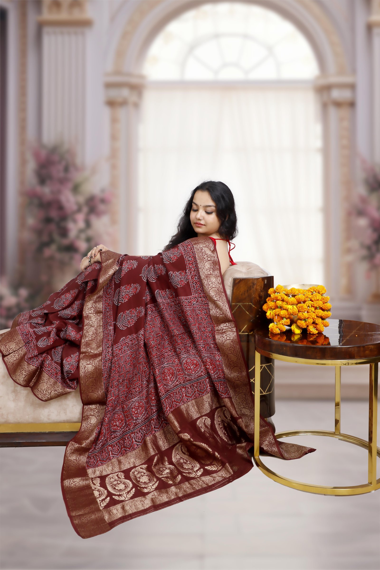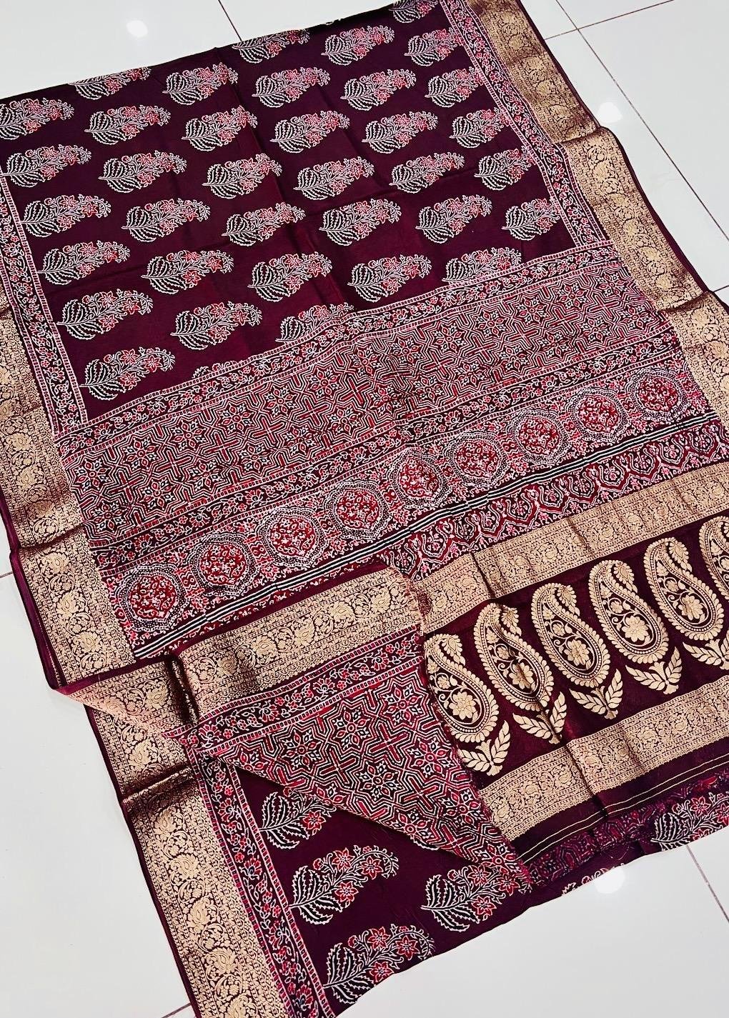 AJRAKH DOLA SILK SAREE (WINE) WITH NAKSHI ZARI PALLU