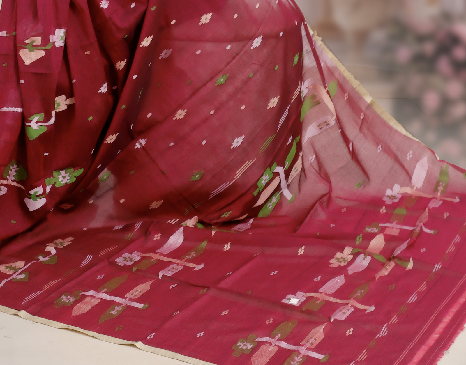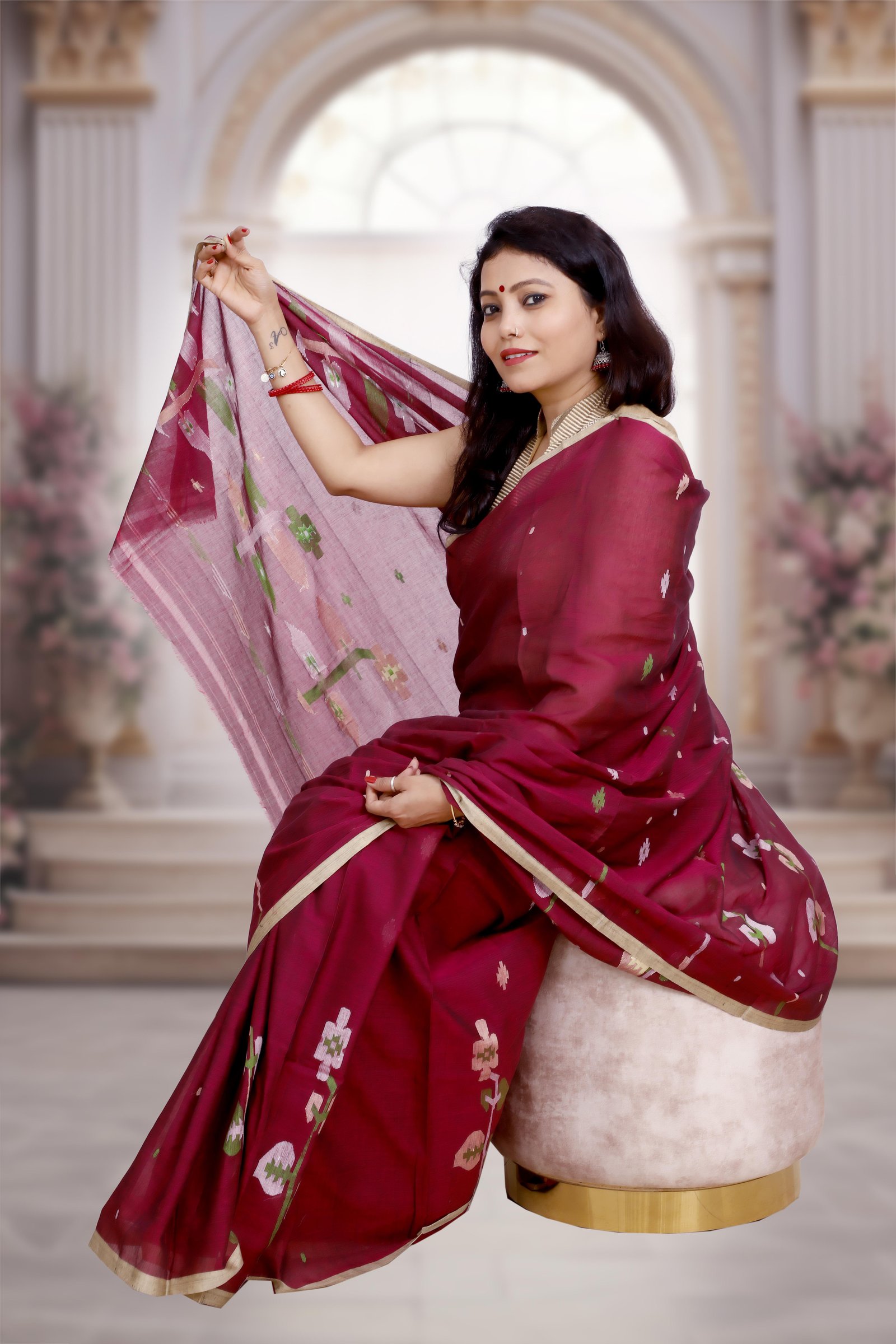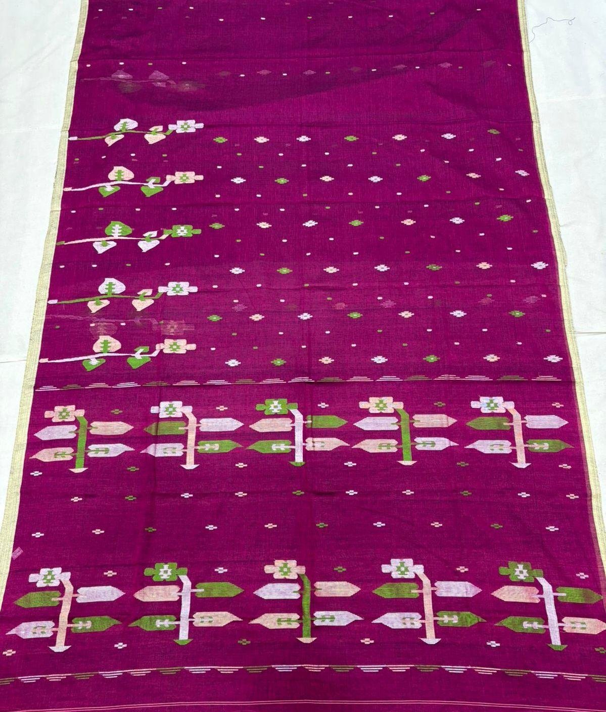 Crafted from premium quality pure cotton , this saree showcases the intricate beauty of handwoven Jamdani with fine needle work . The elegant Jamun Pink hue adds a touch of vibrance while keeping the look graceful and refined. Lightweight, breathable, and timeless, it is perfect for festive occasions and everyday elegance. Each piece is Silk Mark certified , ensuring authenticity and premium quality.