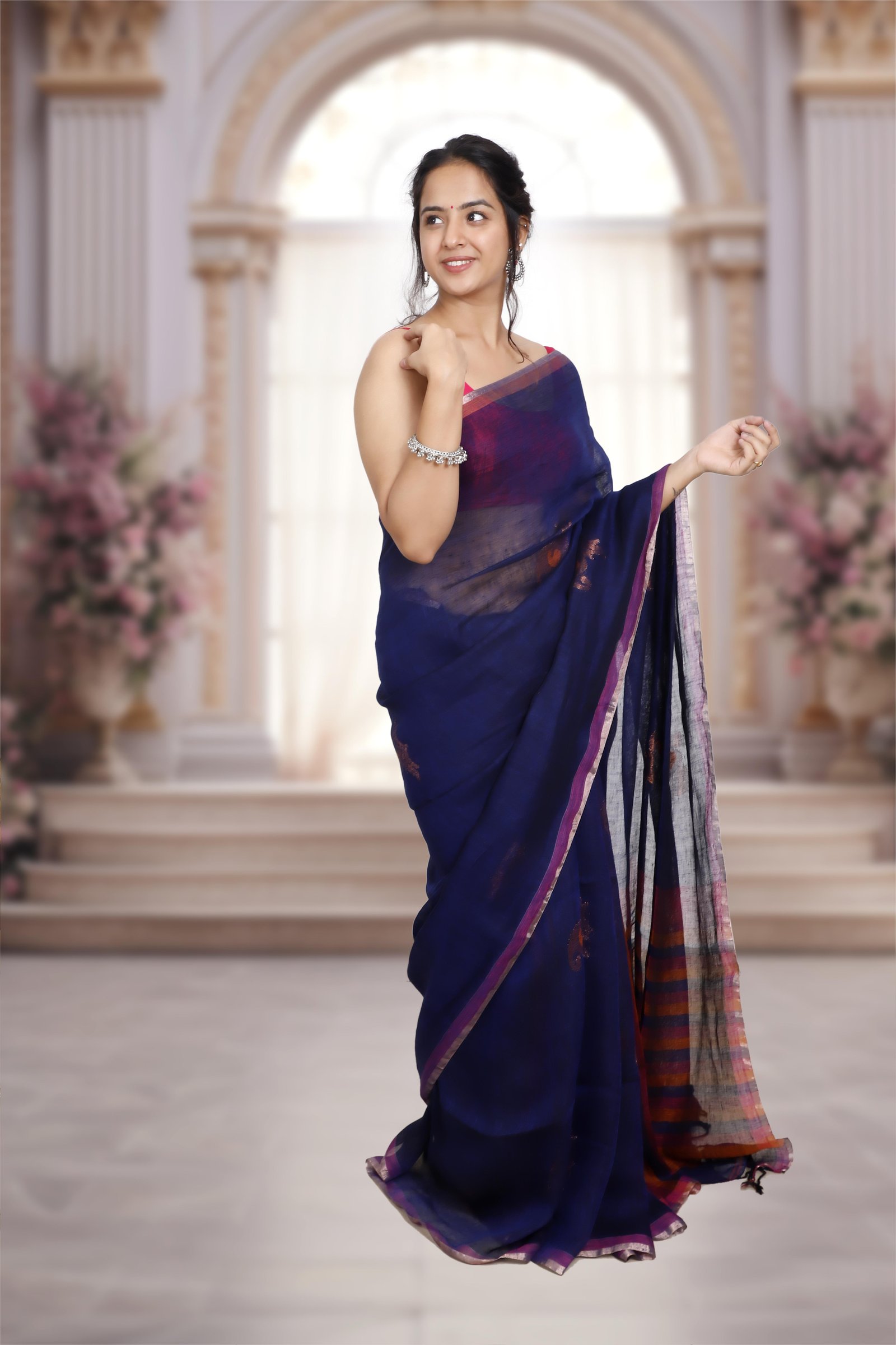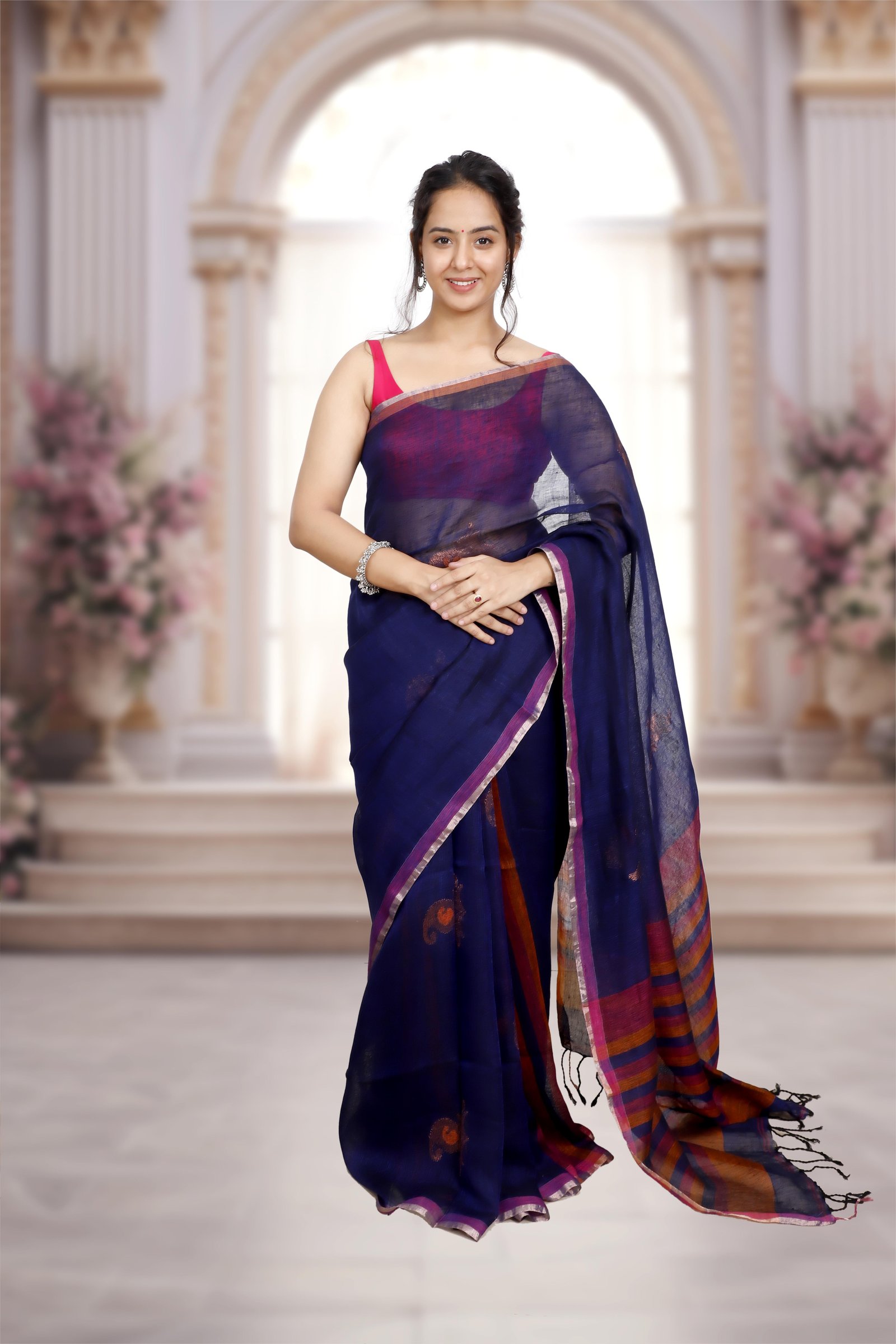 Woven in pure Bengal linen , this saree blends earthy elegance with vibrant charm. The gorgeous dark blue is beautifully enhanced with orange& pink accents , making it a perfect balance of tradition and contemporary style. Lightweight, breathable, and timelessly graceful.