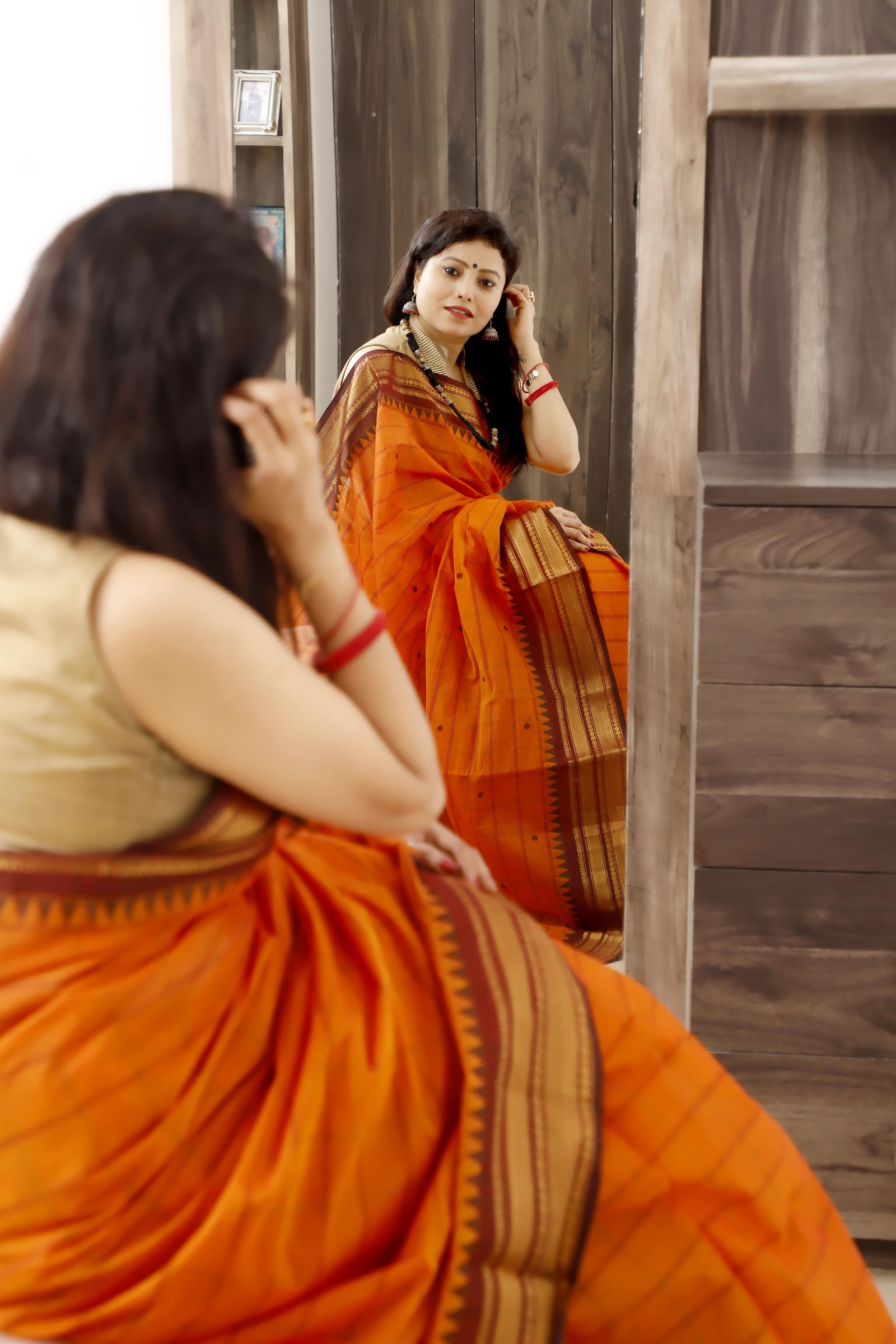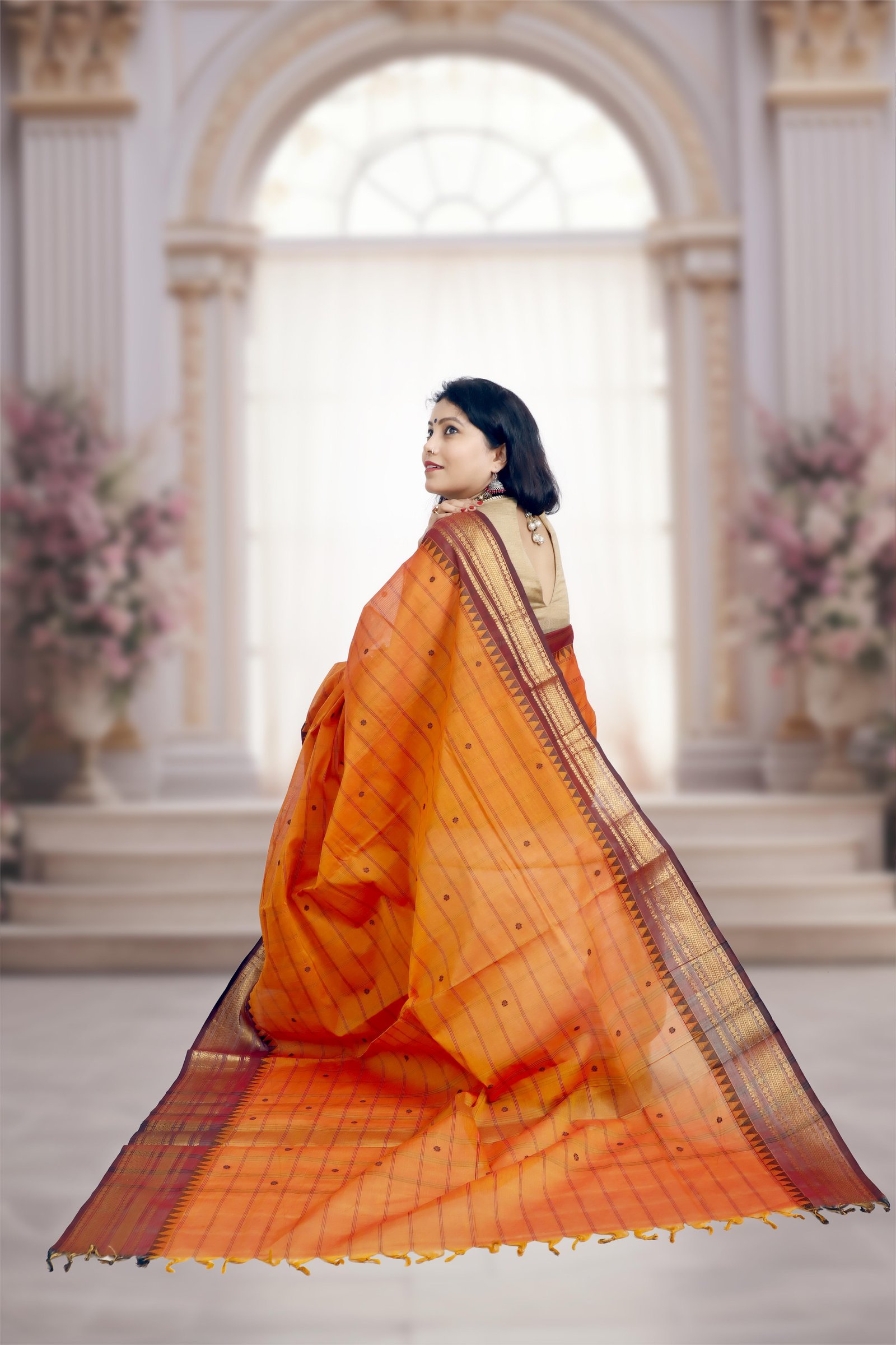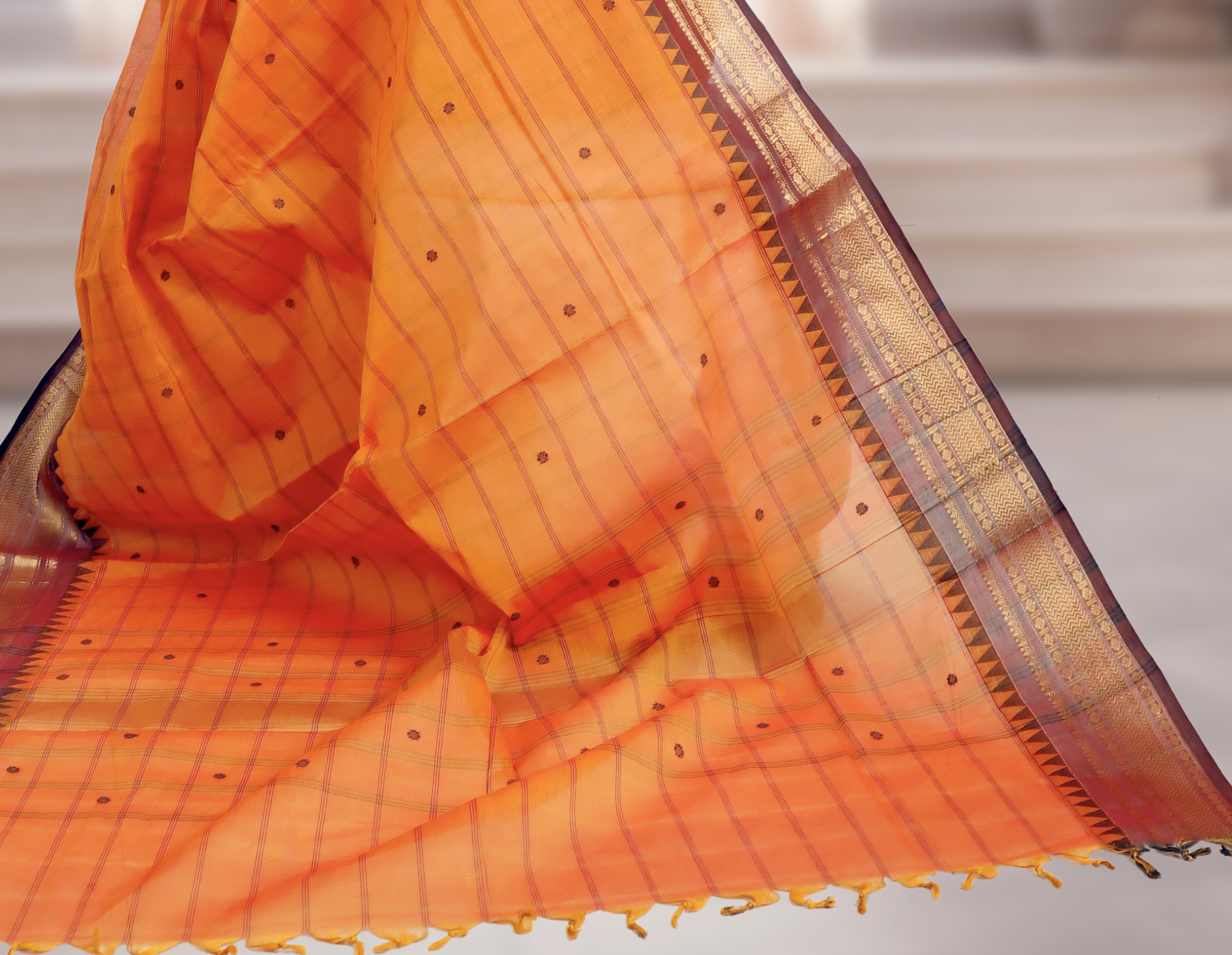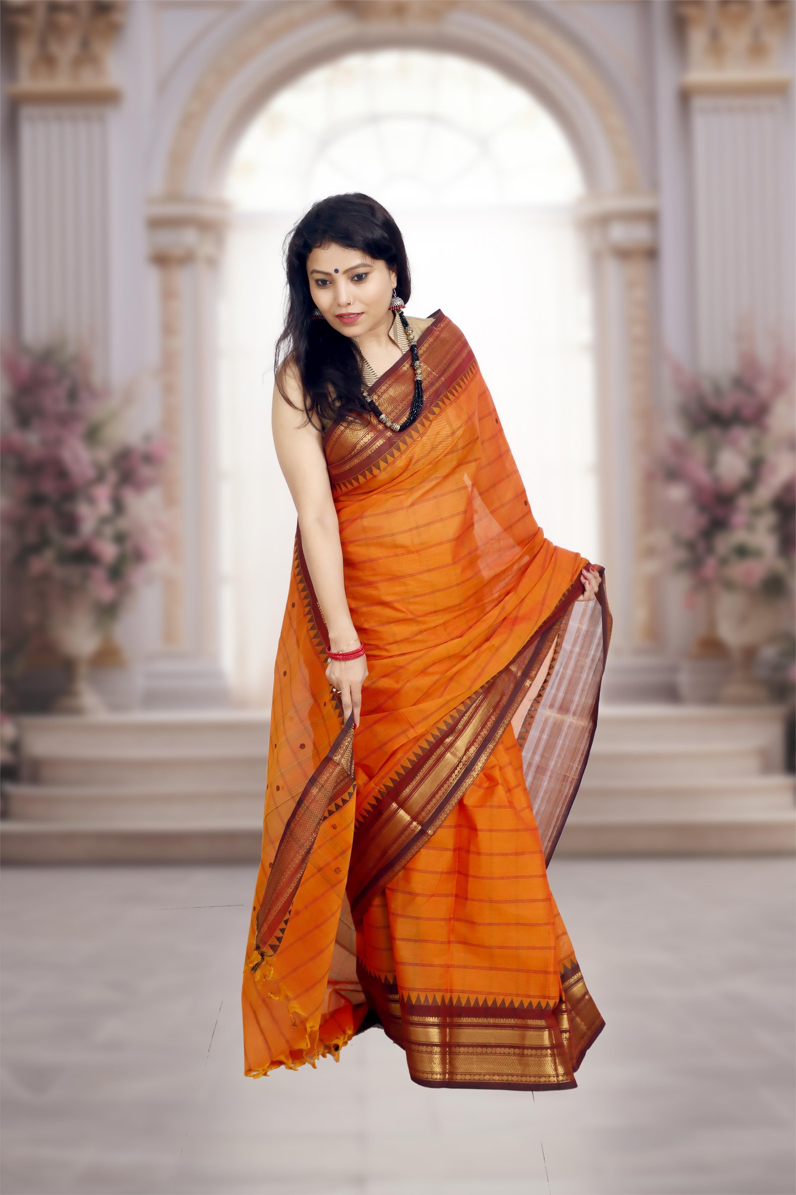 Handwoven in pure Kanchi cotton , this saree features a vibrant orange body beautifully contrasted with a rich brown border and pallu , highlighted with elegant golden zari work . Lightweight yet regal, it combines everyday comfort with festive charm, making it perfect for both traditional gatherings and special occasions.