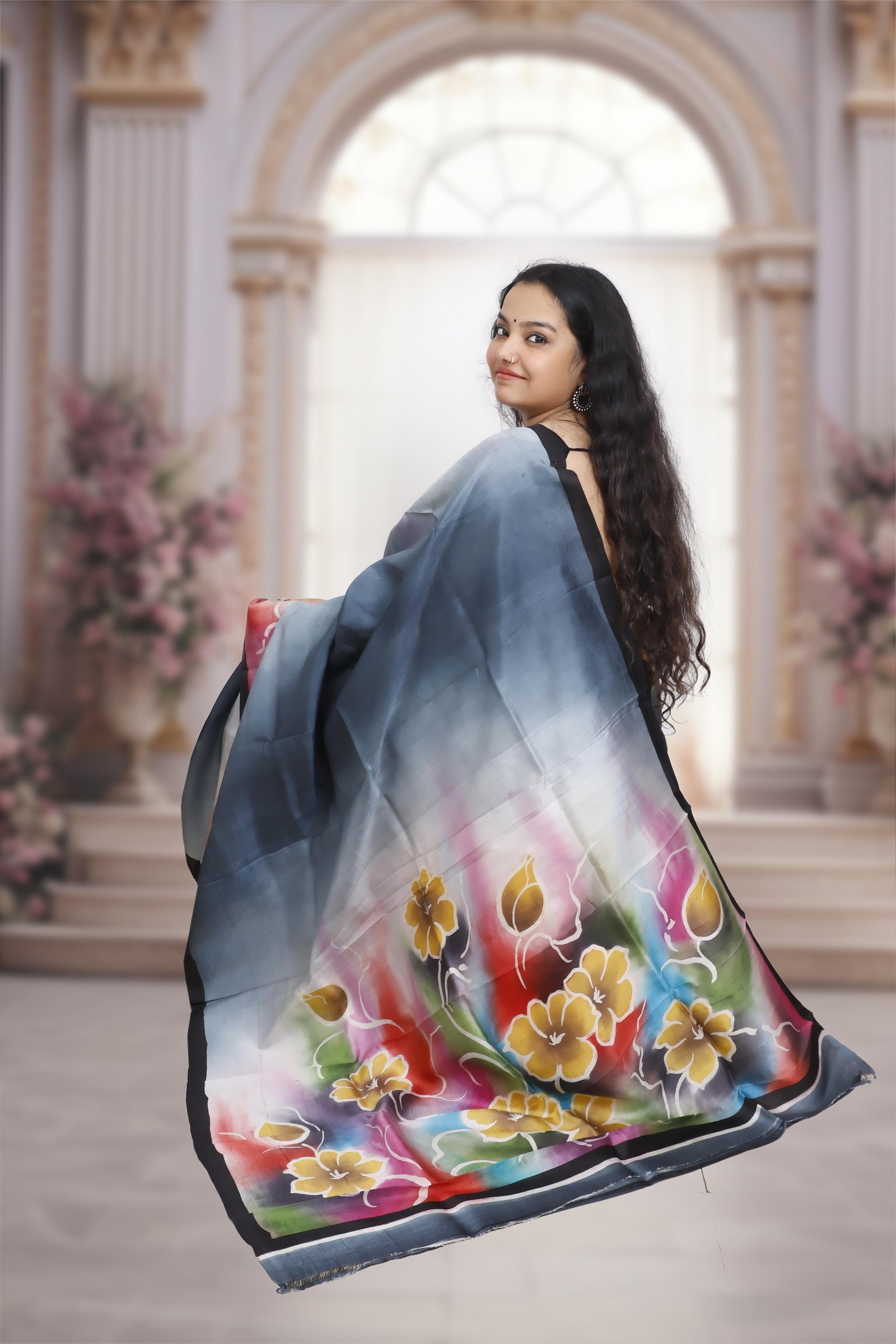 Pure Murshidabad Silk Handloom Saree with Hand-Painted Design – Grey Base