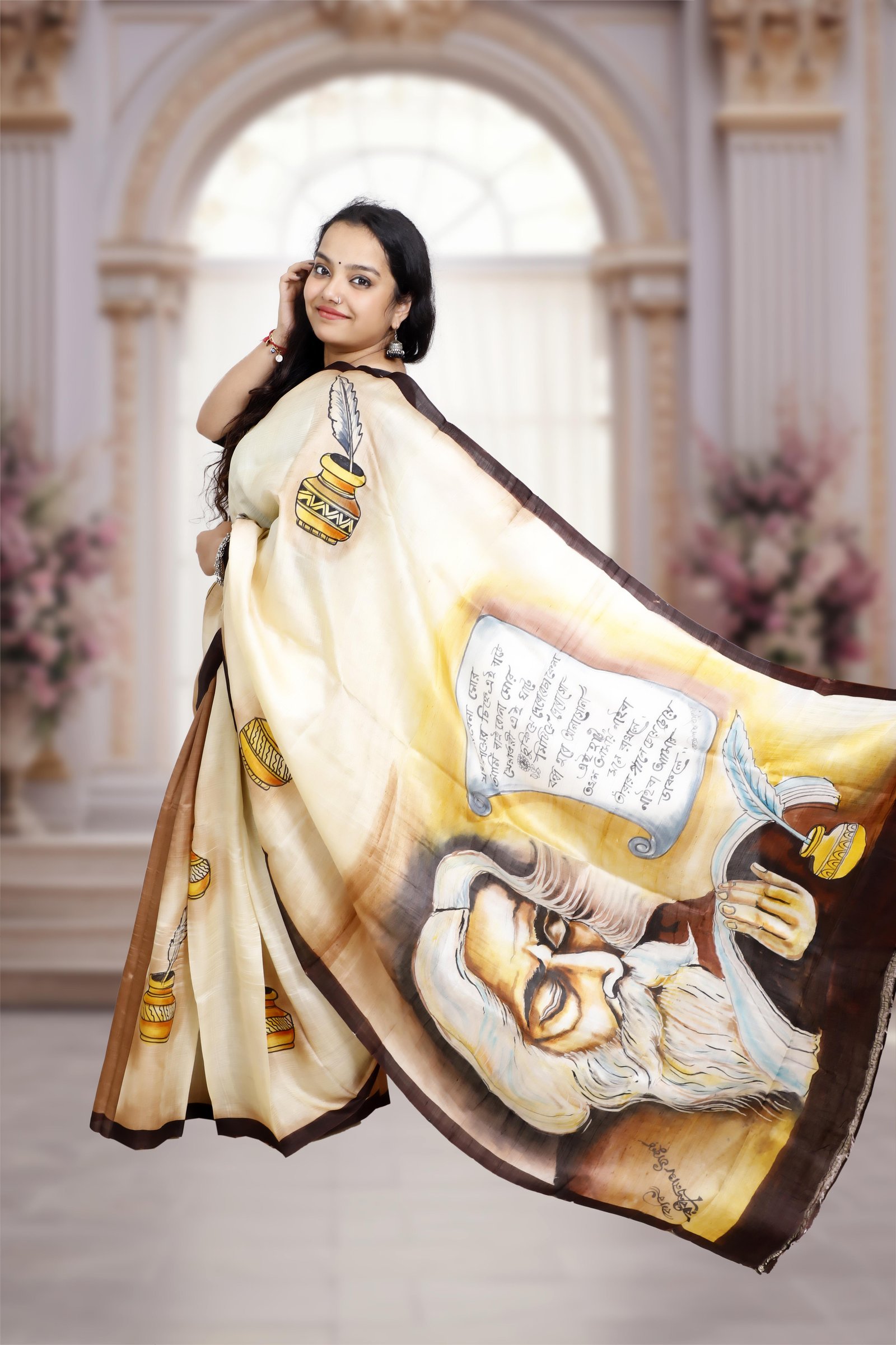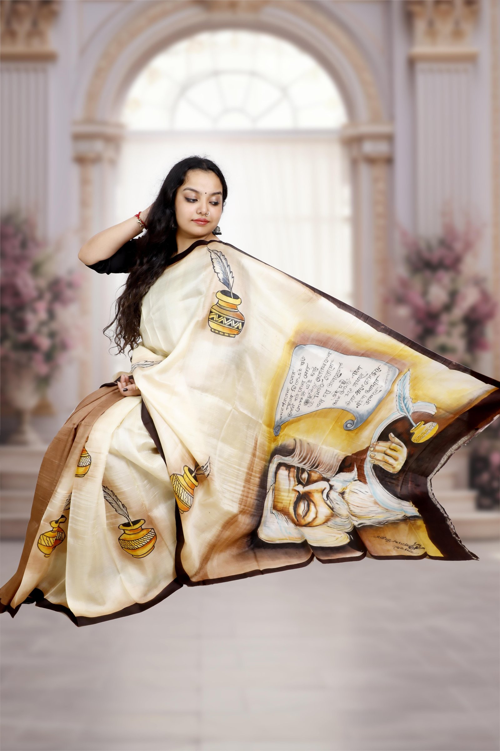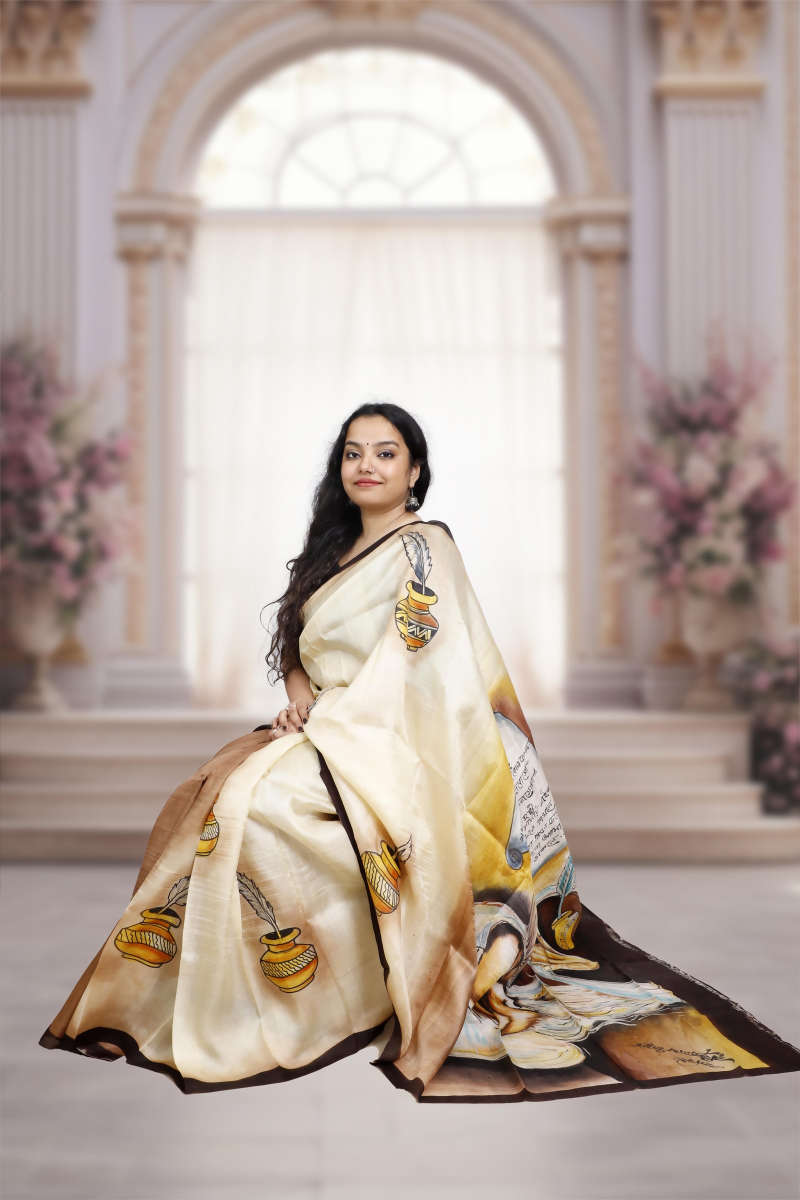 A true work of art, this saree is crafted from pure Murshidabad silk and adorned with exquisite hand-painted designs that reflect timeless craftsmanship. Lightweight, lustrous, and elegant, it carries the assurance of authenticity, each saree comes with a Silk Mark certification. Perfect for those who value tradition, artistry, and genuine luxury