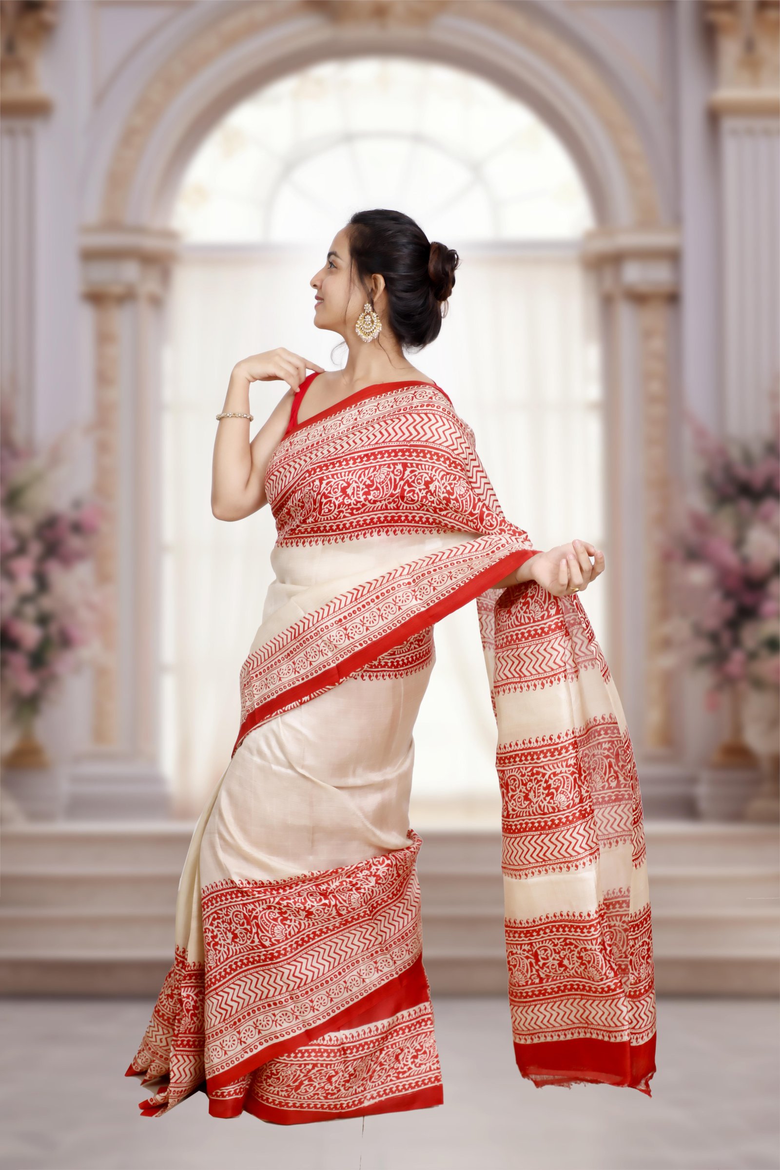 Crafted in pure Murshidabad silk , this saree features a graceful hand-block design that adds a touch of artisanal elegance. The off-white base with striking red accents creates a timeless and sophisticated look. Each saree comes with a Silk Mark certification , ensuring authenticity and premium quality.