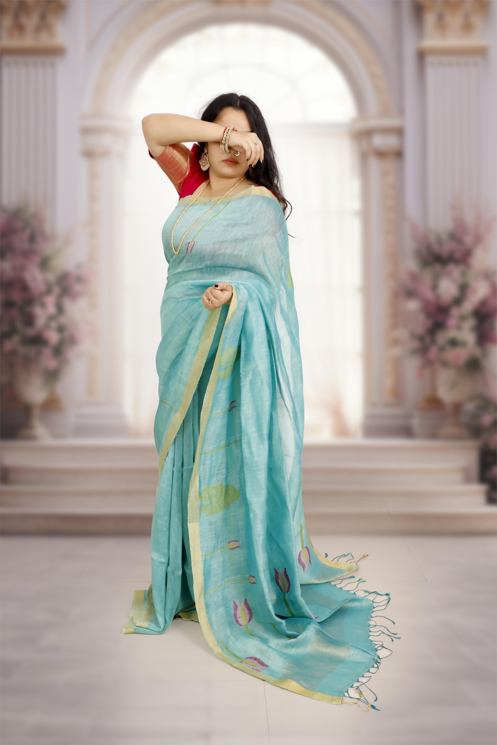 Silk Linen Jamdani Saree with Gold Zari Border – Teal Blue