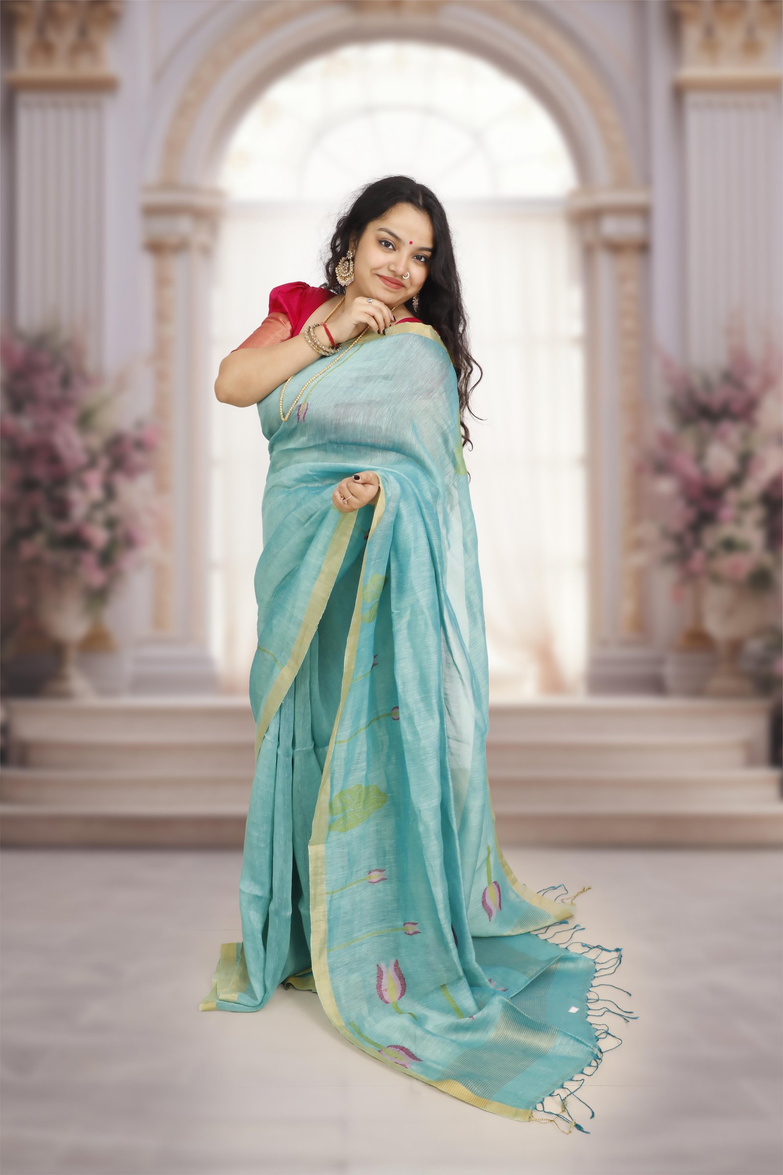 Woven in a luxurious silk-linen blend, this saree highlights the timeless artistry of handwoven Jamdani motifs. The fresh teal blue base is beautifully complemented by the gold zari border, adding a regal charm to its elegance. Each saree is Handloom Mark certified, assuring authenticity, premium quality, and heritage craftsmanship.