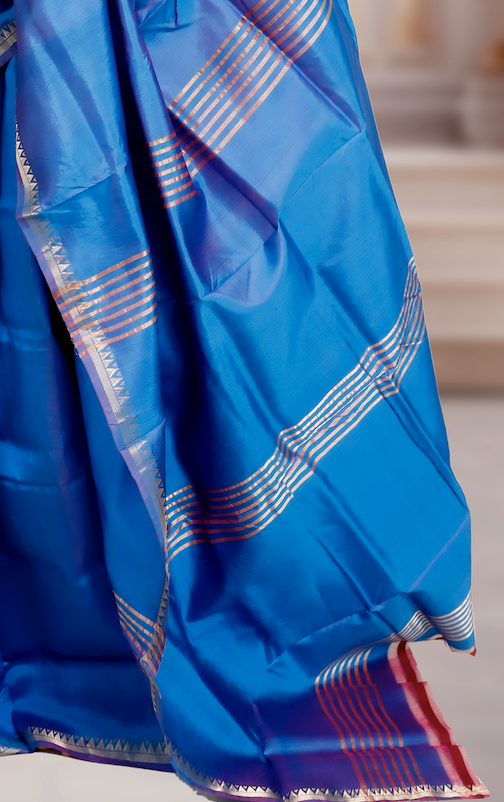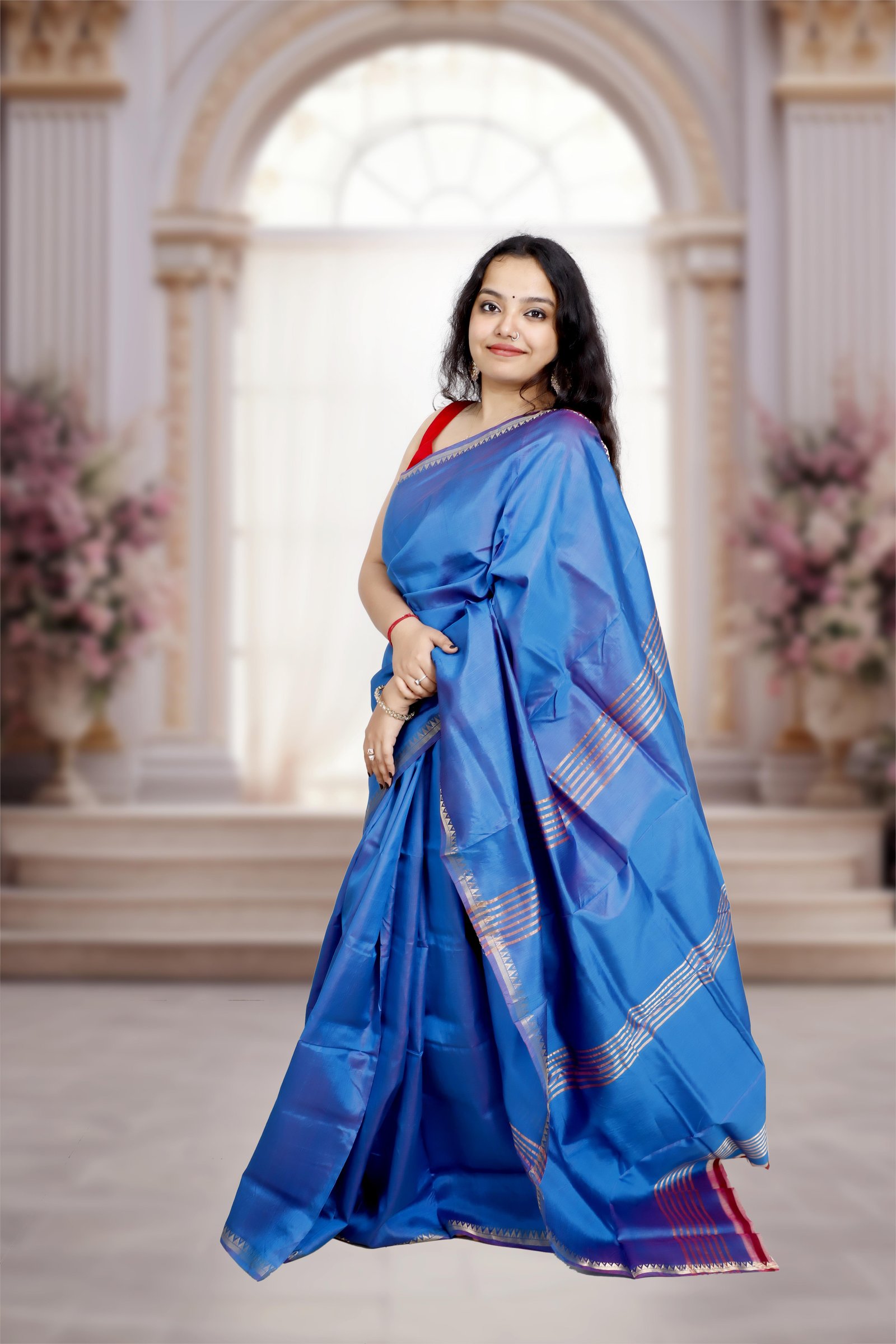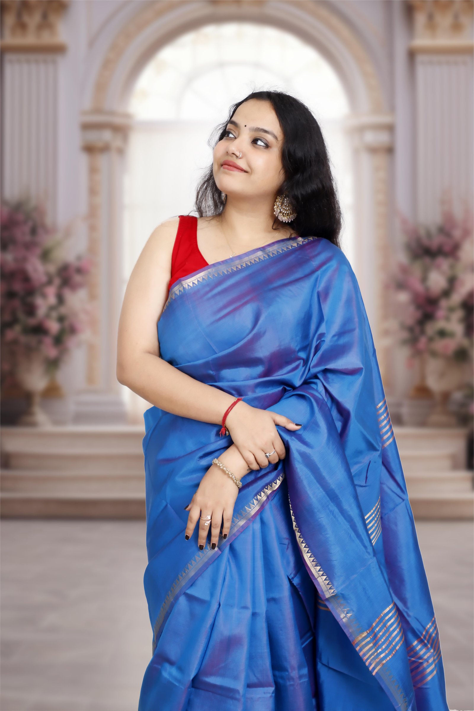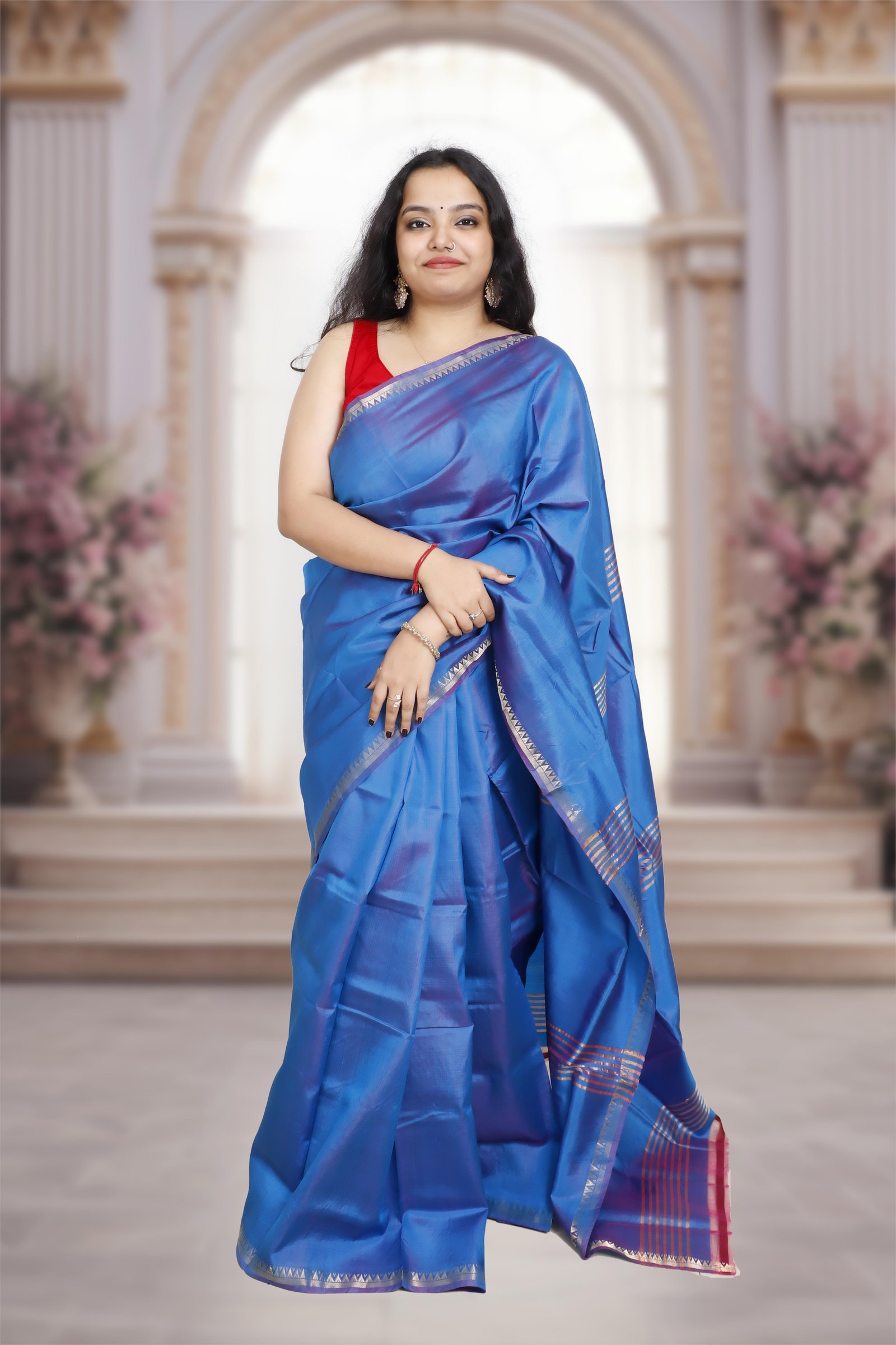 Crafted in soft Bishnupuri Katan silk , this saree is celebrated for its smooth texture and natural sheen. Featuring a subtle 1-inch border and a rich blue body , it beautifully blends traditional craftsmanship with elegant simplicity. Each saree comes with a Silk Mark certification , ensuring authenticity and premium quality.