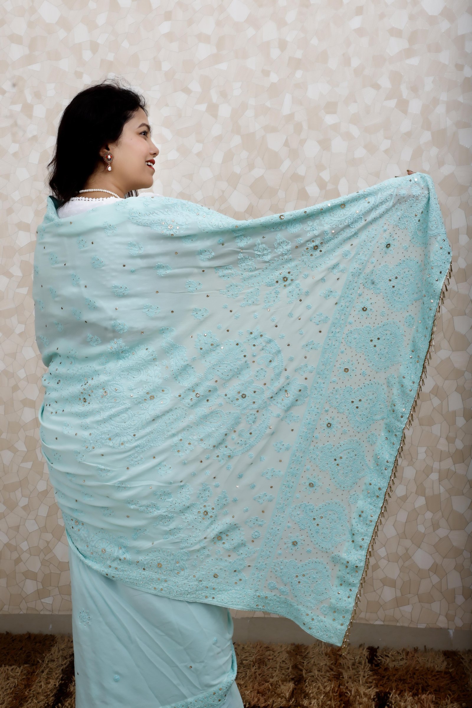 Ethereal and graceful, this saree is crafted in viscose georgette, featuring intricate chikankari embroidery and delicate mukaish work in elegant same color thread across a serene soft teal base. The shimmer of mukaish beautifully complements the airy drape, making it a perfect choice for festive evenings, celebrations, and elegant gatherings.
