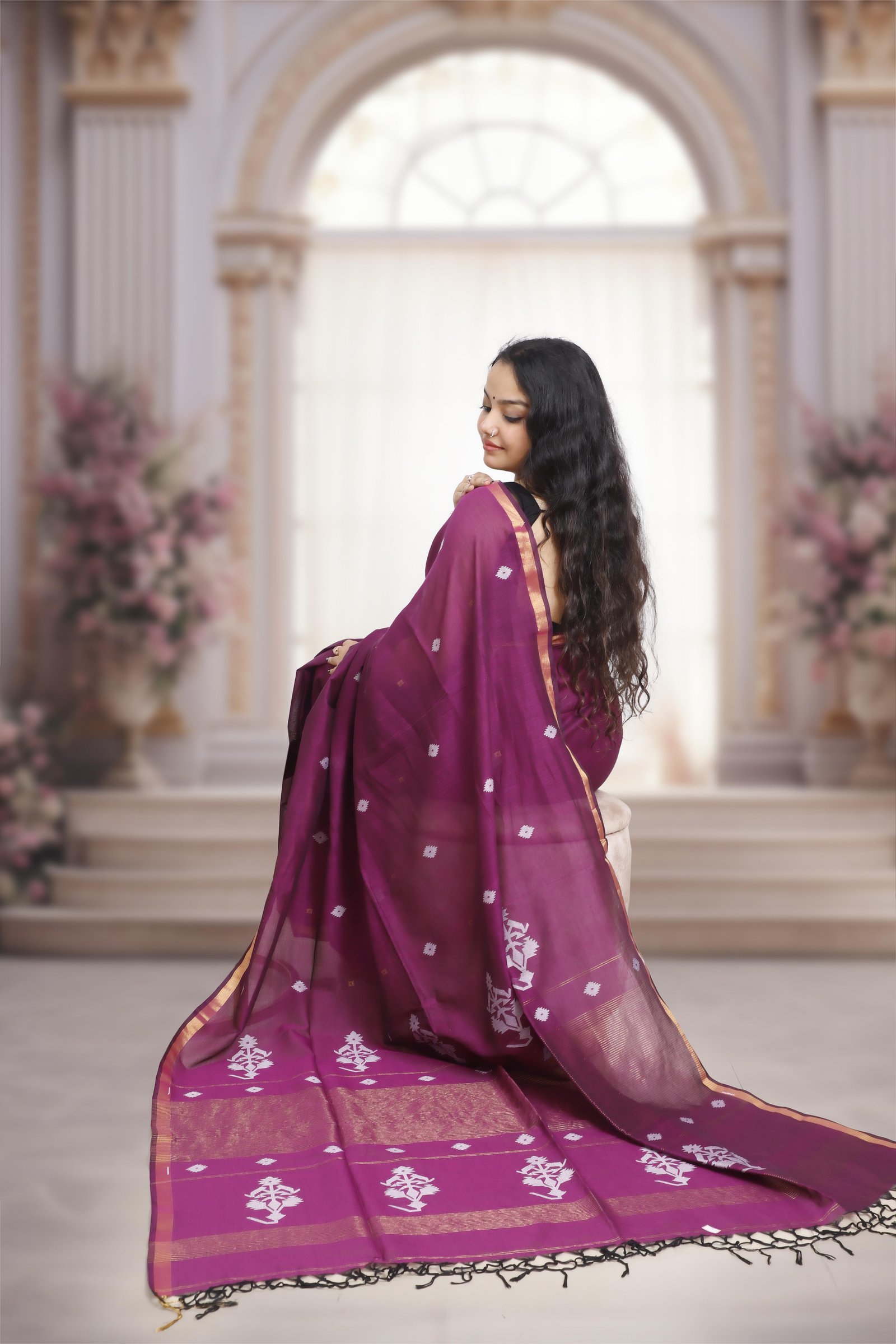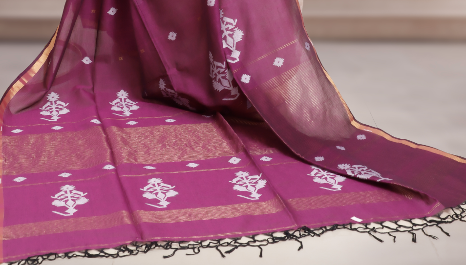 This elegant saree is woven in pure mercerized Bengal cotton, celebrated for its lightness and comfort. The highlight is the handloom jacquard weaving on the pallu, adding a refined touch of artistry to its classic appeal. A perfect choice for those who cherish tradition with subtle sophistication.