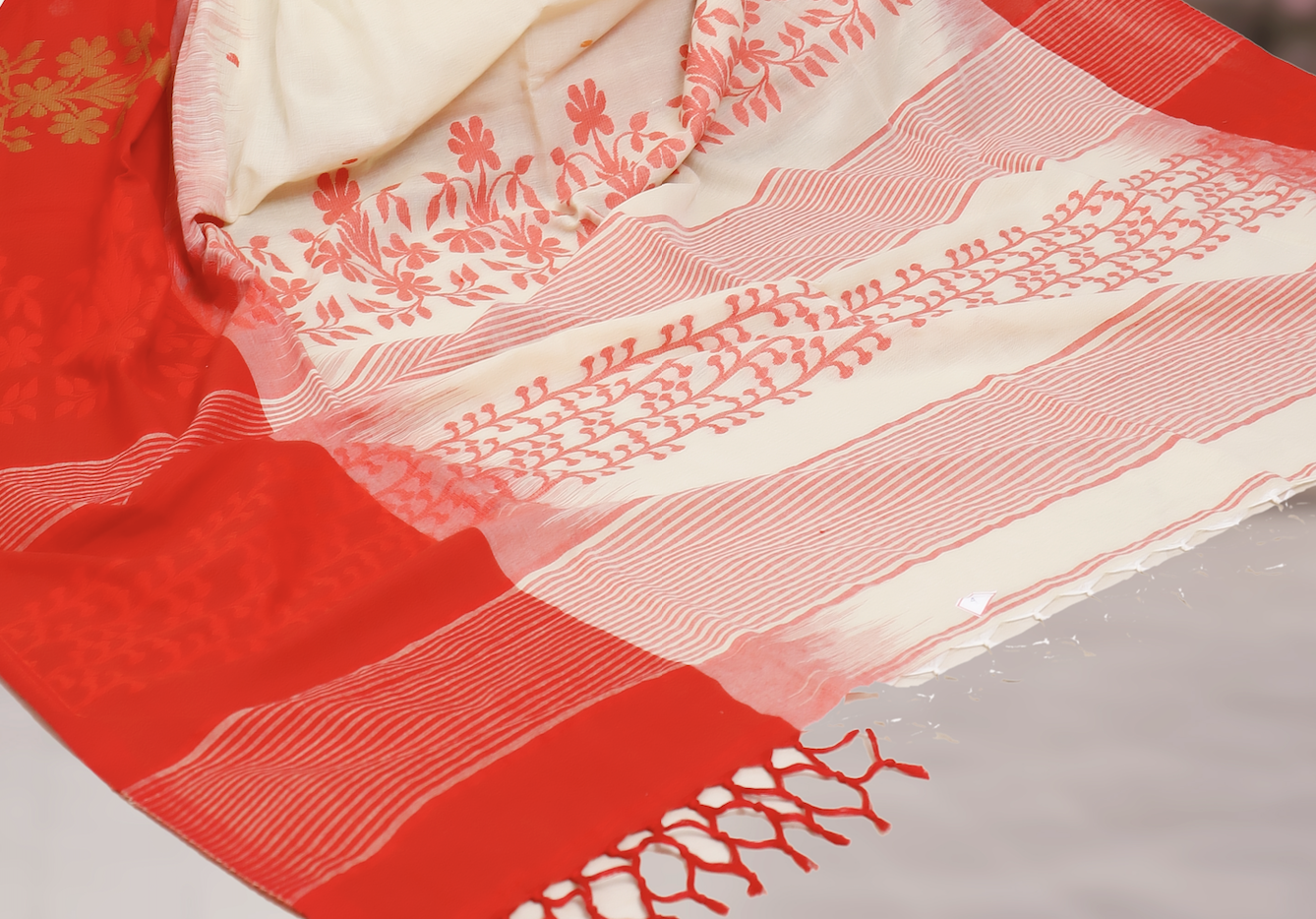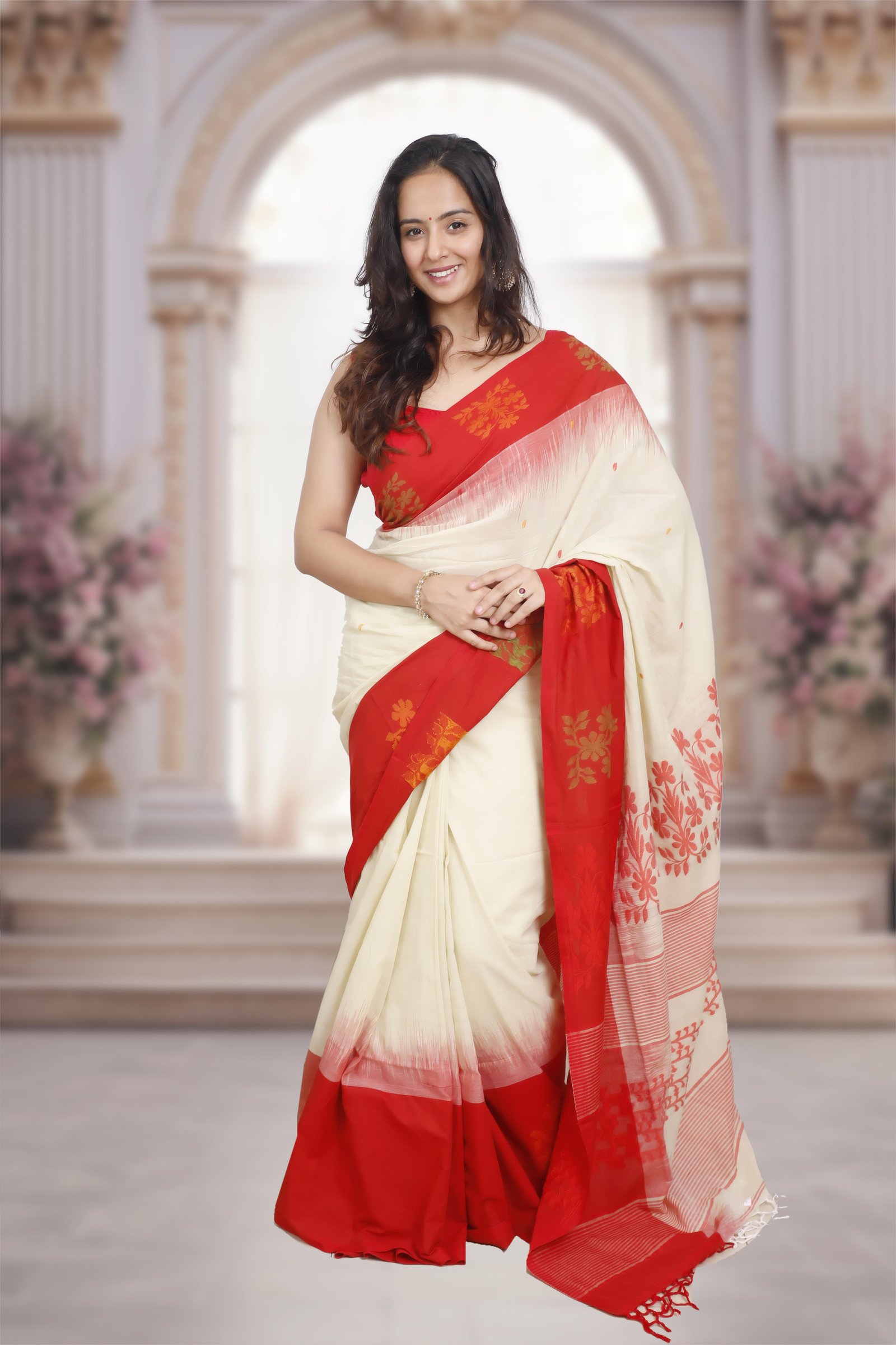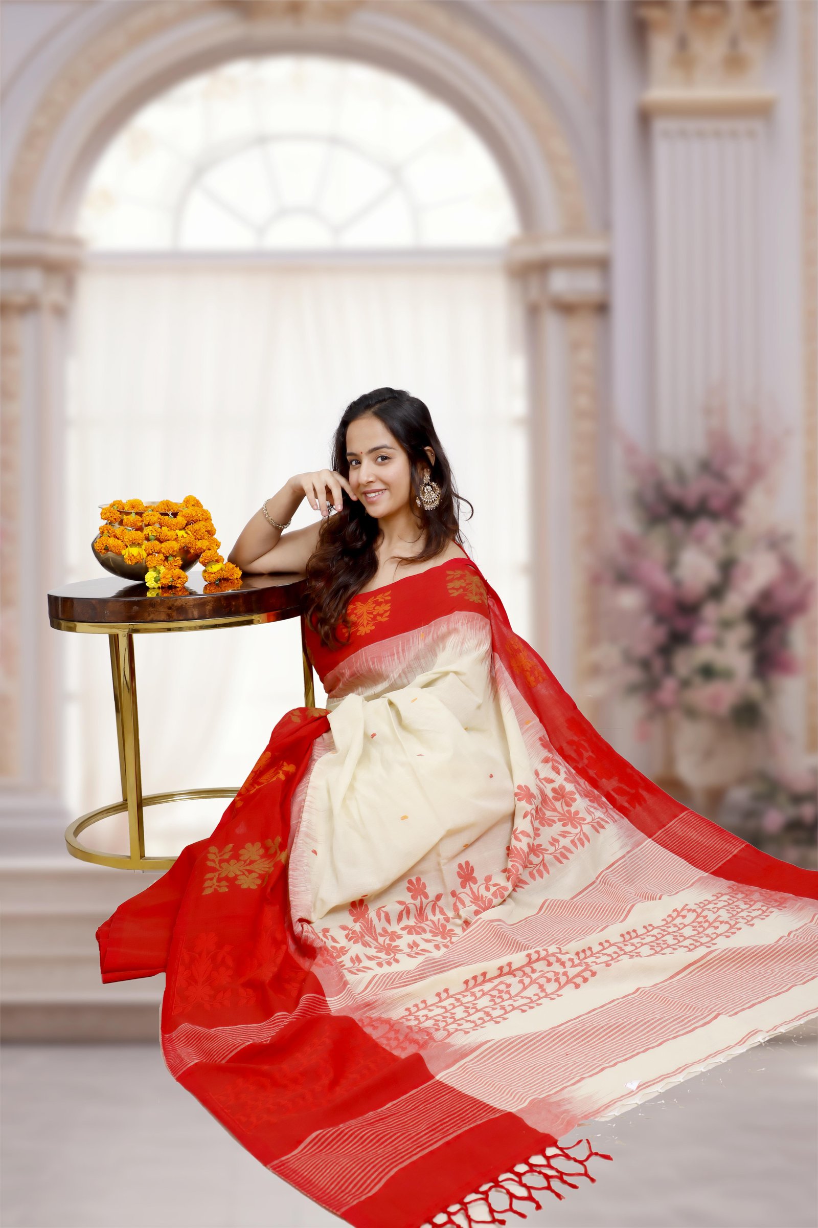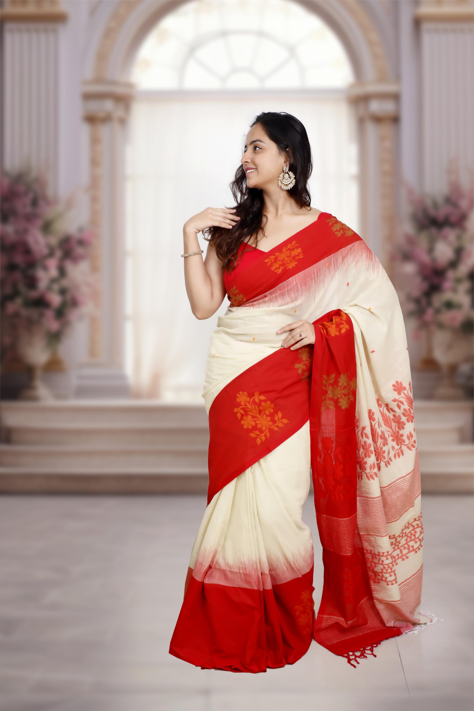 A classic from Bengal’s weaving tradition, this saree is crafted in soft handwoven ikkat cotton with a timeless off-white body and striking red accents. Lightweight, breathable, and effortlessly graceful, it is perfect for both everyday elegance and festive occasions.