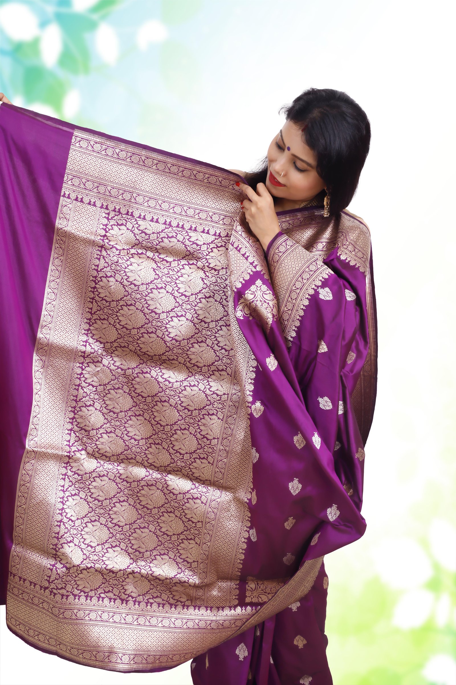 Crafted from pure handwoven Katan Mulberry silk, this saree is adorned with intricate gold and silver Kadwa weaving, a hallmark of Banarasi artistry. The deep purple base enhances its regal elegance, making it an heirloom-worthy drape for weddings, festive occasions, and grand celebrations. Each saree is Silk Mark certified and carries the Handloom Mark, ensuring authenticity, heritage, and premium craftsmanship.