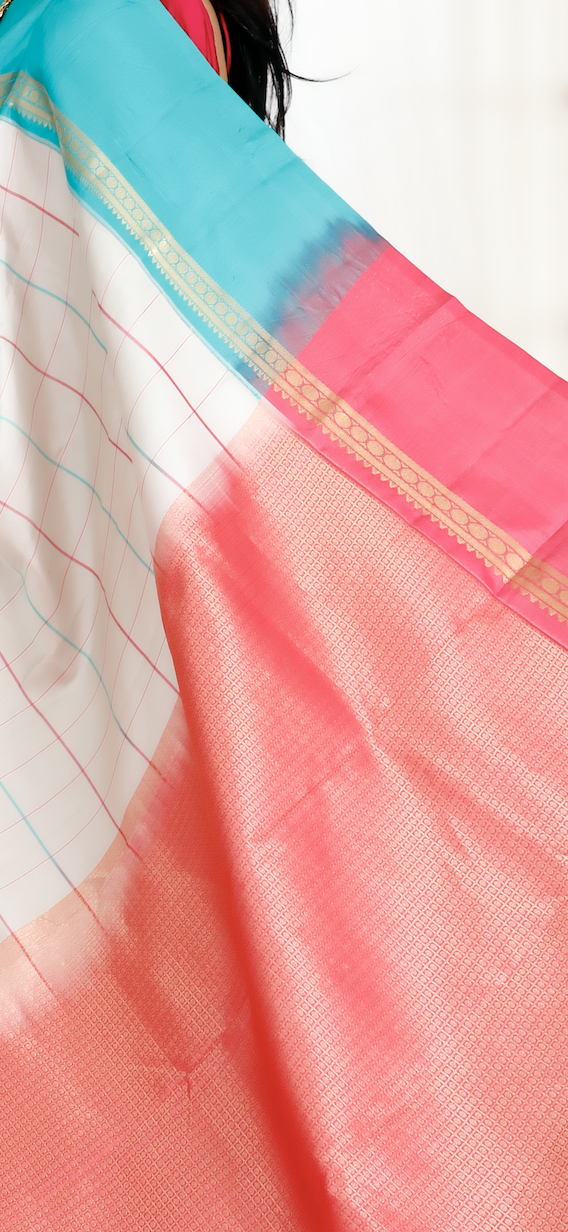 Handwoven Kanchipuram Silk Saree – White with Light Blue & Pink Checks