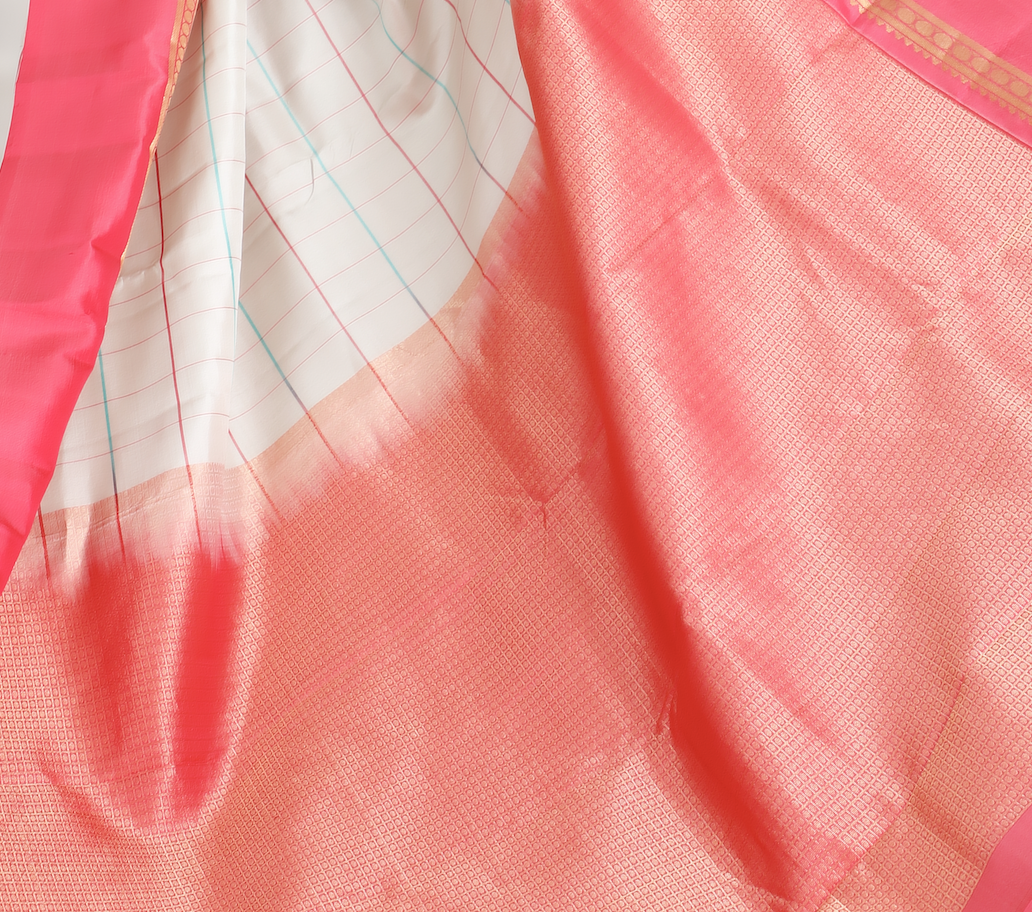 Graceful and timeless, this saree is handwoven in pure mulberry silk, the hallmark of authentic Kanchipuram weaving. The soothing white base is adorned with delicate checks and complemented by a soft light blue and light pink border and pallu, lending it a serene yet elegant appeal. Ideal for weddings, festive occasions, and heirloom collections, this saree comes Silk Mark certified, assuring purity and authenticity