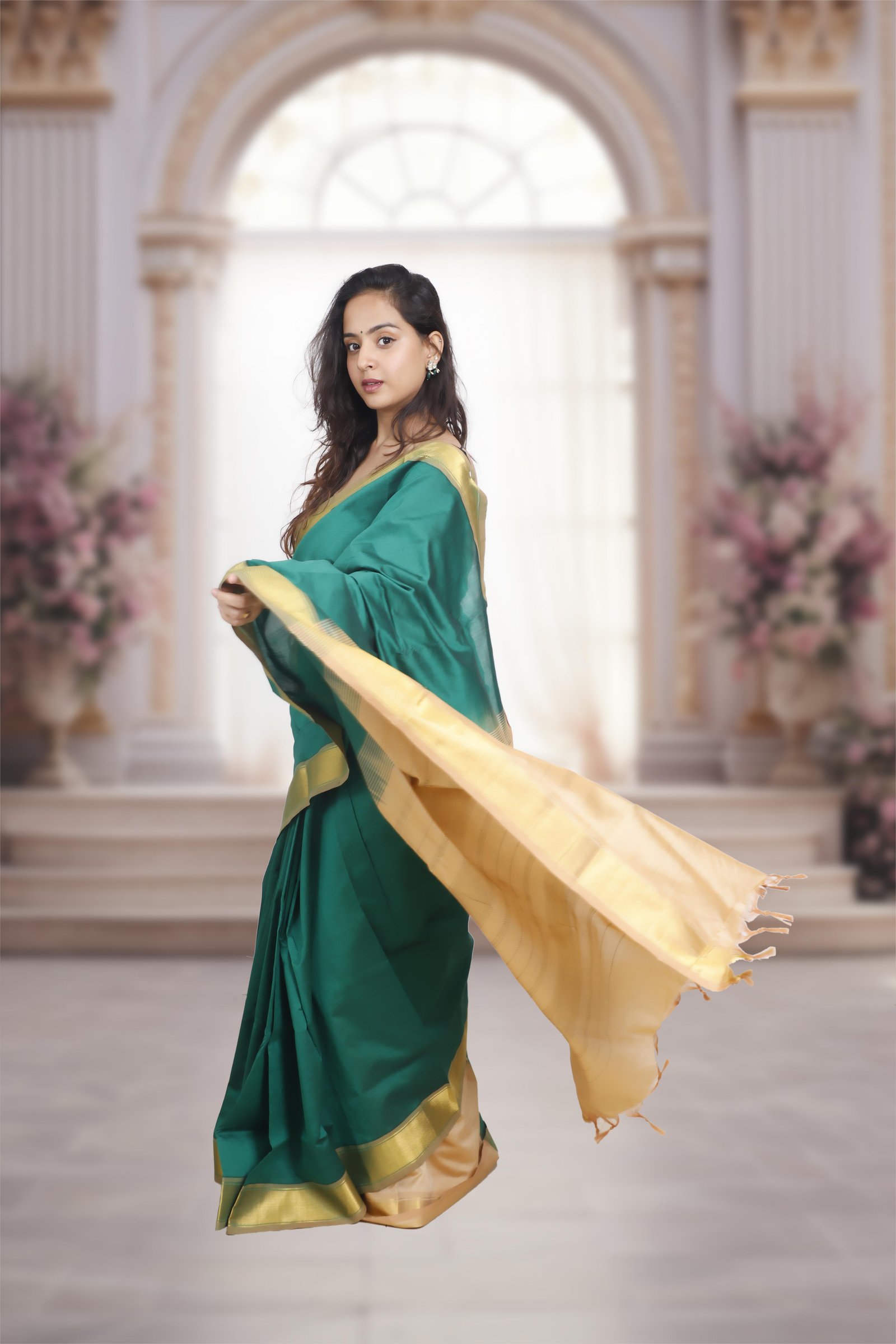 A graceful blend of tradition and elegance, this saree is crafted in Kanchi silk cotton, featuring a rich darkgreen body contrasted with a subtlebeige pallu. The look is accentuated with a golden zari border and richly woven pallu, adding a touch of grandeur while keeping the drape light and comfortable