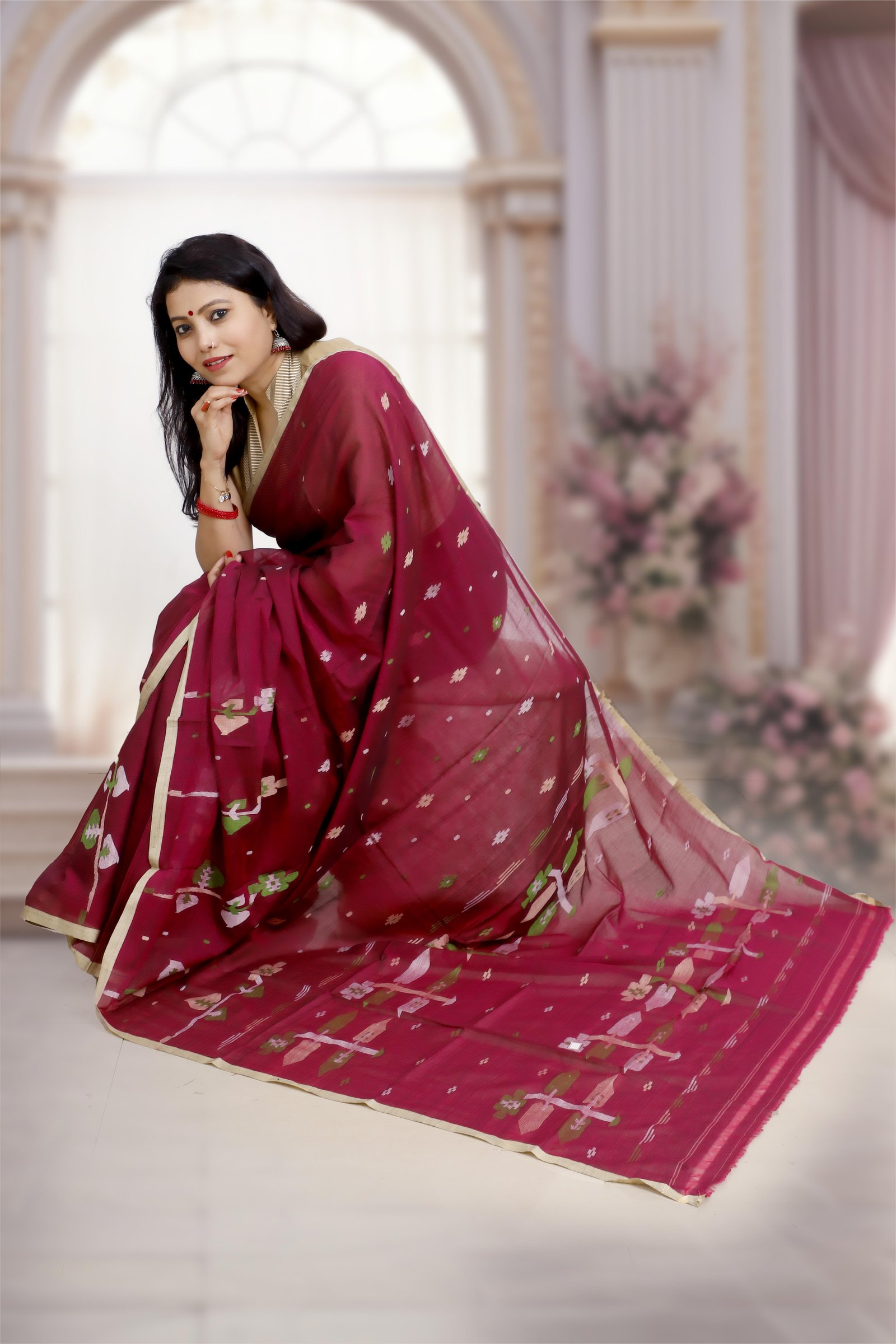 Crafted from premium quality pure cotton , this saree showcases the intricate beauty of handwoven Jamdani with fine needle work . The elegant Jamun Pink hue adds a touch of vibrance while keeping the look graceful and refined. Lightweight, breathable, and timeless, it is perfect for festive occasions and everyday elegance. Each piece is Silk Mark certified , ensuring authenticity and premium quality.