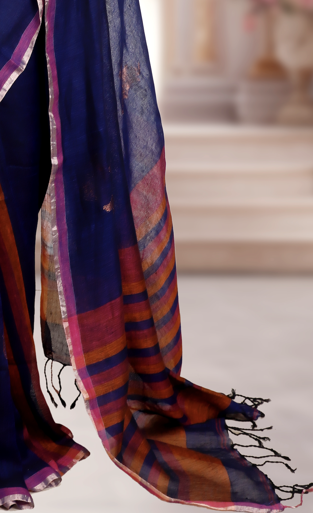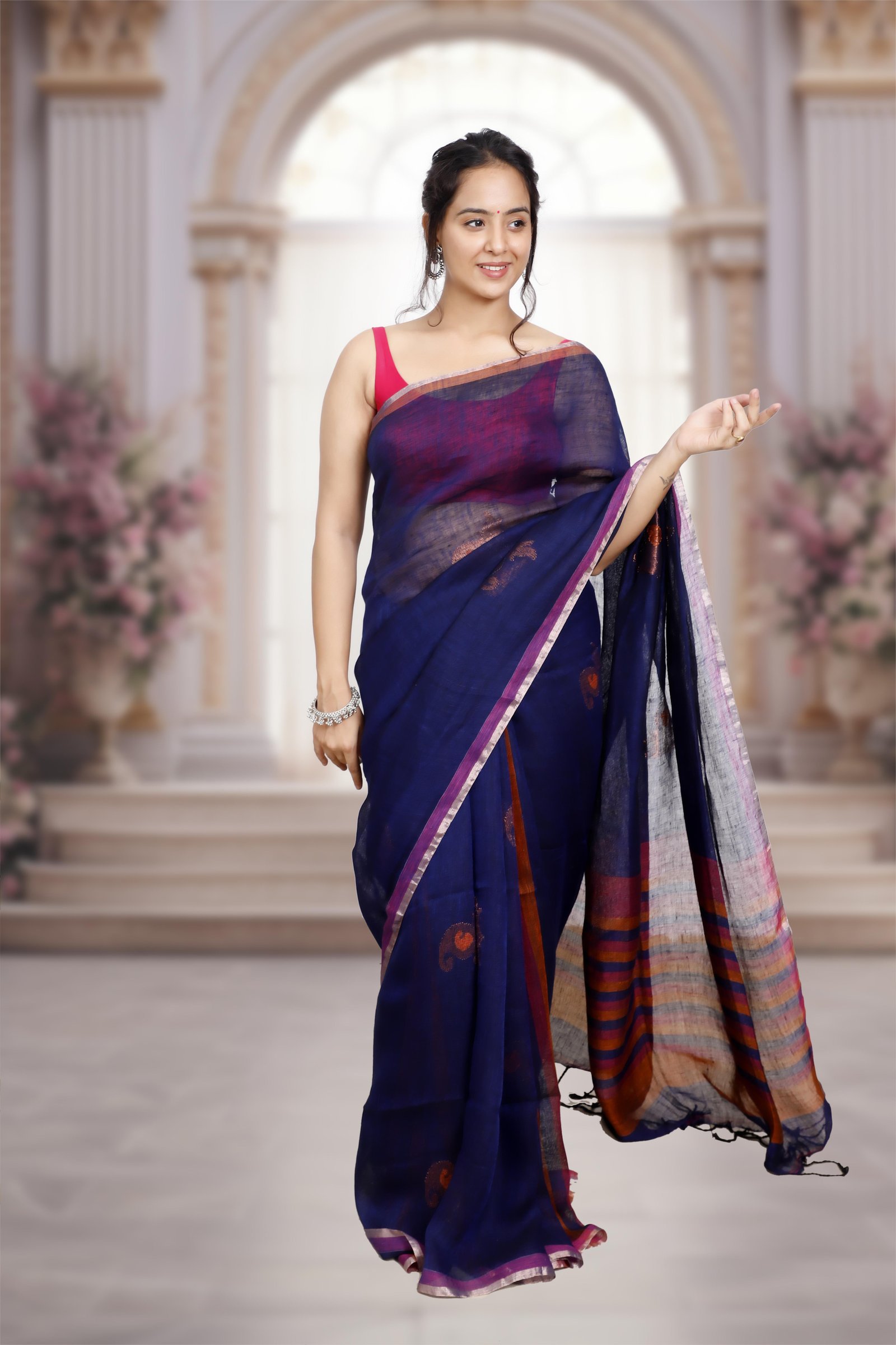 Woven in pure Bengal linen , this saree blends earthy elegance with vibrant charm. The gorgeous dark blue is beautifully enhanced with orange& pink accents , making it a perfect balance of tradition and contemporary style. Lightweight, breathable, and timelessly graceful.