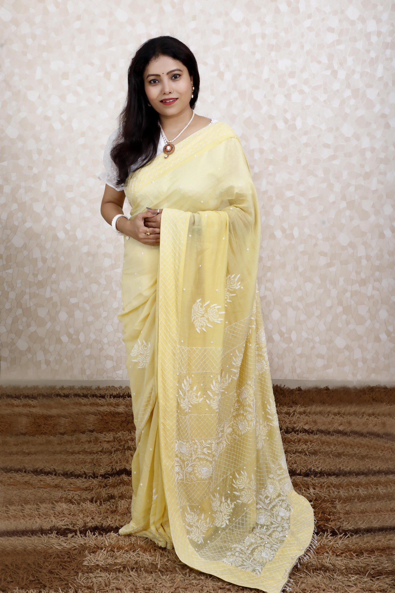 A vision of elegance and grace, this saree is crafted in pure Chanderi silk, featuring exquisite white chikankari thread work delicately embroidered across a radiant yellow base. Enhanced with beautiful hand embellishments, it reflects timeless craftsmanship and refined charm. Lightweight, sheer, and luxurious, it’s perfect for festive gatherings, celebrations, and elegant soirées.