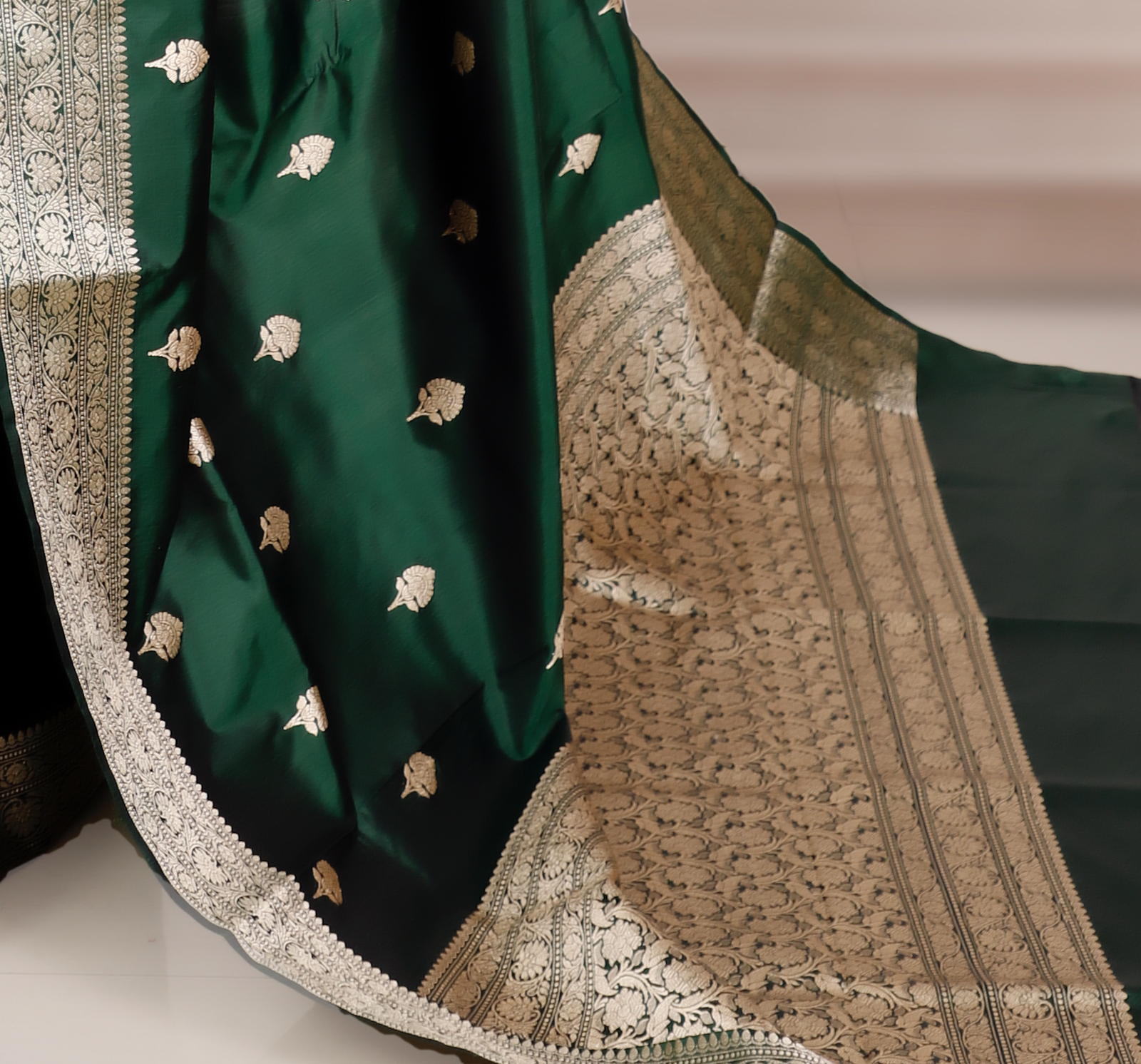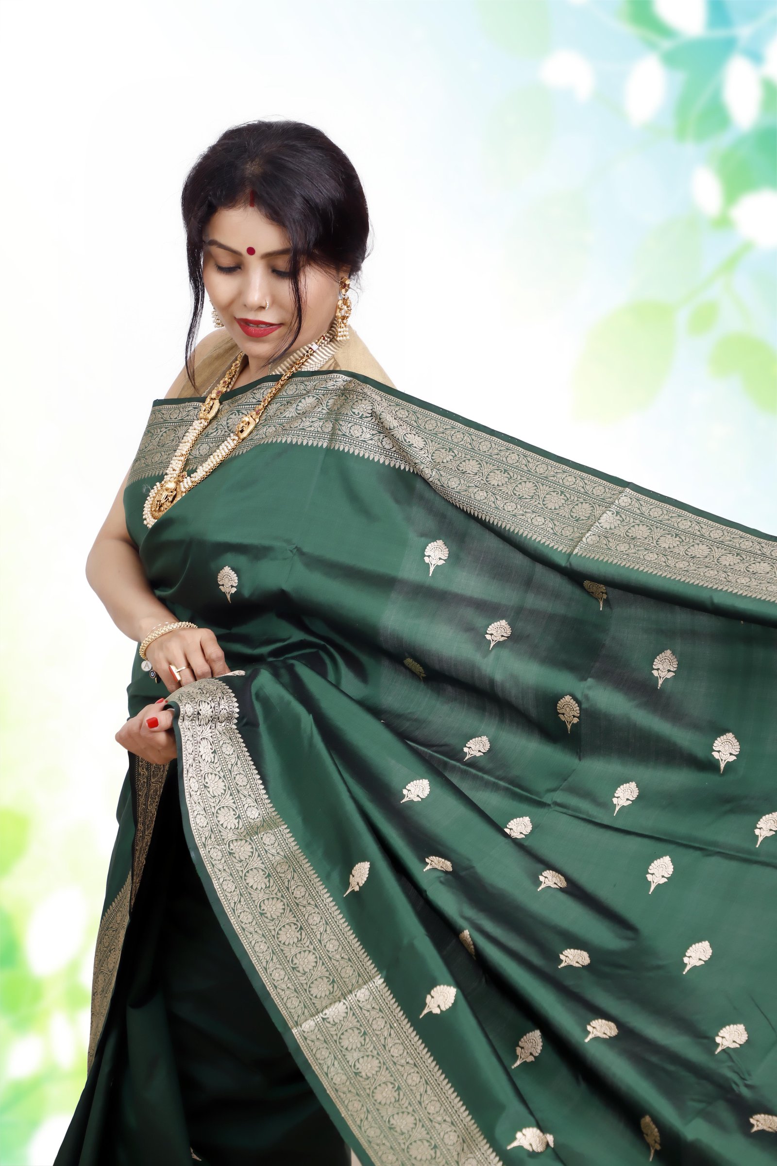 Pure Katan Silk Banarasi Handloom Saree with Kadhua Work – Bottle Green