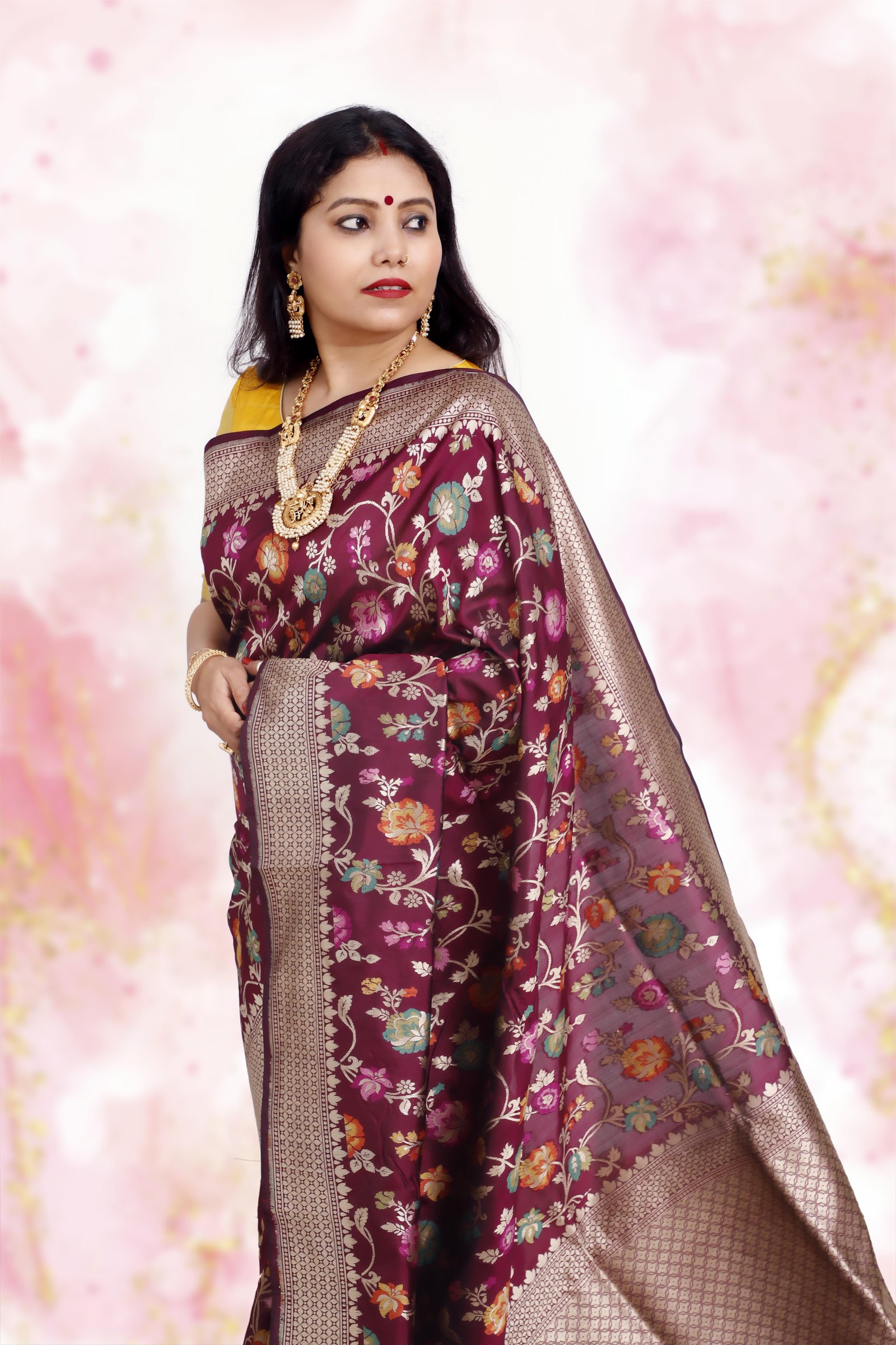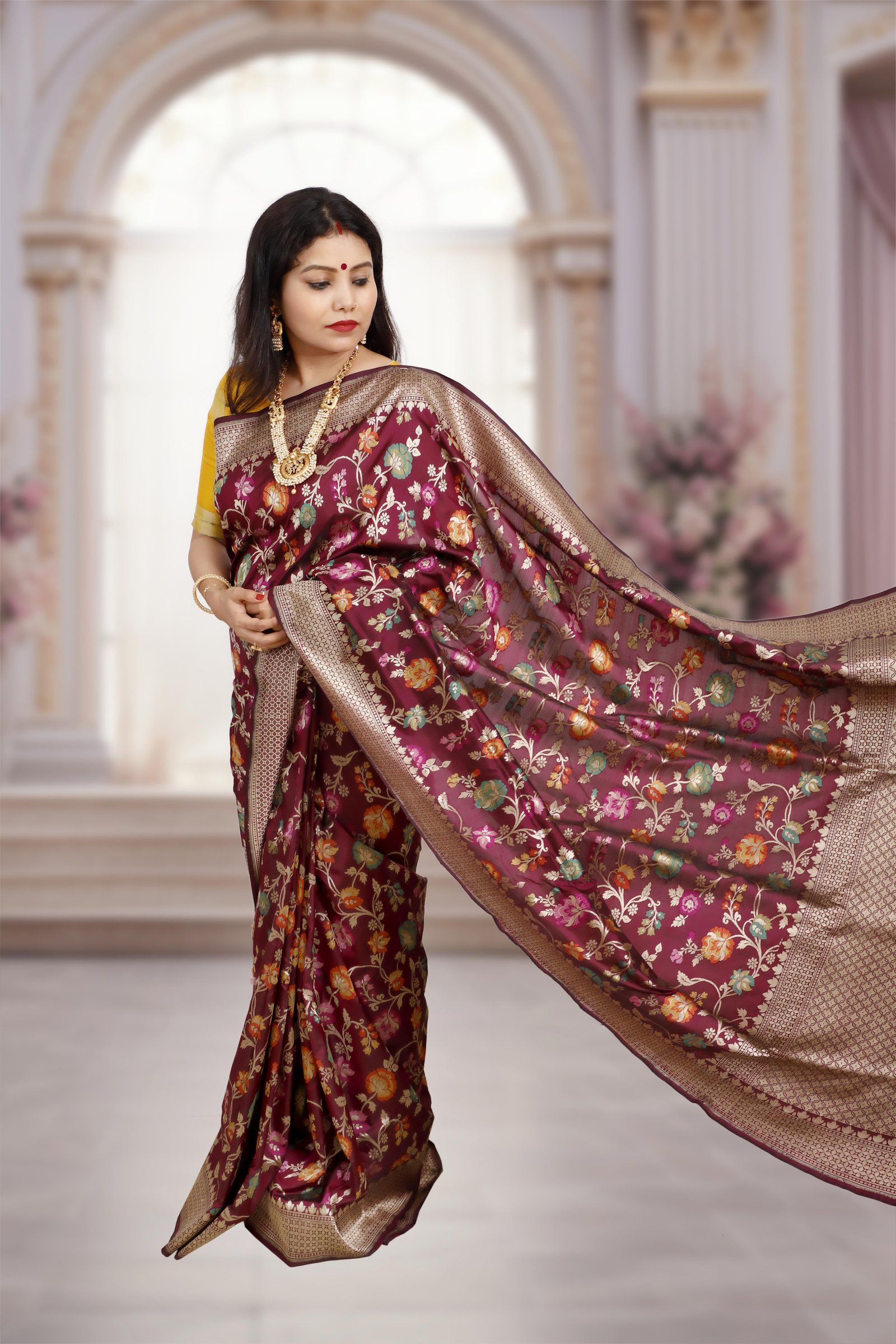 An exquisite blend of two timeless crafts, this saree is woven in pure Katan silk with the intricate beauty of handwoven Jamdani floral motifs. Lightweight yet lustrous, it combines the grandeur of Banarasi weaving with the delicacy of Jamdani artistry. A perfect drape for weddings, festive occasions, and heirloom collections. Each saree is Silk Mark certified and carries the Handloom Mark, assuring authenticity and premium craftsmanship