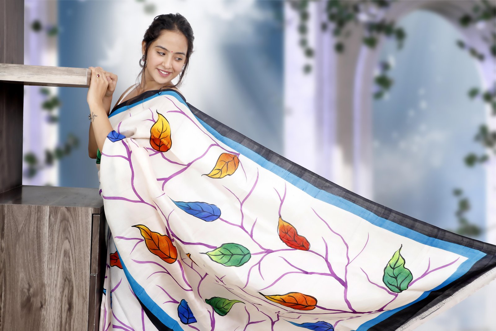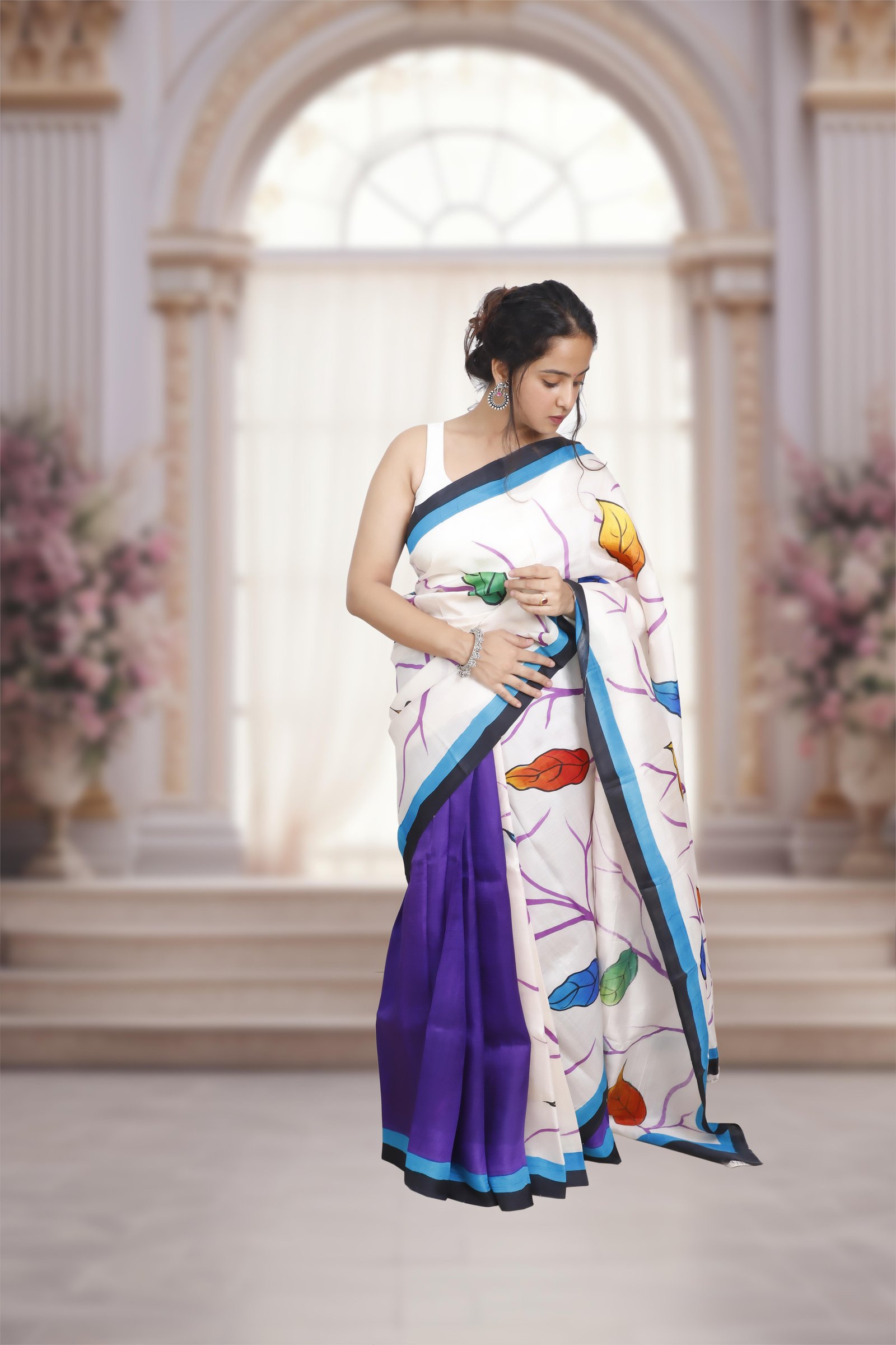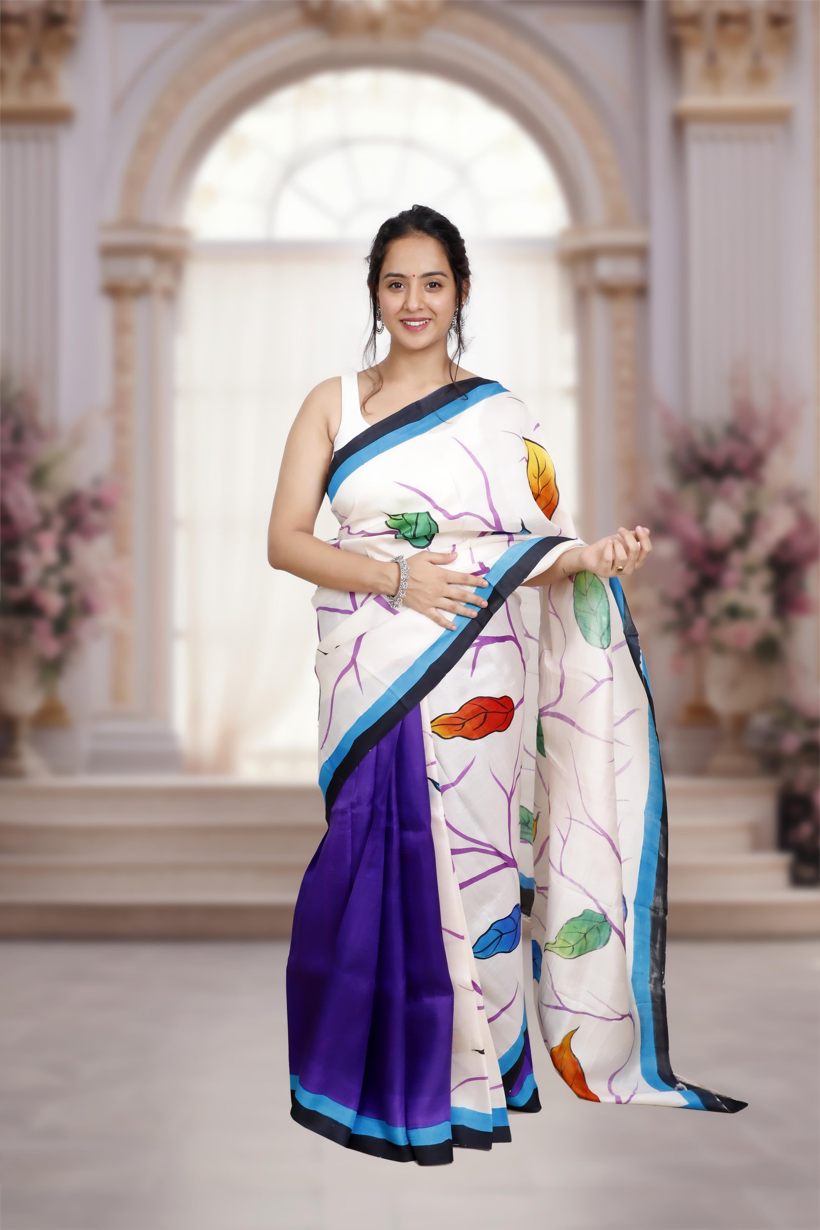 A true work of art, this saree is crafted from pure Murshidabad silk and adorned with exquisite hand-painted designs that reflect timeless craftsmanship. Lightweight, lustrous, and elegant, it carries the assurance of authenticity, each saree comes with a Silk Mark certification . Perfect for those who value tradition, artistry, and genuine luxury.