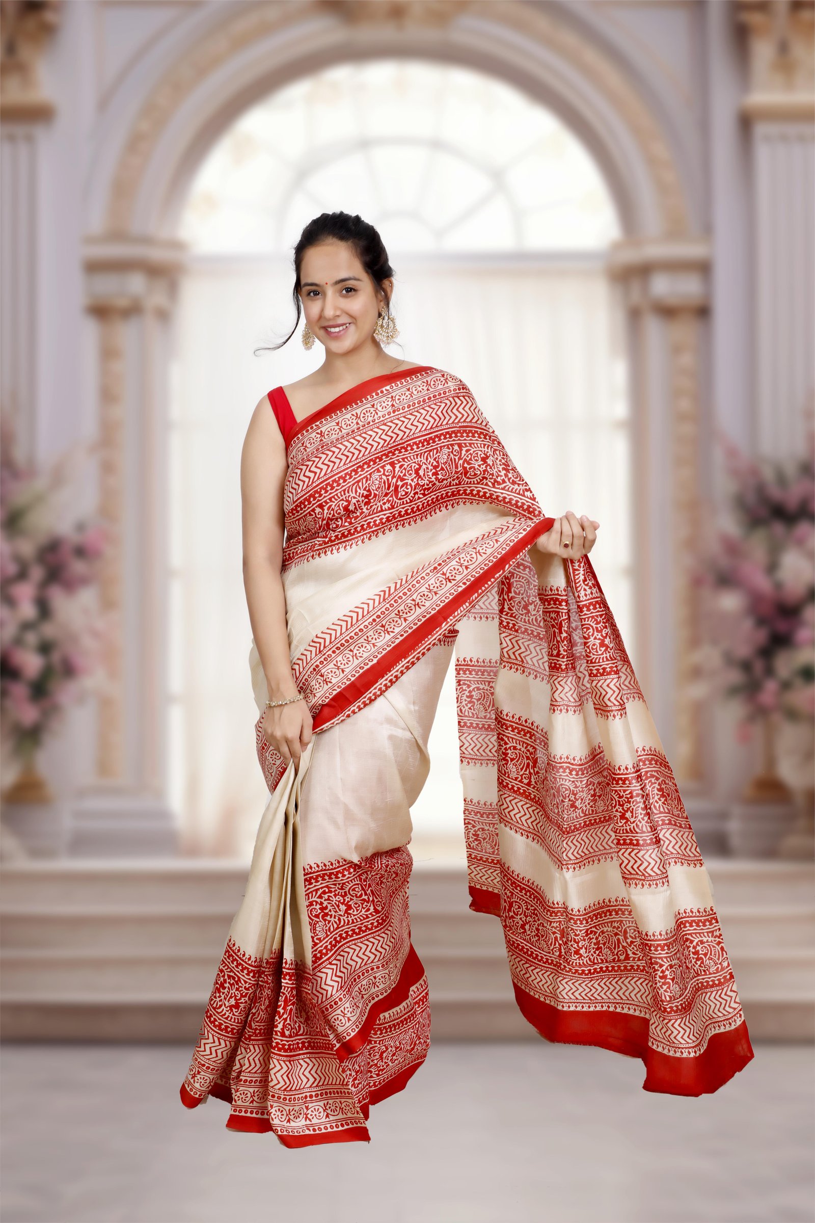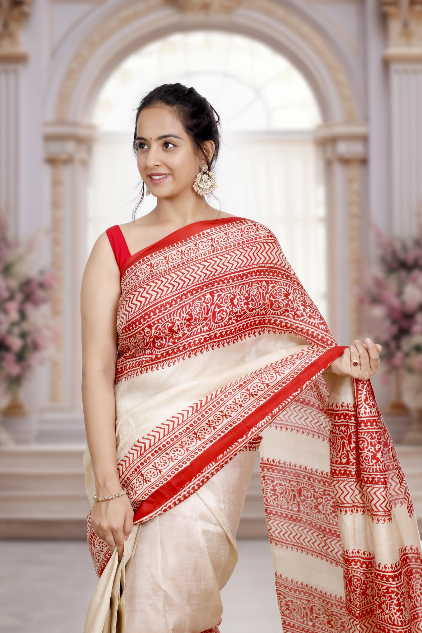 Crafted in pure Murshidabad silk , this saree features a graceful hand-block design that adds a touch of artisanal elegance. The off-white base with striking red accents creates a timeless and sophisticated look. Each saree comes with a Silk Mark certification , ensuring authenticity and premium quality.