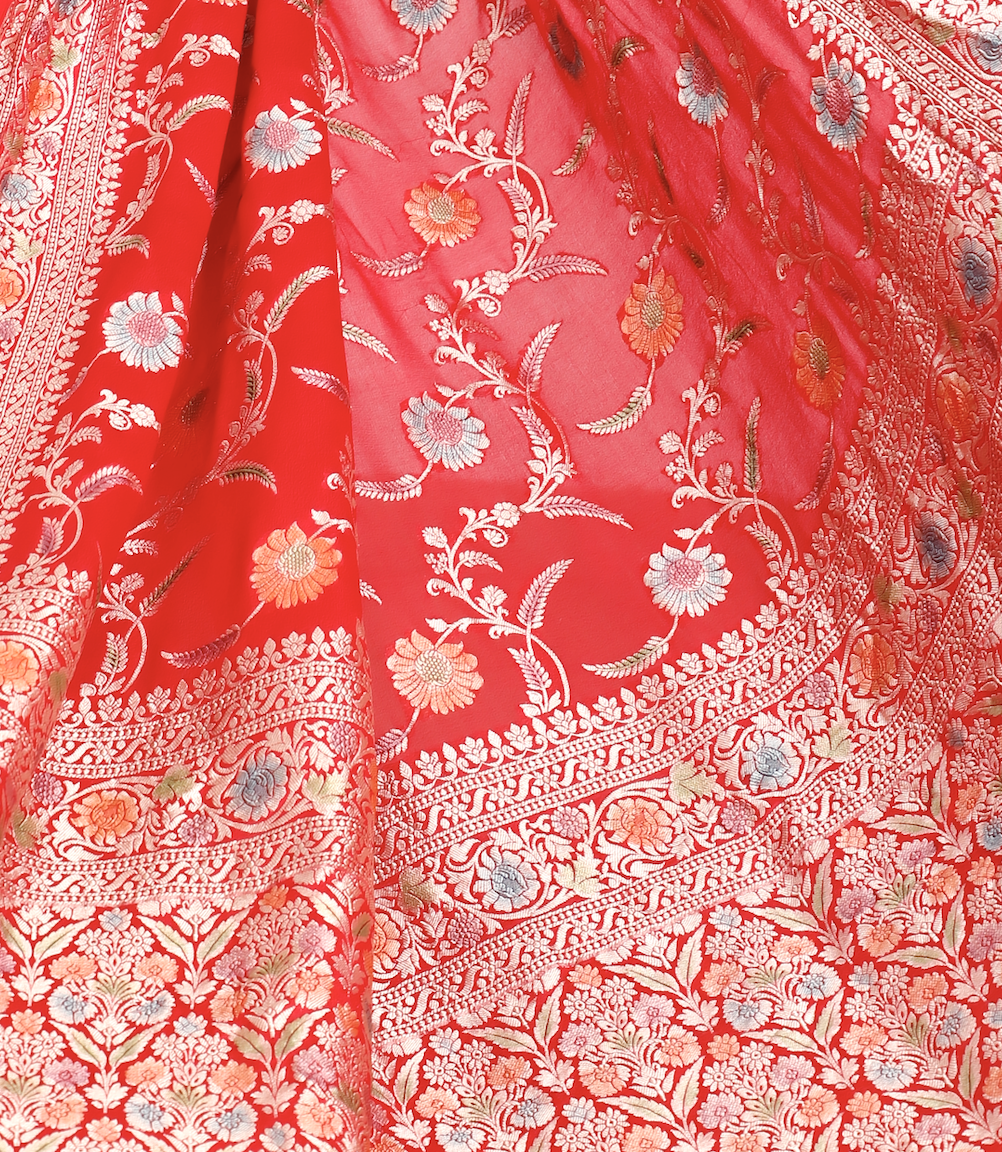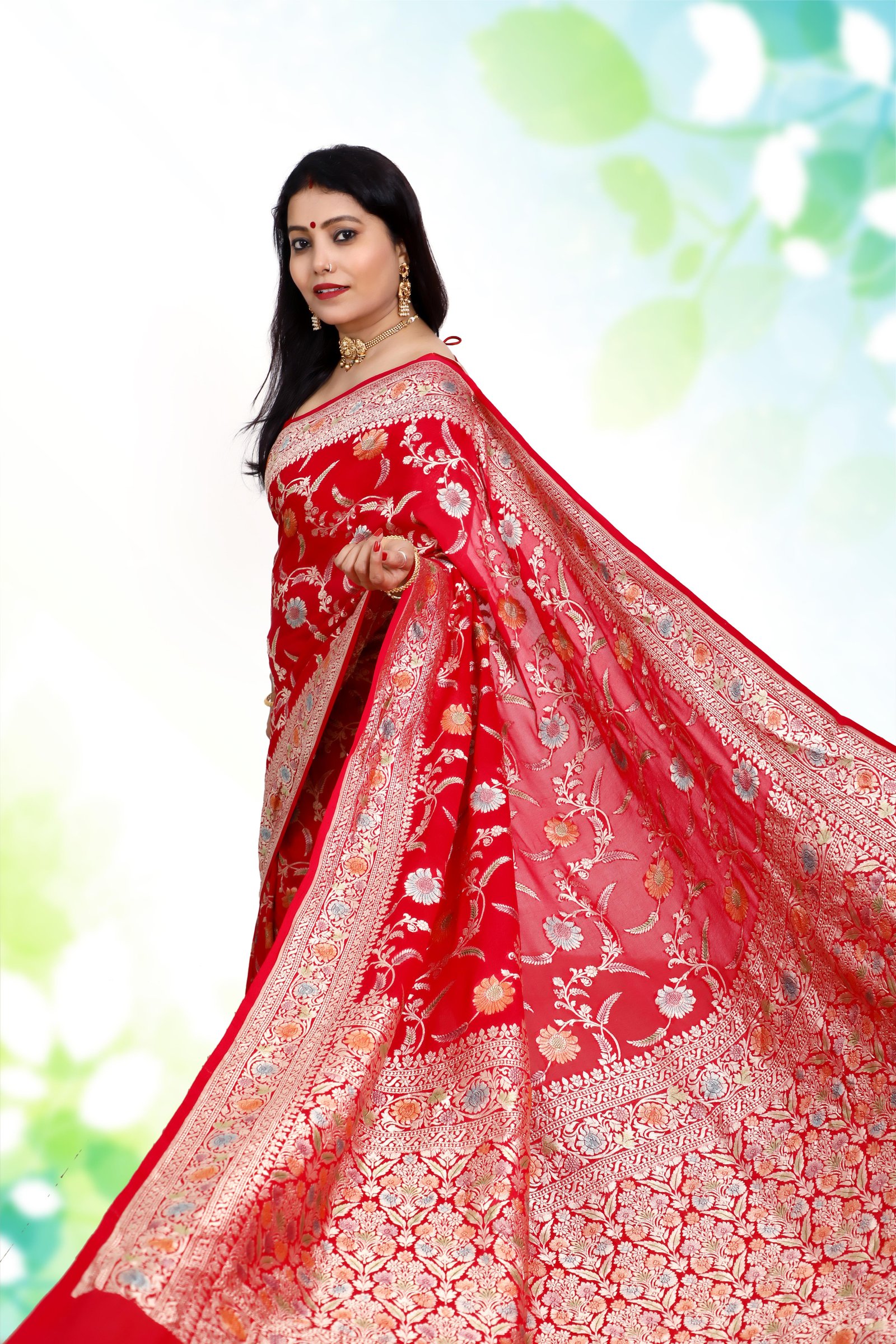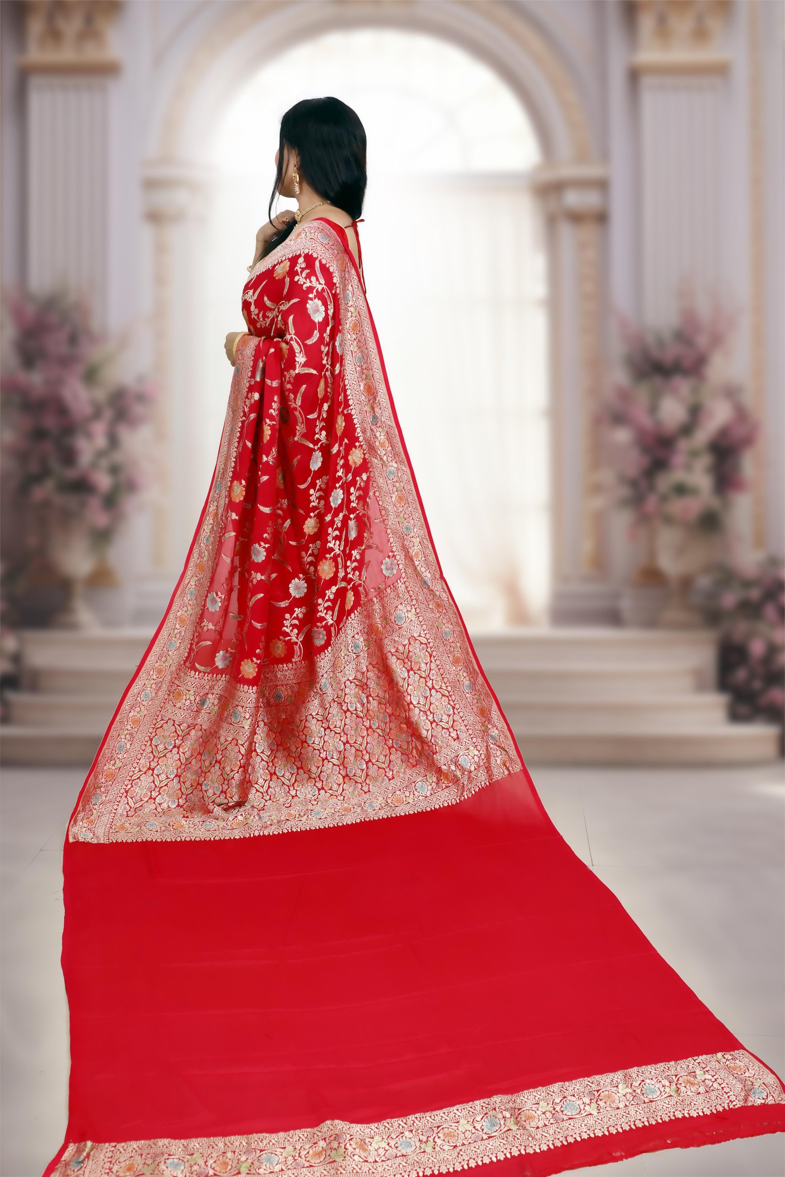 A true Banarasi masterpiece, this saree is crafted in pure Khaddi silk, adorned with an all-over Meenakari Jaal showcasing intricate handloom artistry. The rich red hue enhances its regal appeal, making it an ideal choice for weddings, festive occasions, and heirloom collections. Each saree is Silk Mark certified and carries the Handloom Mark, ensuring authenticity, heritage, and premium craftsmanship