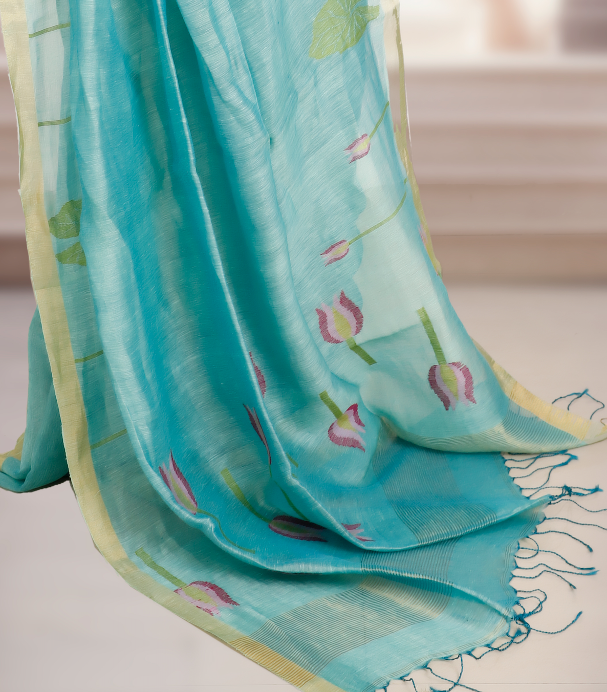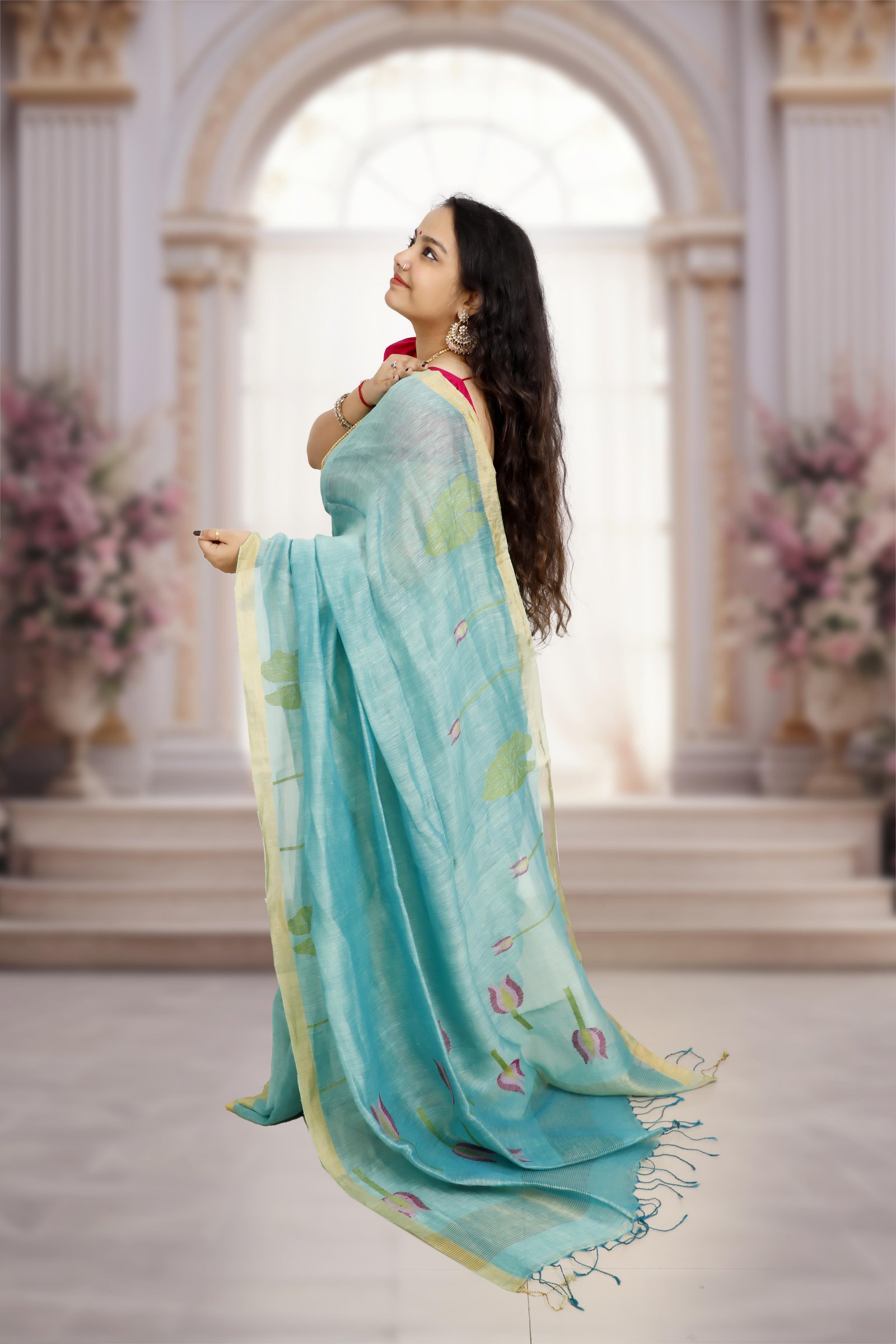 Woven in a luxurious silk-linen blend, this saree highlights the timeless artistry of handwoven Jamdani motifs. The fresh teal blue base is beautifully complemented by the gold zari border, adding a regal charm to its elegance. Each saree is Handloom Mark certified, assuring authenticity, premium quality, and heritage craftsmanship.