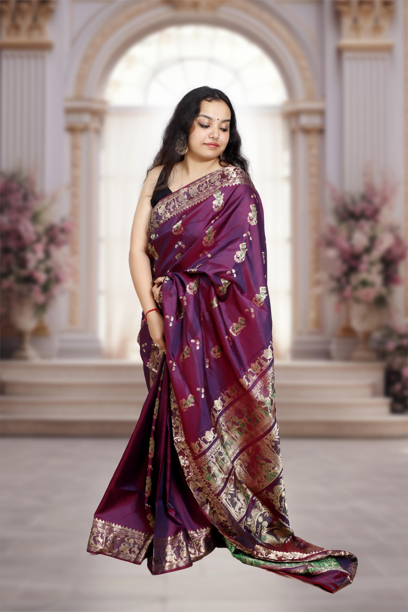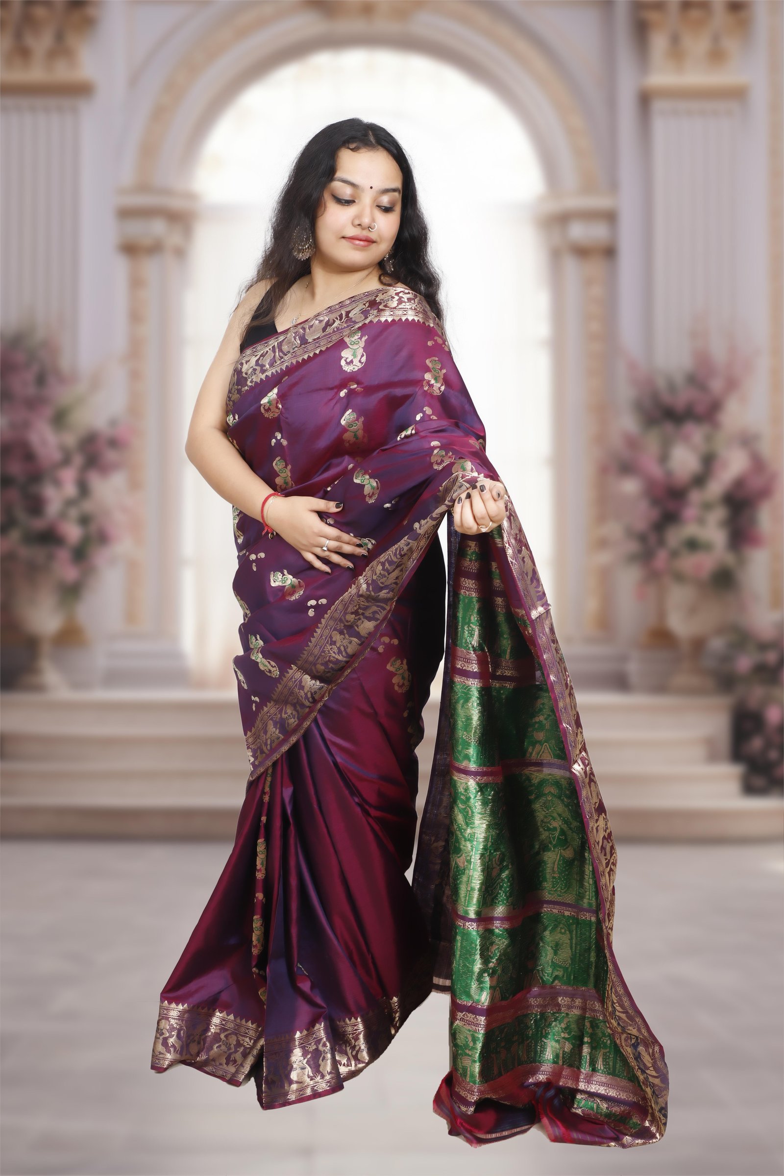 Handcrafted from premium Pure silk, this exquisite Swarnachari saree celebrates Bengal’s rich cultural heritage with its intricate gold zari and minakari work. The rich purple hue adds a regal touch, making it perfect for weddings, festive occasions, and special celebrations. Each piece comes with a Silk Mark certification, ensuring authenticity and premium quality.