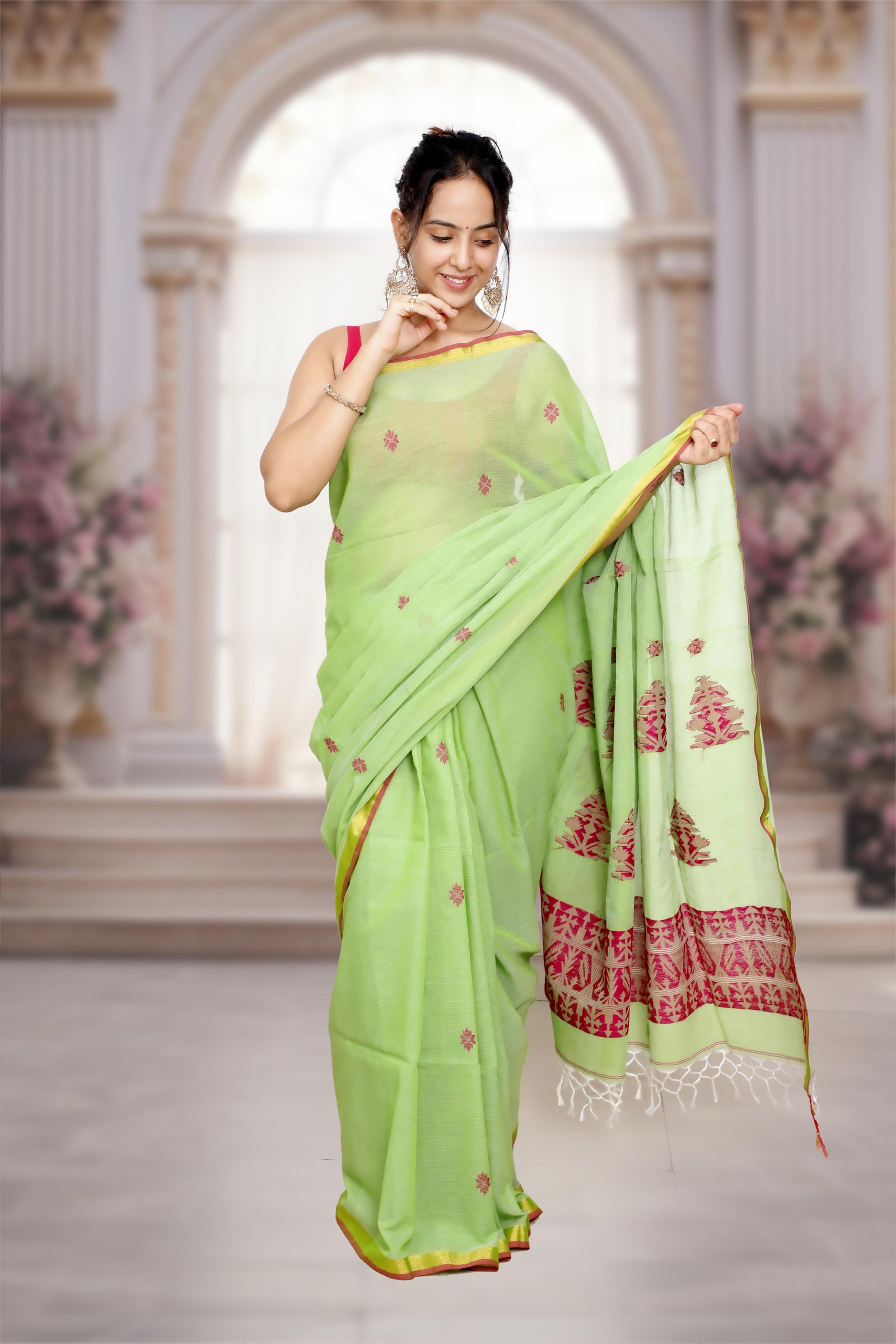 Handwoven Pure Bengal Cotton Saree with Jacquard Pallu – Pista Green
