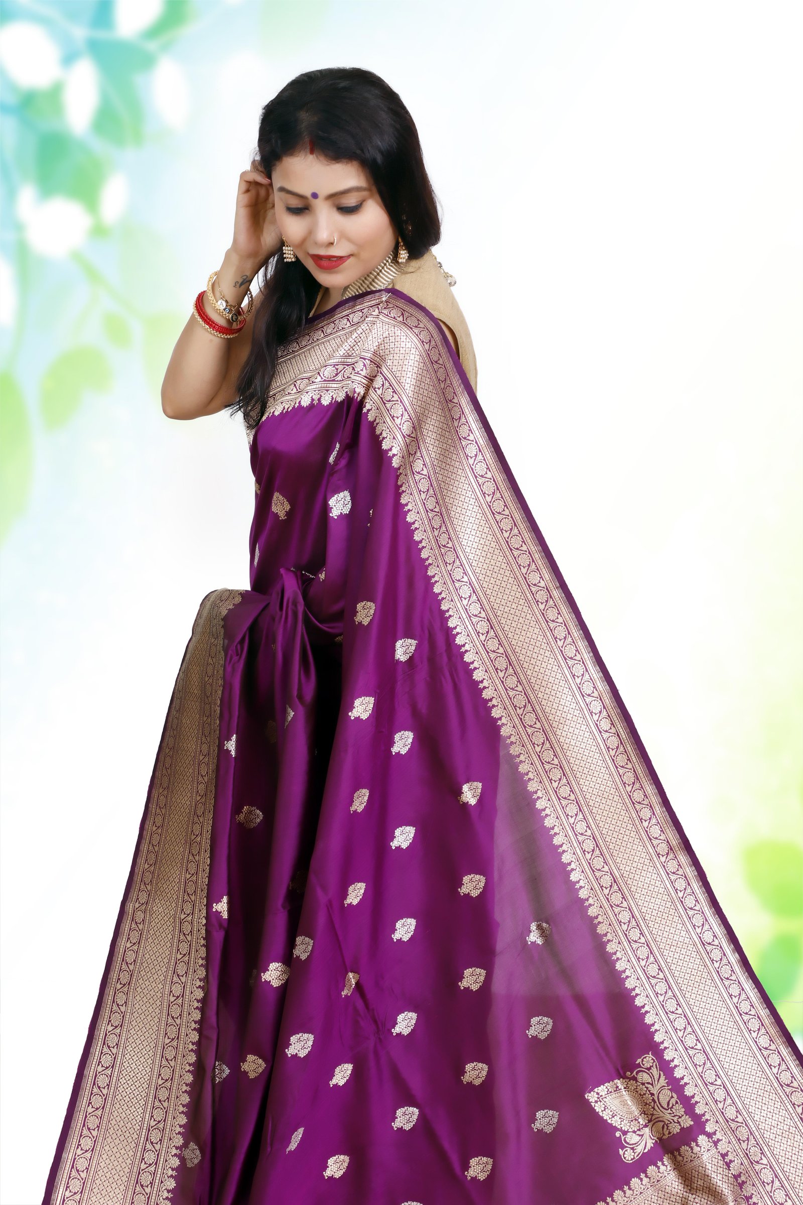 Crafted from pure handwoven Katan Mulberry silk, this saree is adorned with intricate gold and silver Kadwa weaving, a hallmark of Banarasi artistry. The deep purple base enhances its regal elegance, making it an heirloom-worthy drape for weddings, festive occasions, and grand celebrations. Each saree is Silk Mark certified and carries the Handloom Mark, ensuring authenticity, heritage, and premium craftsmanship.