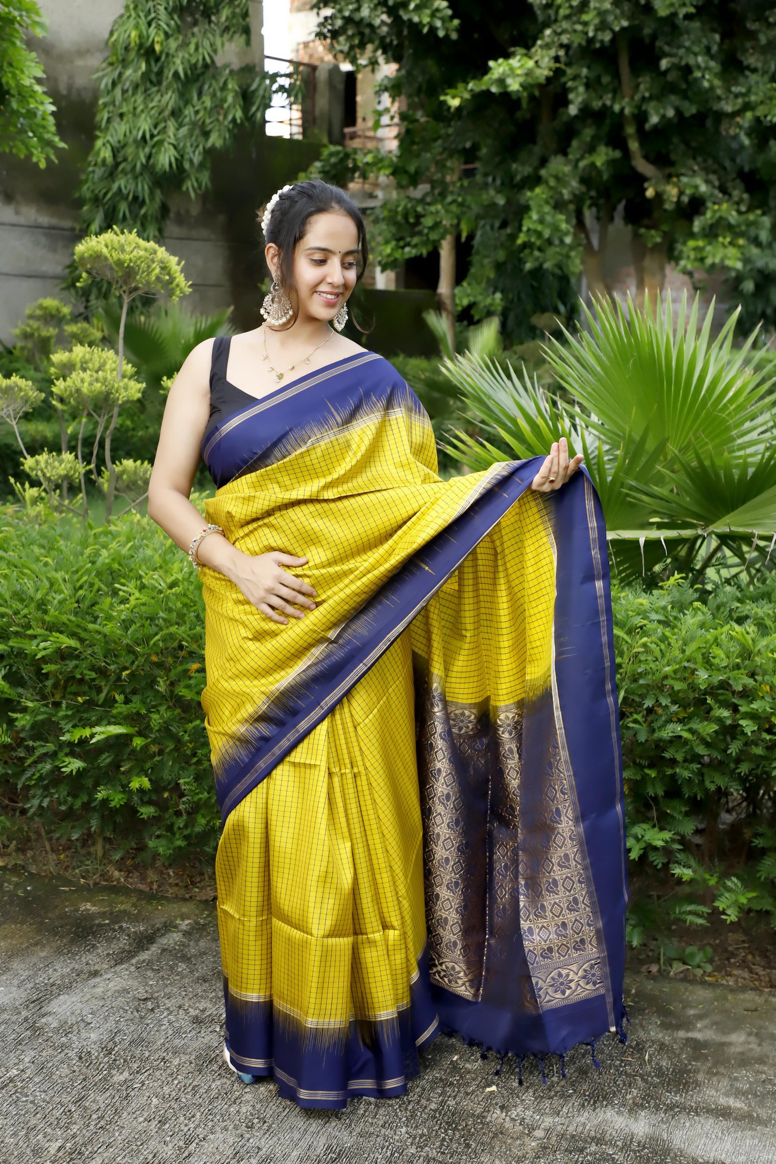 A celebration of South Indian heritage, this saree is woven in pure mulberry silk, featuring a vibrant yellow base contrasted with a rich dark blue border and pallu. Renowned for its lustrous texture and durable weave, it is perfect for weddings, festive occasions, and special celebrations. Each saree is Silk Mark certified, ensuring authenticity, premium quality, and traditional craftsmanship.