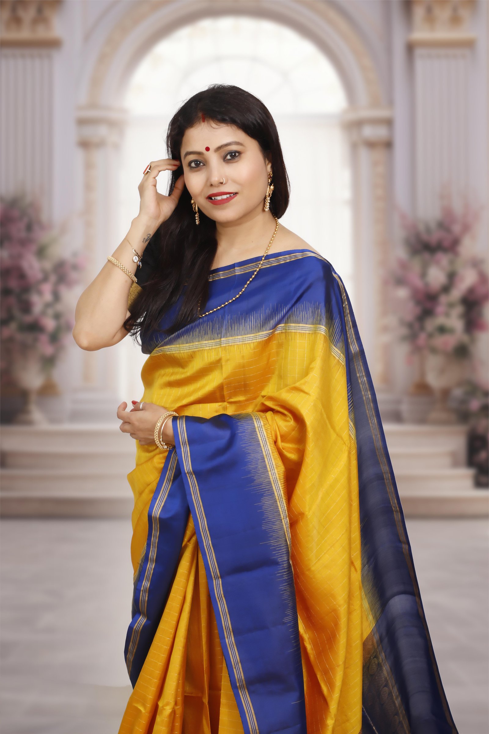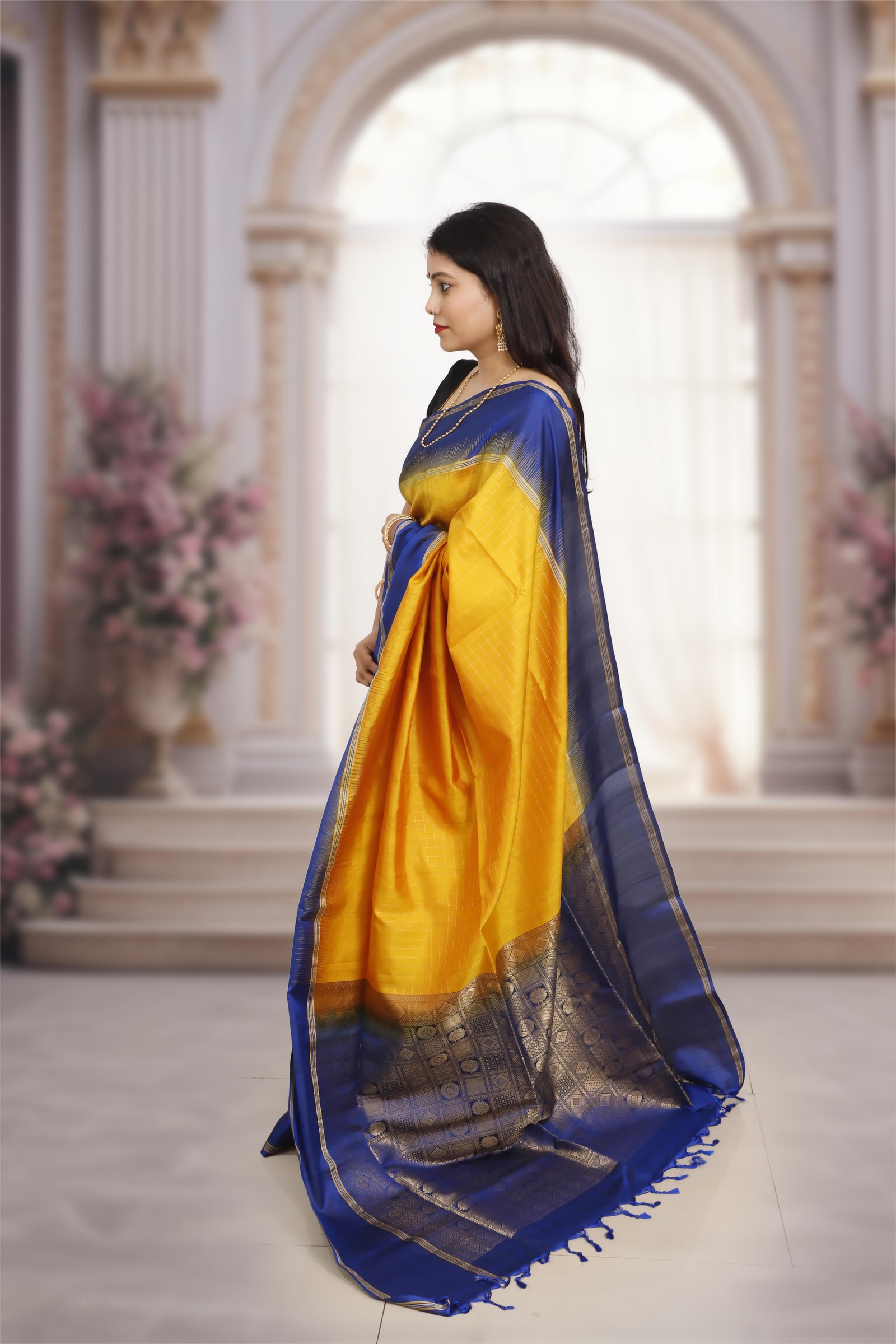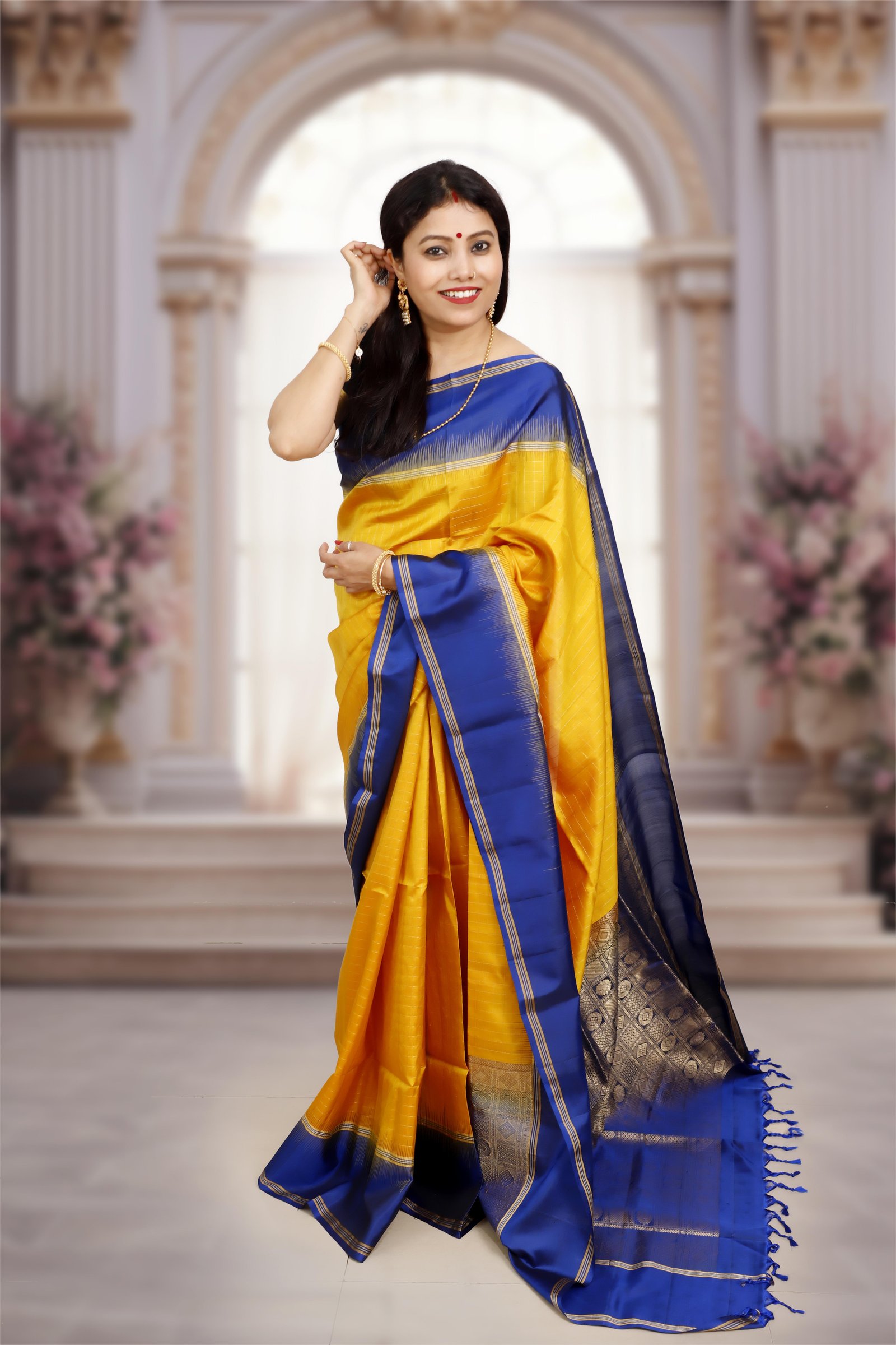 An elegant Kanchipuram classic, this saree is woven in pure handwoven silk, featuring a bright yellow base contrasted with a deep dark blue border. The rich golden zari detailing on the border and pallu adds a regal touch, making it perfect for weddings, festive occasions, and heirloom collections. Certified with the Silk Mark, it assures authenticity and the timeless craftsmanship of Kanchipuram weavers.