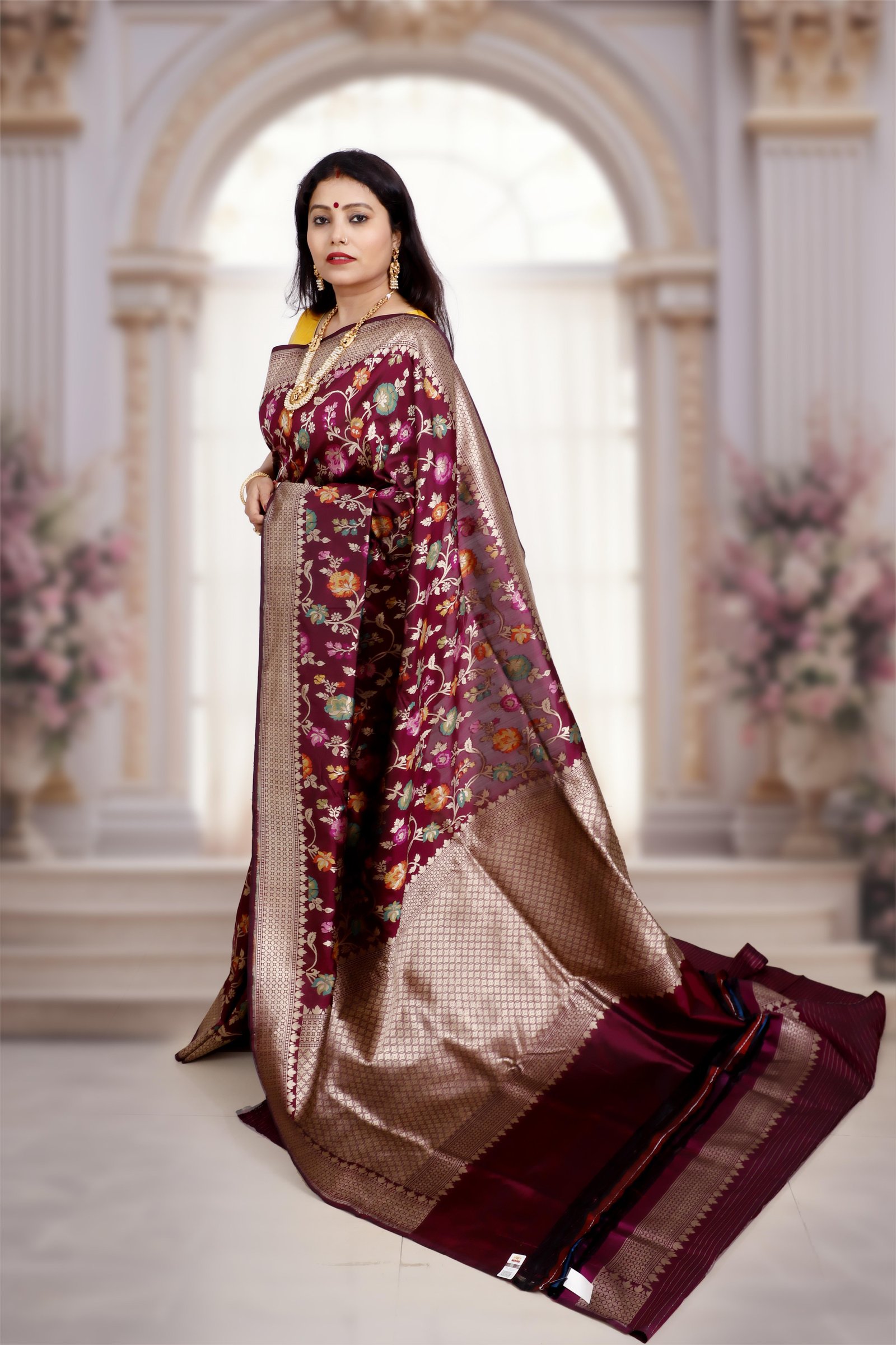 An exquisite blend of two timeless crafts, this saree is woven in pure Katan silk with the intricate beauty of handwoven Jamdani floral motifs. Lightweight yet lustrous, it combines the grandeur of Banarasi weaving with the delicacy of Jamdani artistry. A perfect drape for weddings, festive occasions, and heirloom collections. Each saree is Silk Mark certified and carries the Handloom Mark, assuring authenticity and premium craftsmanship